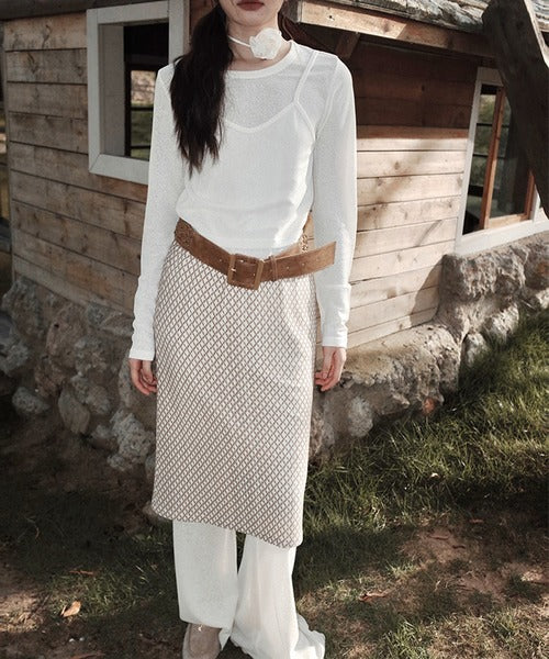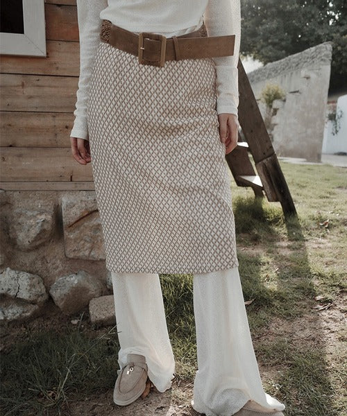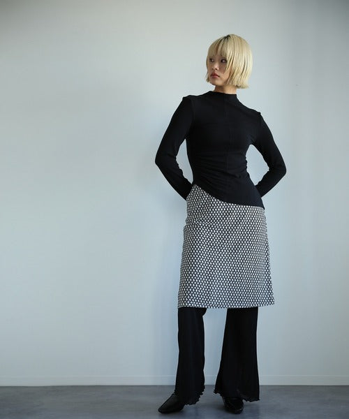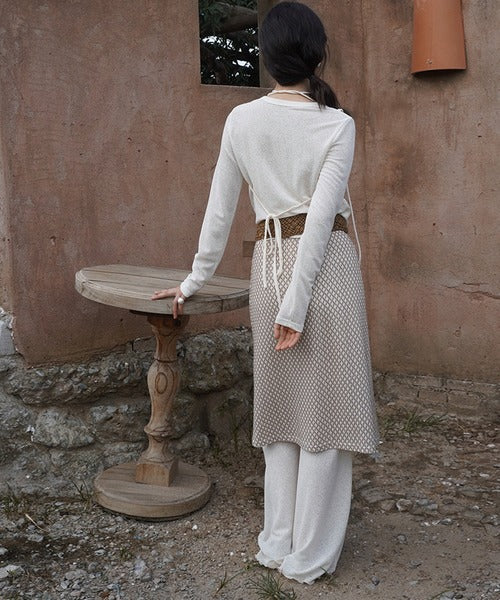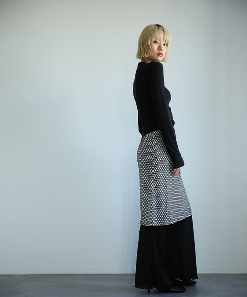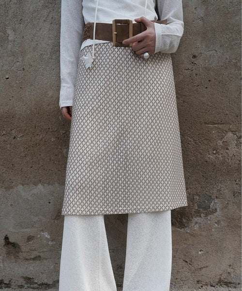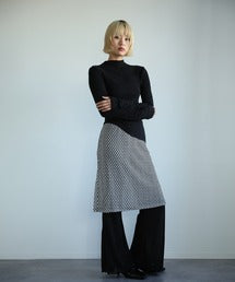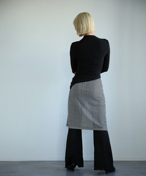 ひざ下丈の上品なスカートと軽やかなワイドパンツの組み合わせがエレガントな1着。