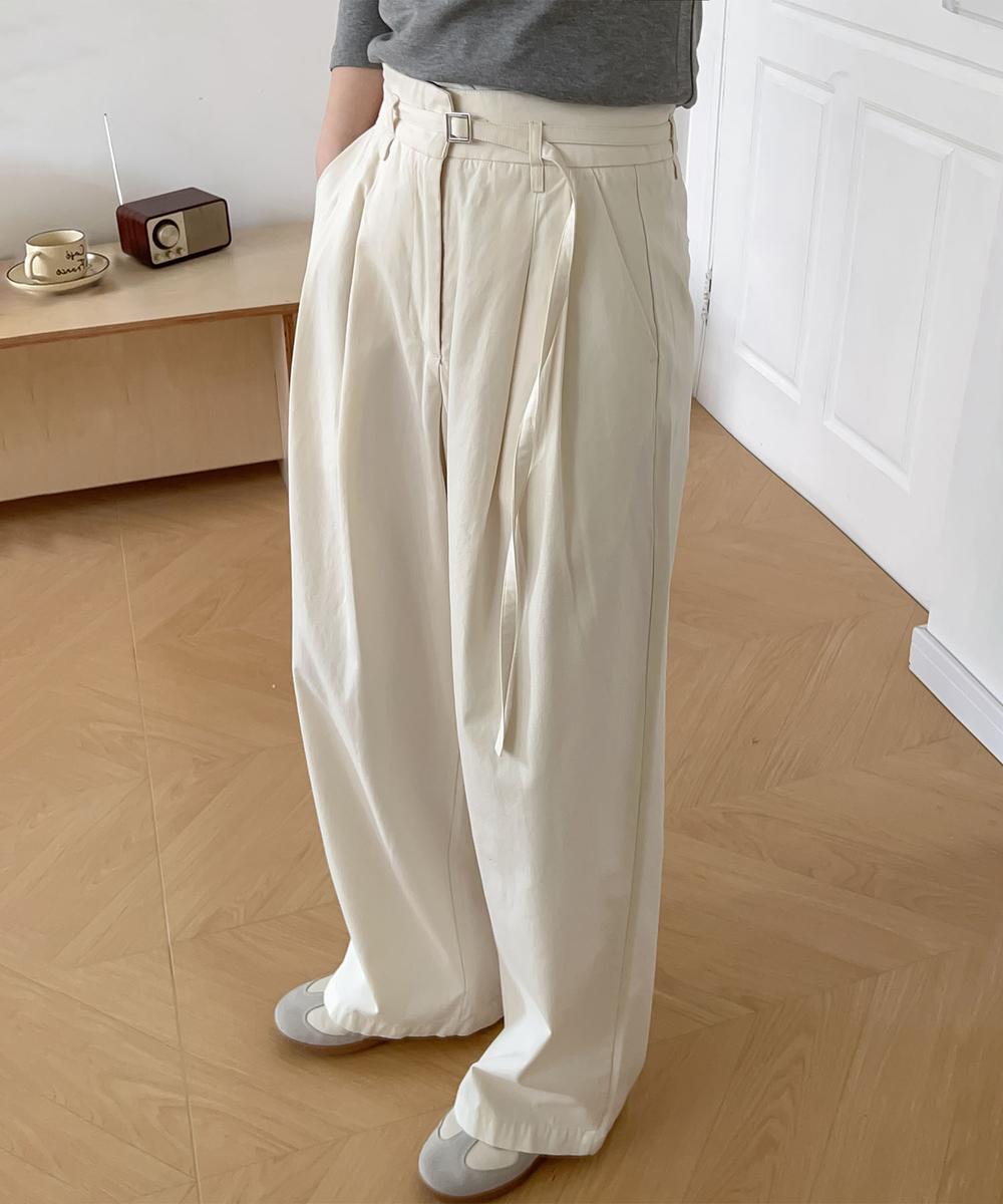 ベルト付きタックワイドパンツ。ゆったりとしたシルエットで動きやすさも抜群。ウエスト部分のベルトと隠しボタンがポイントです。