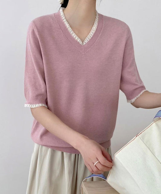 Vネック半袖ニットトップス