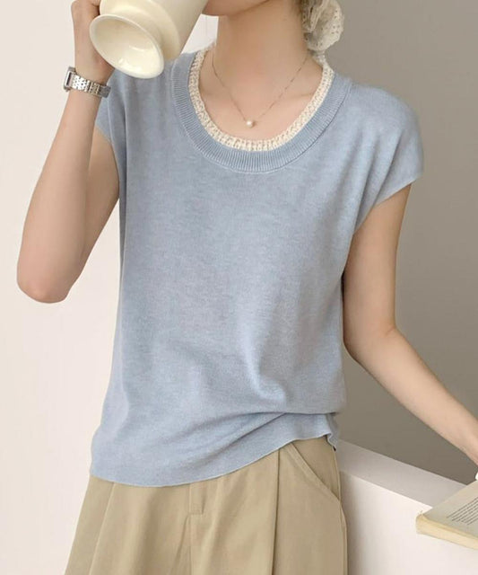 SALEかぎ編み風ネックライン半袖ニットトップス