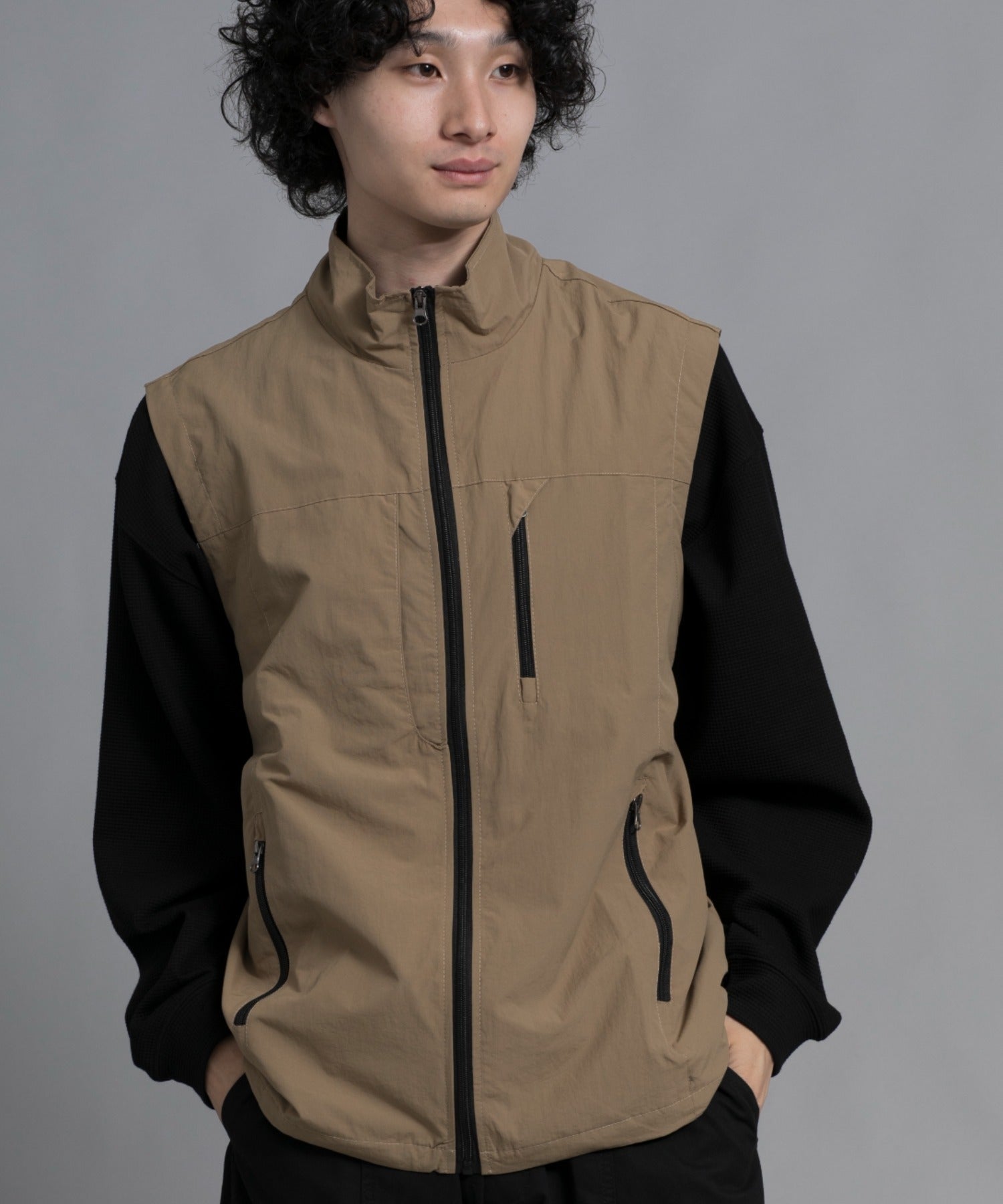肌寒くなってきた秋におすすめのアイテム、スタンドネックベスト。裾は絞ることができるので、お好みのシルエットに調節が可能。オーバーサイズのフード付きパーカーと相性抜群。ボトムスはデニムパンツやカーゴパンツなどと合わせたカジュアルやストリートスタイルはもちろん、スラックスを合わせた落ち着いたスタイルにも。ポケットが多数ついているので、アウトドアにもおすすめです。