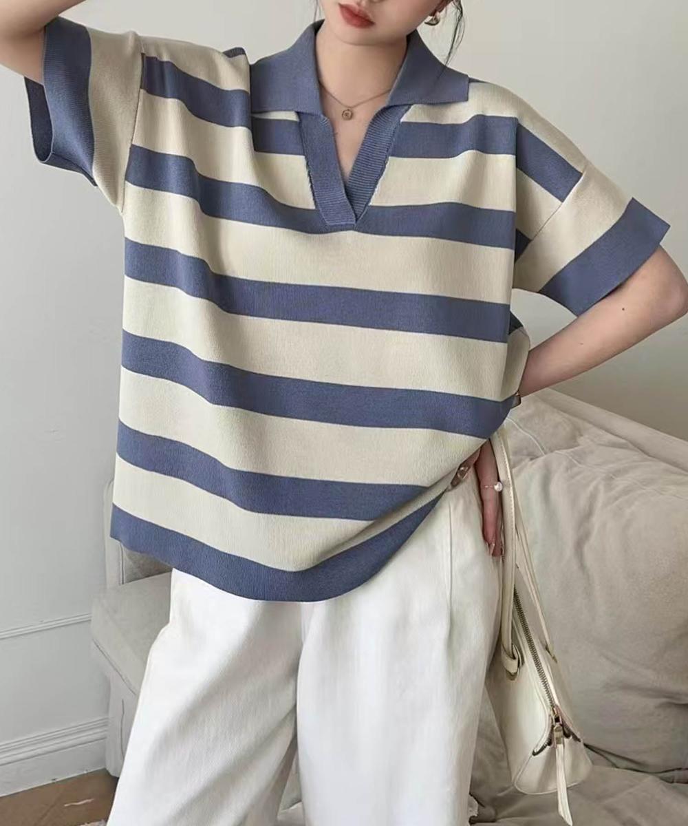 【aimoha】ワイドボーダー襟付きVネックトップス