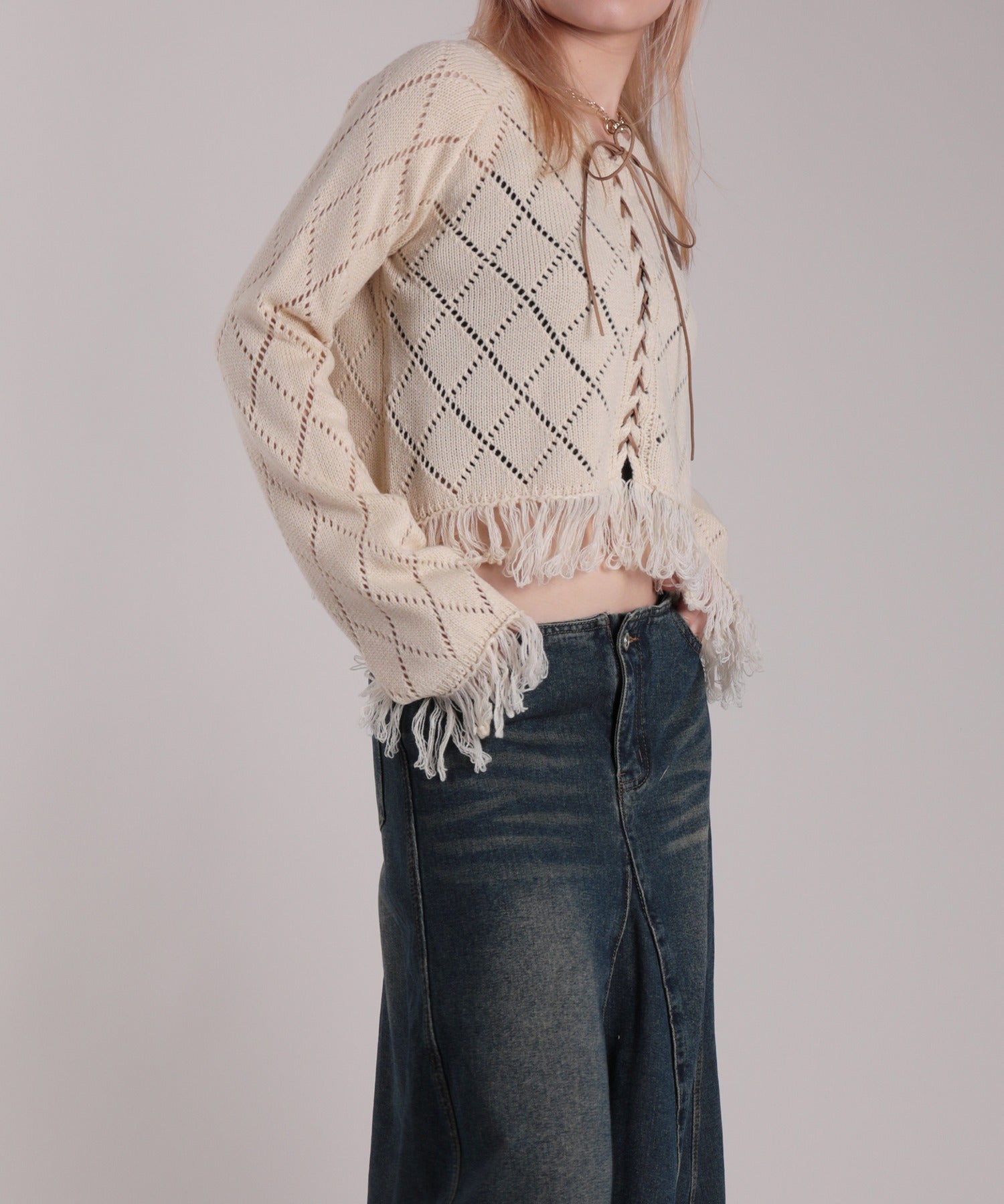 【HOOK】for girls 裾フリンジ透かし編み編み上げカーディガン
