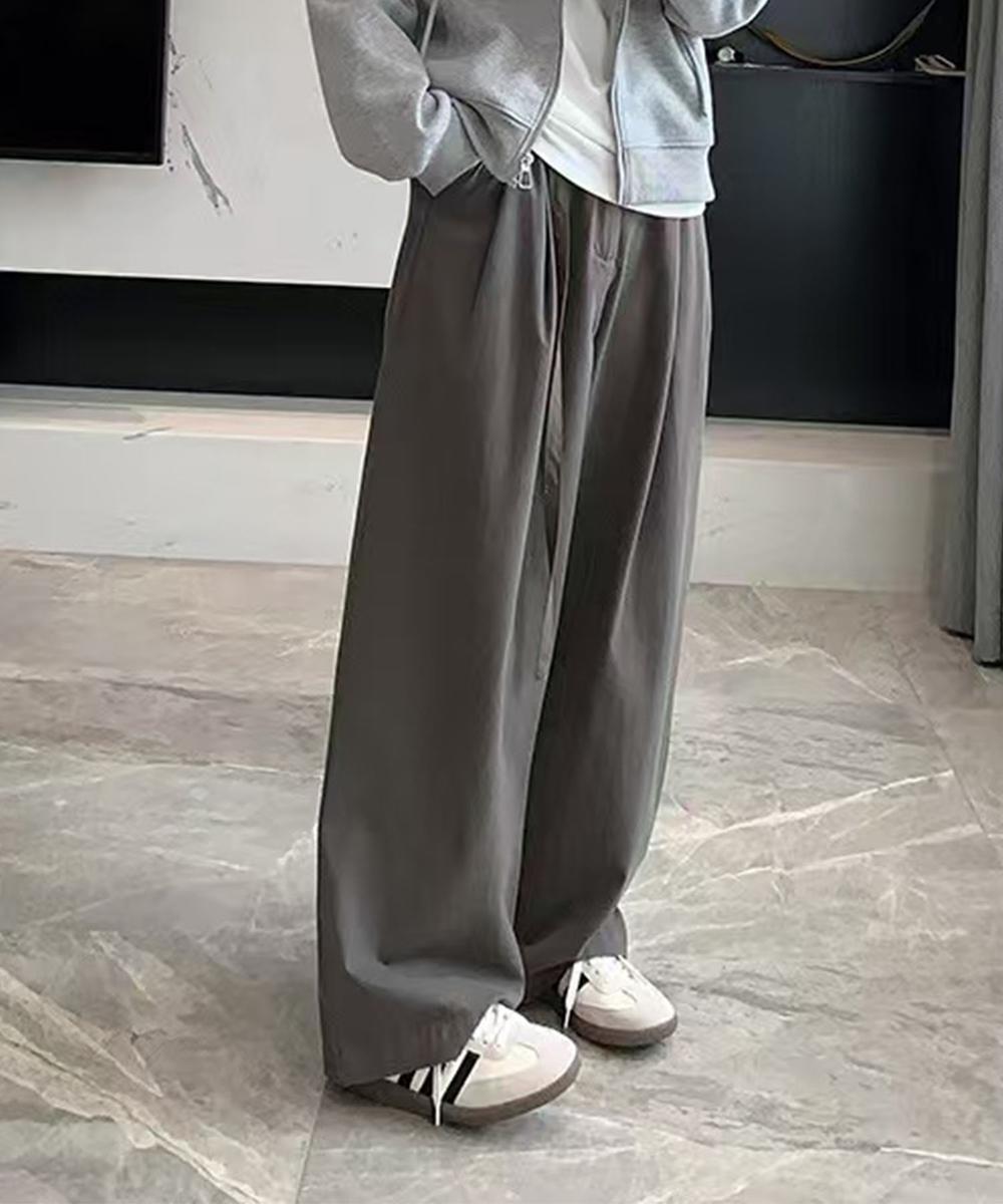 ベルト付きタックワイドパンツ。ゆったりとしたシルエットで動きやすさも抜群。ウエスト部分のベルトと隠しボタンがポイントです。