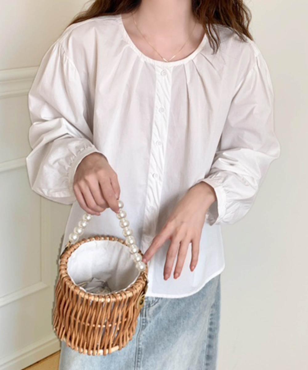 柔らかなギャザーとラウンドネックデザインが特徴のブラウス。綿100%で柔らかな肌触りと通気性に優れており、軽やかな着心地で春夏にぴったりな一枚です。