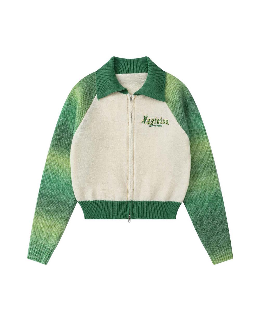 鮮やかなグラデーションとラグランスリーブが目を引く、ポロ襟のWジップカーディガン。