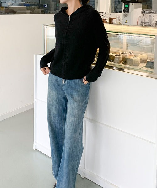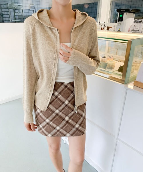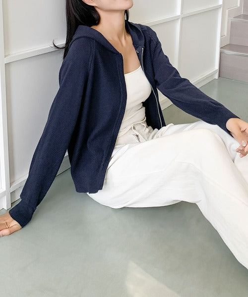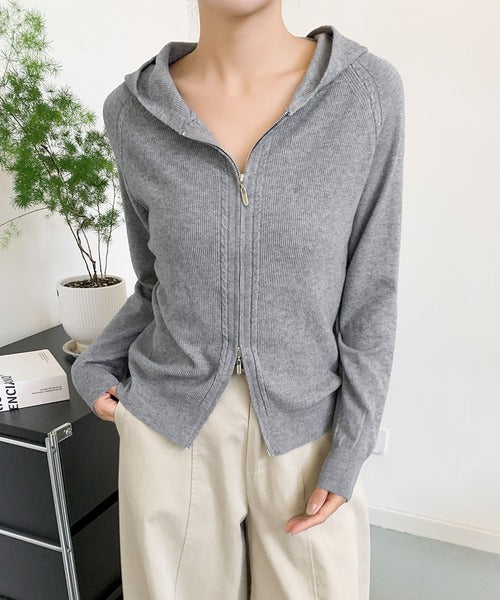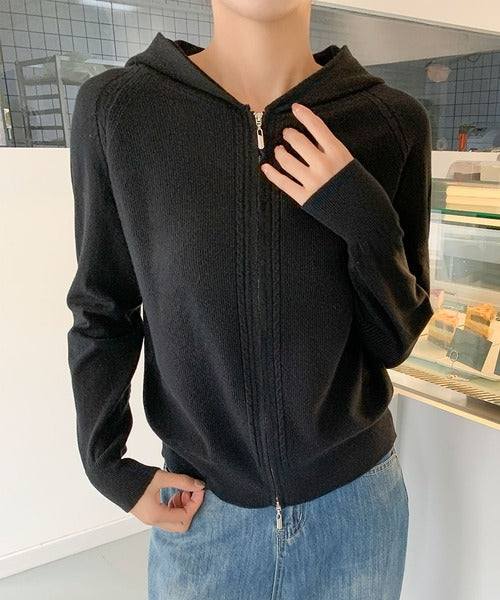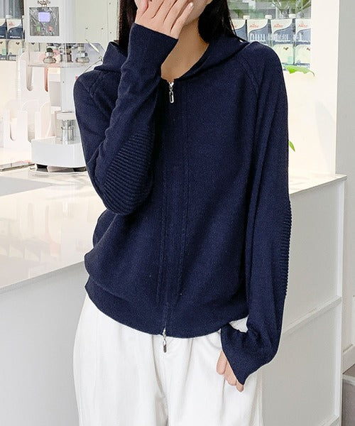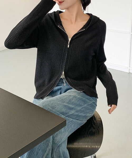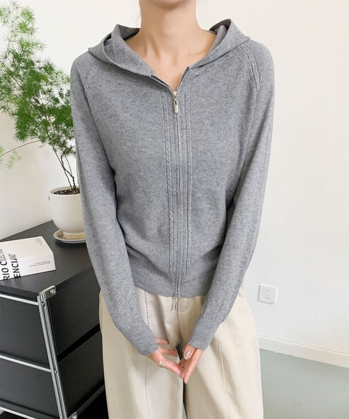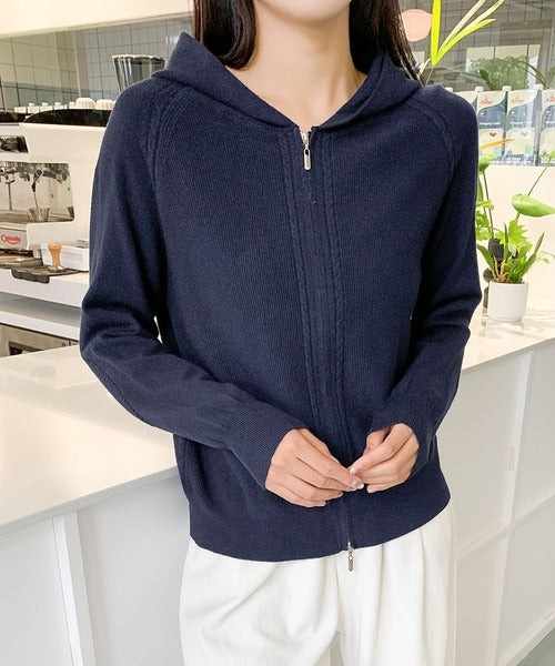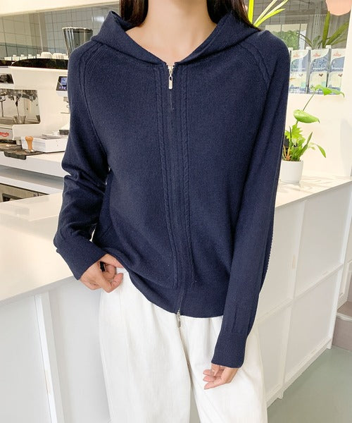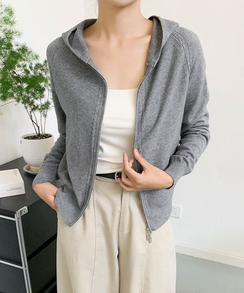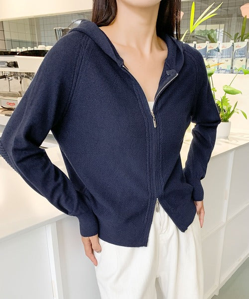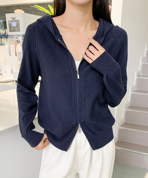 シンプルで着回しやすい無地デザインに、首元をしっかりと包み込むハイネック仕様をプラスしたフード付きカーディガン。カジュアルな雰囲気を持ちながらも、ハイネックで大人な女性らしさUP。ダブルジップ仕様でシルエットのアレンジがしやすく、幅広いコーディネートに活躍。