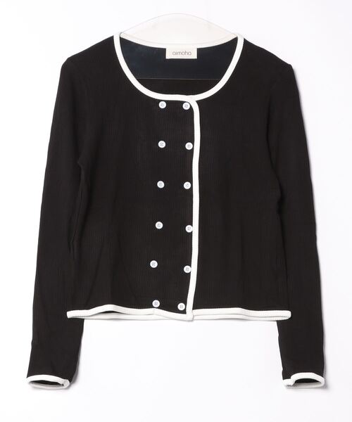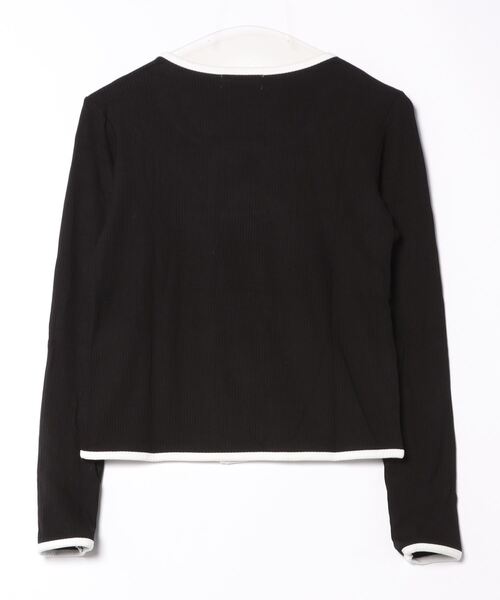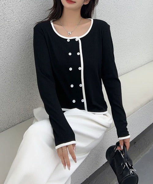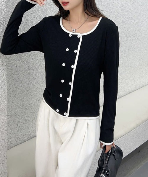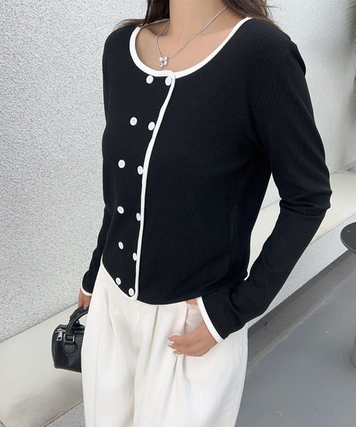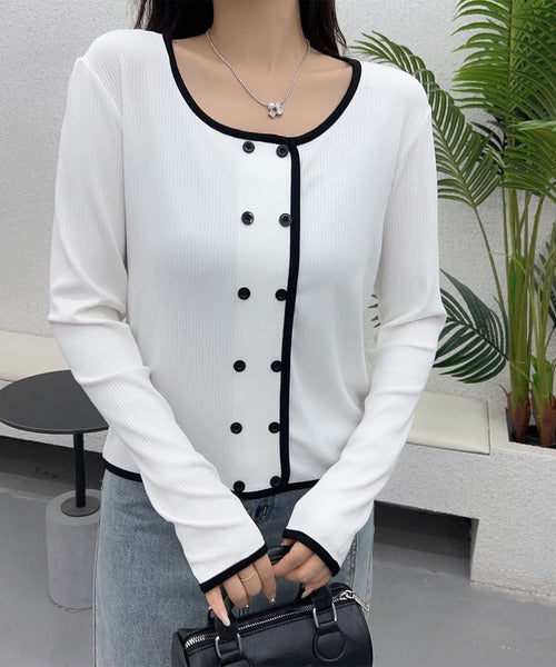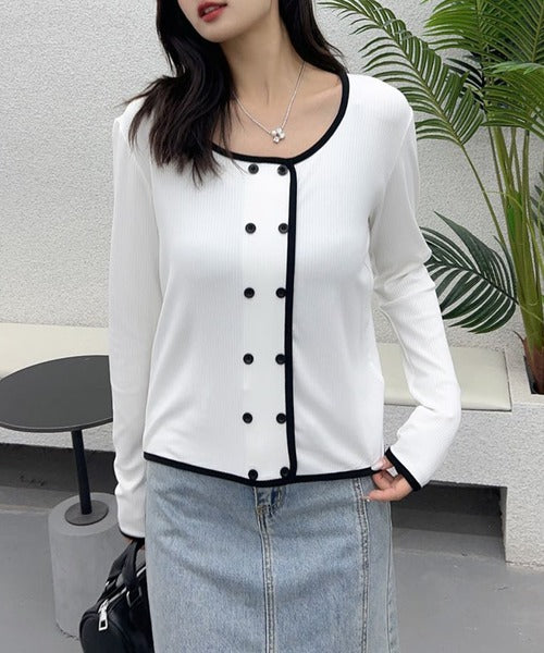 クラシックなモノトーンデザインのカットソー。コントラストの効いた縁取りと2列に配置されたボタンがアクセントになり、シンプルながらもエレガントな印象を与えます。軽やかな着心地で、カジュアルやキレイめ、オフィスカジュアルにも使える万能アイテム。