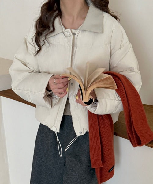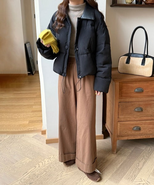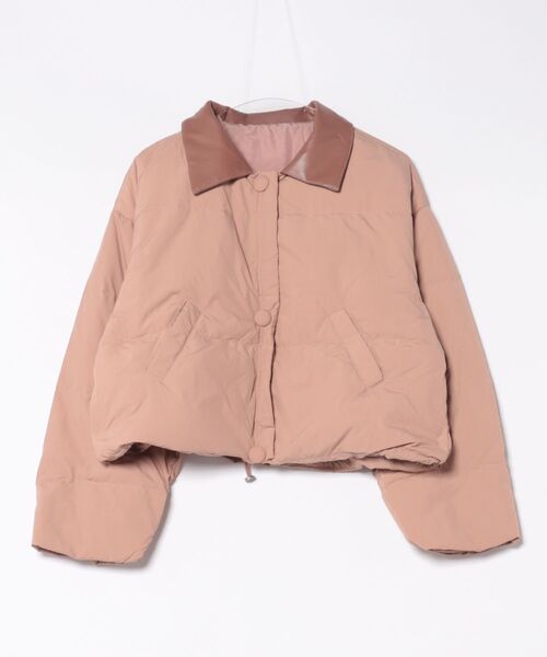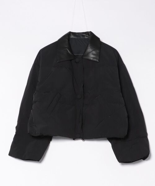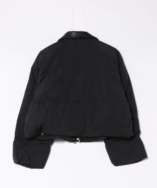襟元のフェイクレザー切り替えが印象的なショートダウン。