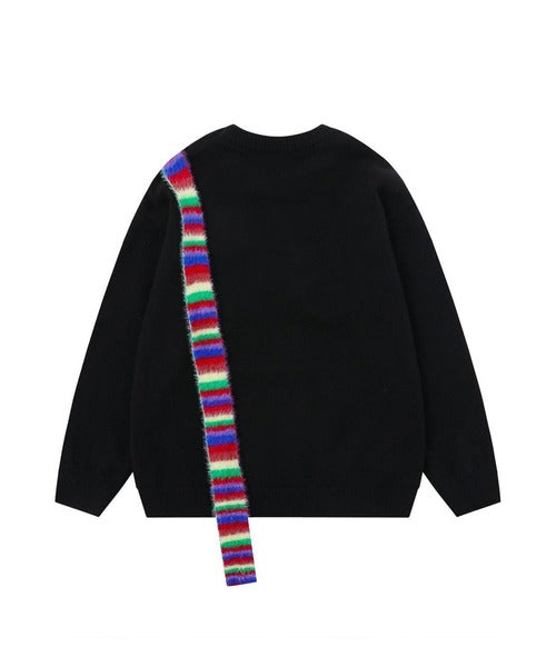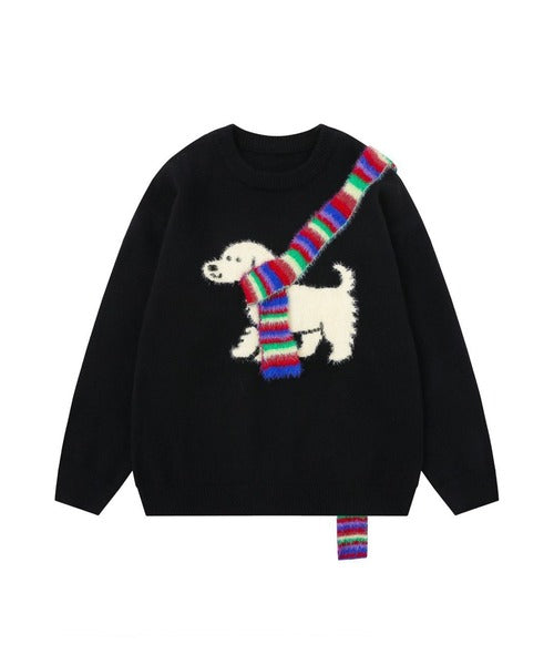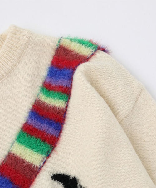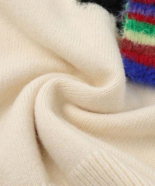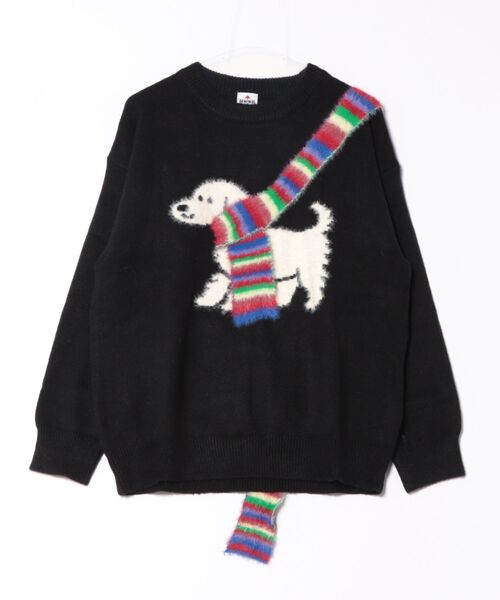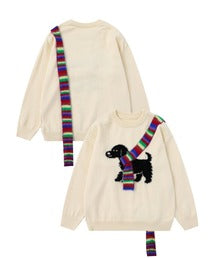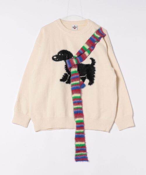 立体的な“カラフルボーダーマフラー”と、ふわふわ質感で編み込まれた“わんちゃんモチーフ”が特徴的な遊び心あふれるニットセーター。