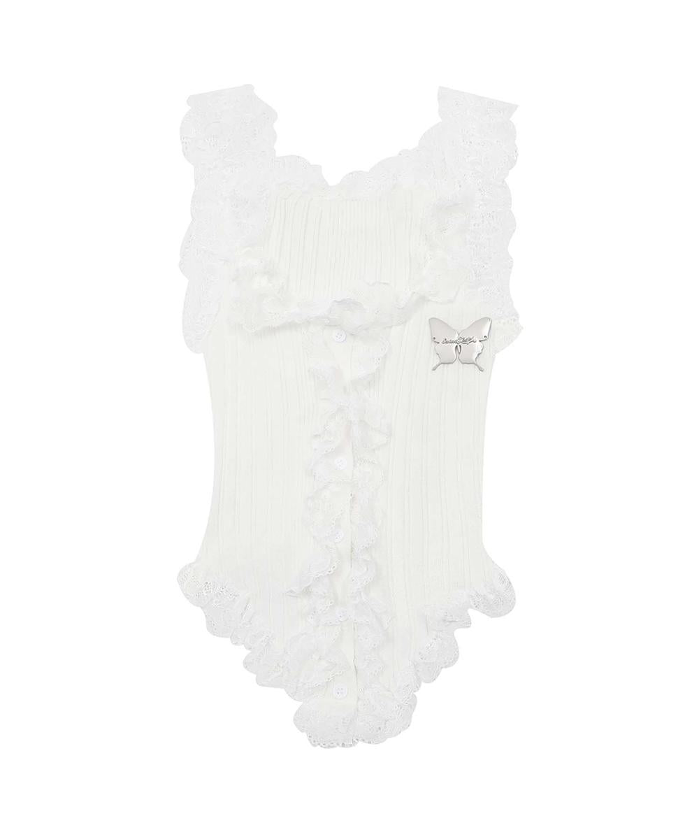 フロントにたっぷりとあしらわれたフリルと、縁を飾る繊細なレースが特徴的なビスチェ。リブ編み素材でボディにフィットし、美しいシルエットで出来上がります。胸元にはリボンモチーフのチャームがアクセントとして加えられ、ガーリーで上品な仕上がりに。