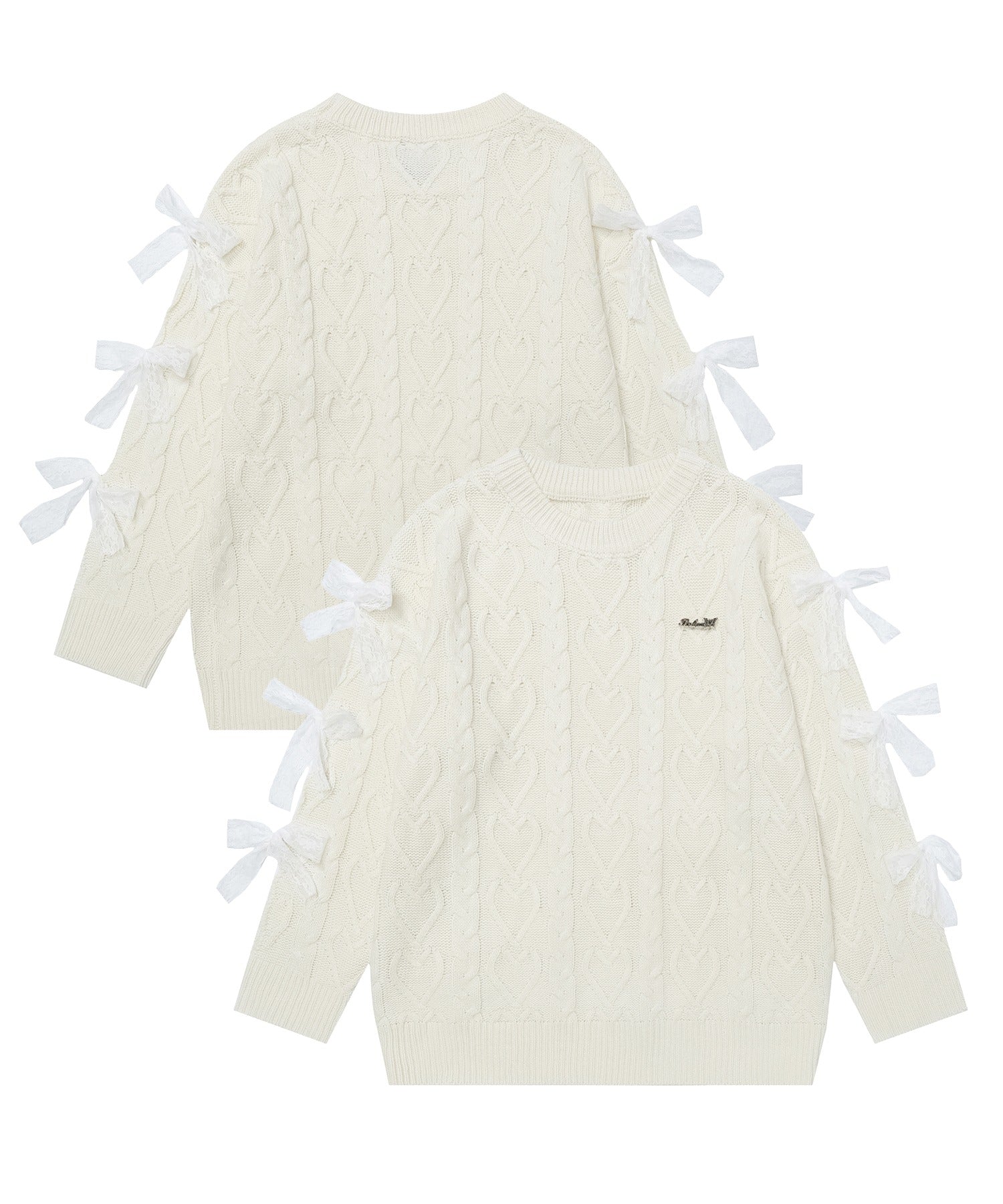 【HOOK】for girls 袖リボン付きハートケーブルニットプルオーバー