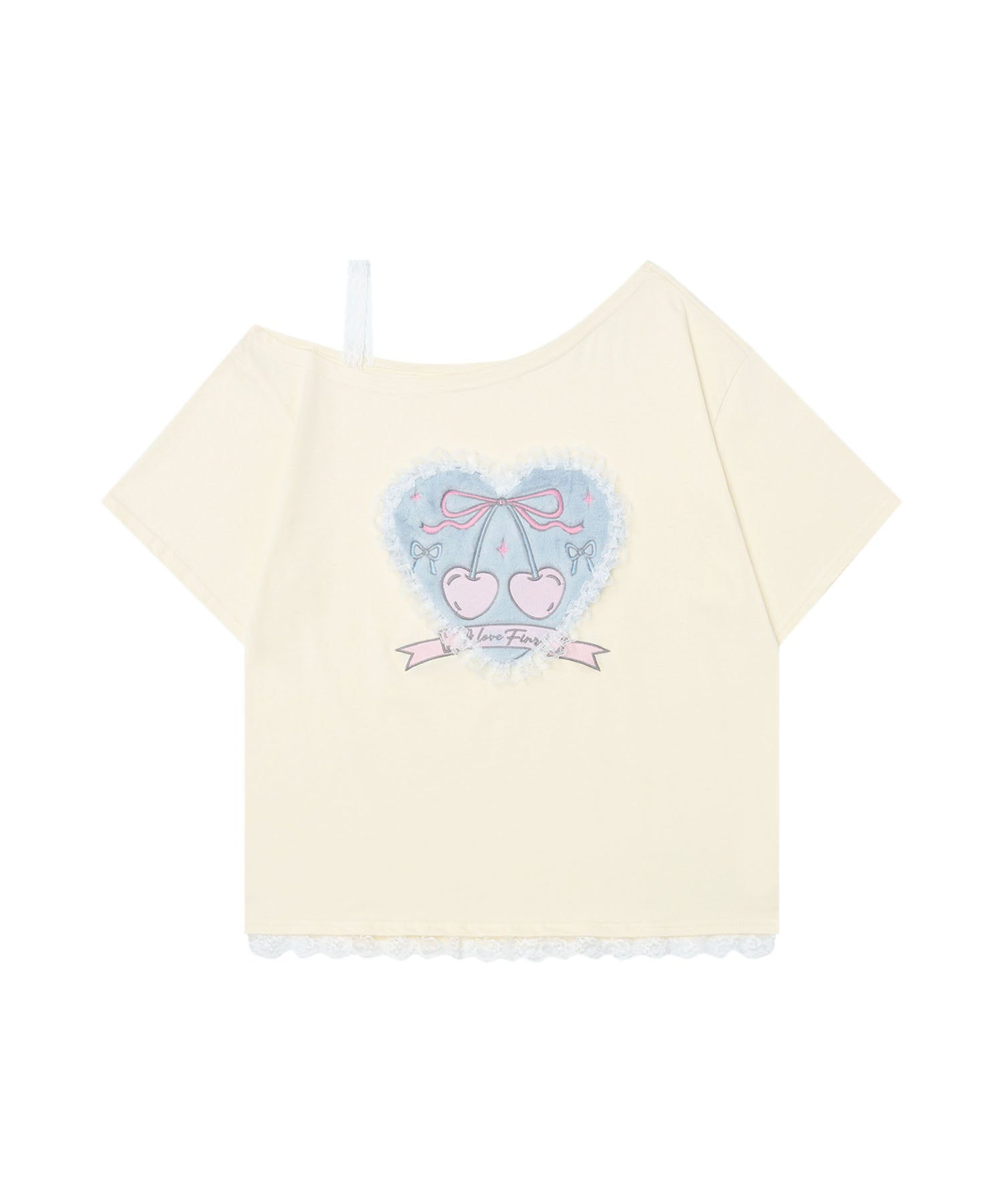 フロントに可愛らしいハートモチーフのプリントを施したTシャツ。レースやリボンのディテールが甘さを引き立て、フェミニンな雰囲気を演出。ワンショルダーのデザインがトレンド感をプラスし、シンプルながらも個性を感じられるアイテム。裾にはレースが施され、さりげないガーリー要素をプラス。