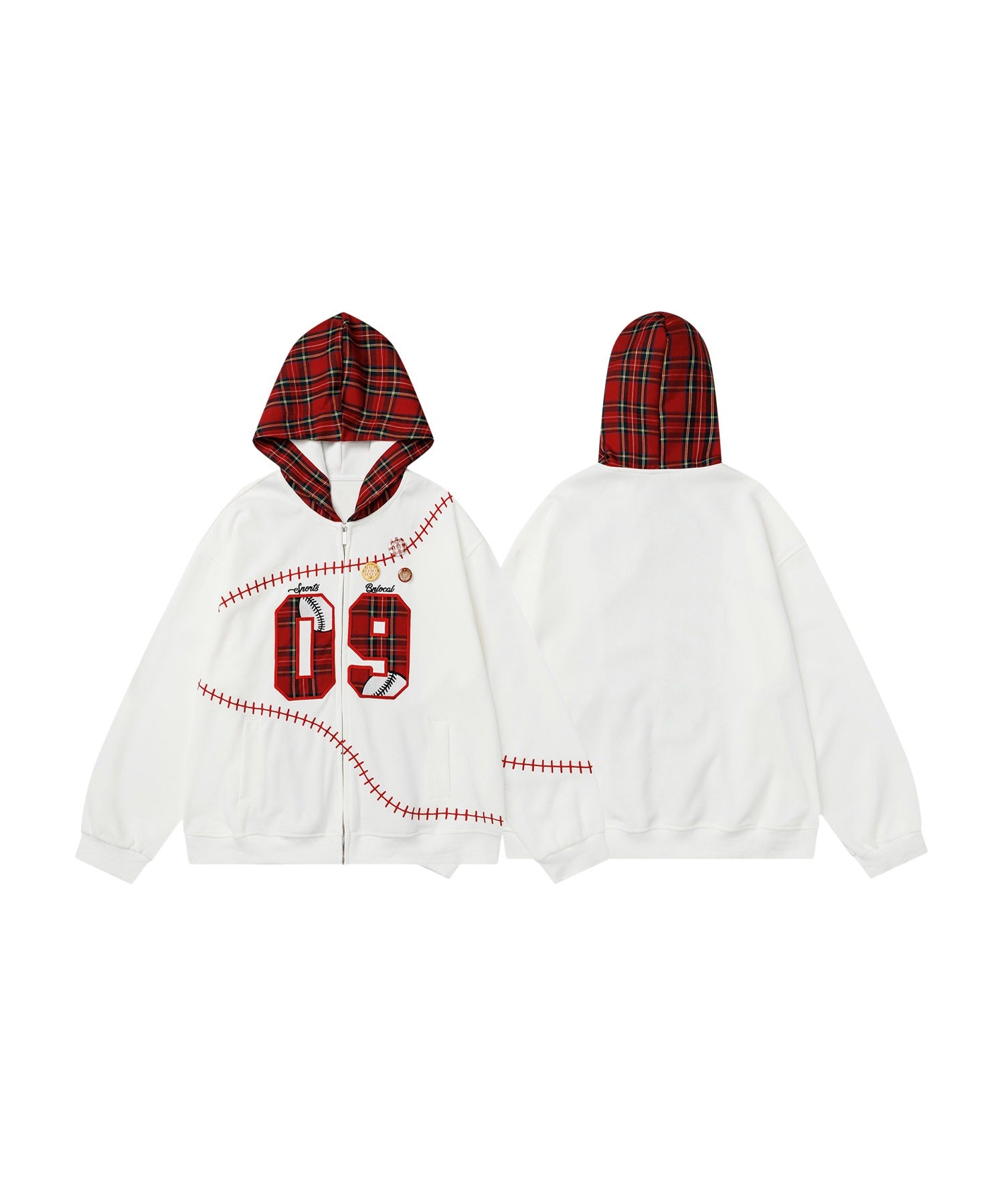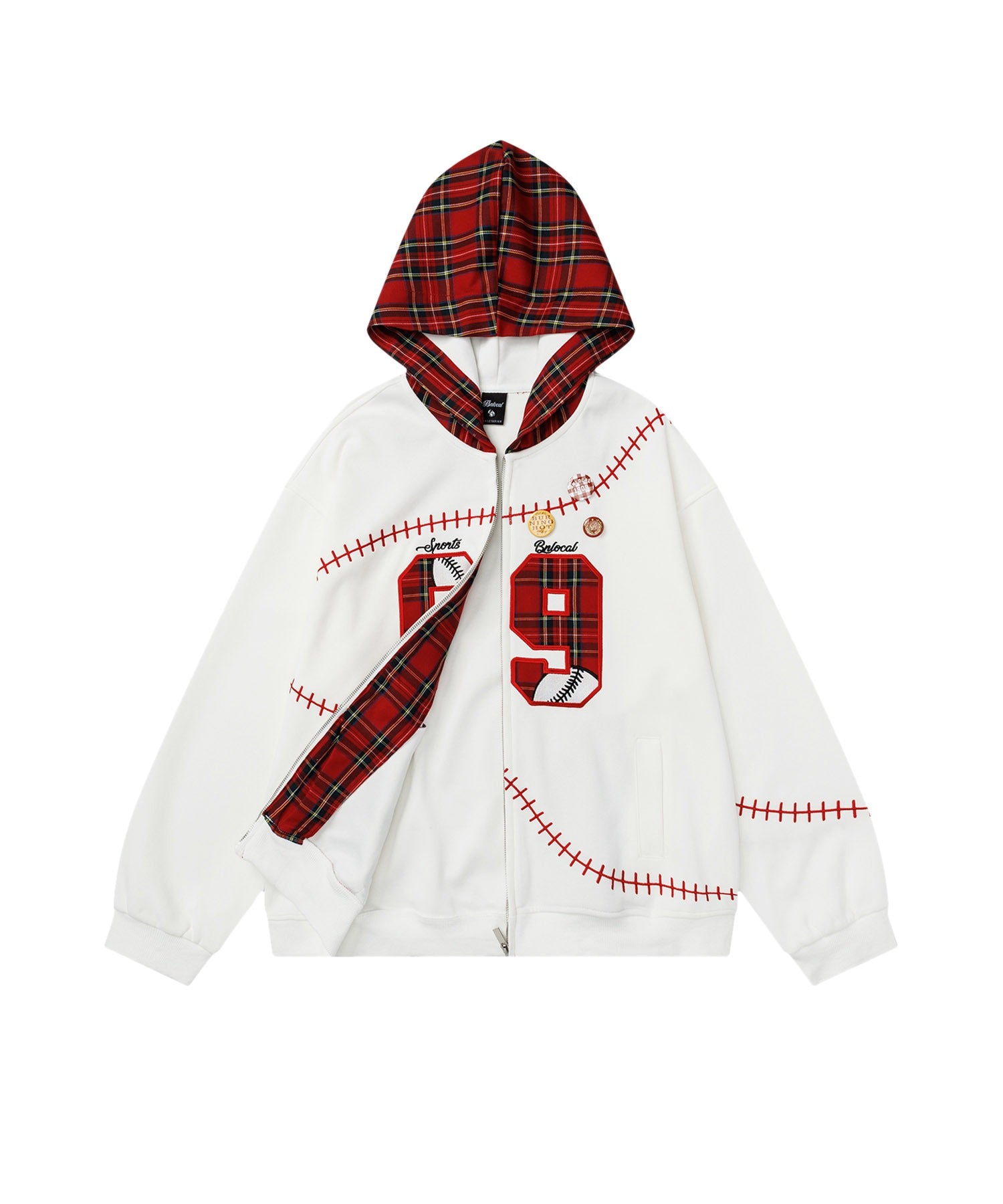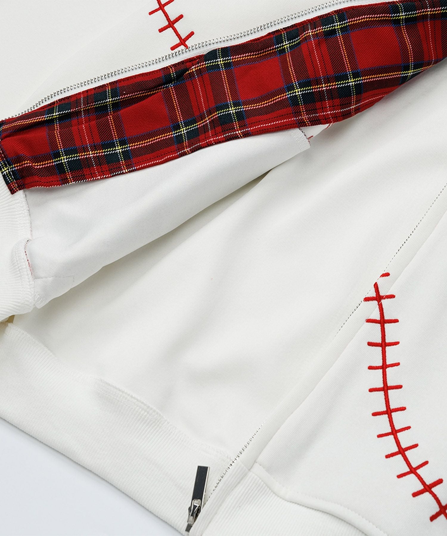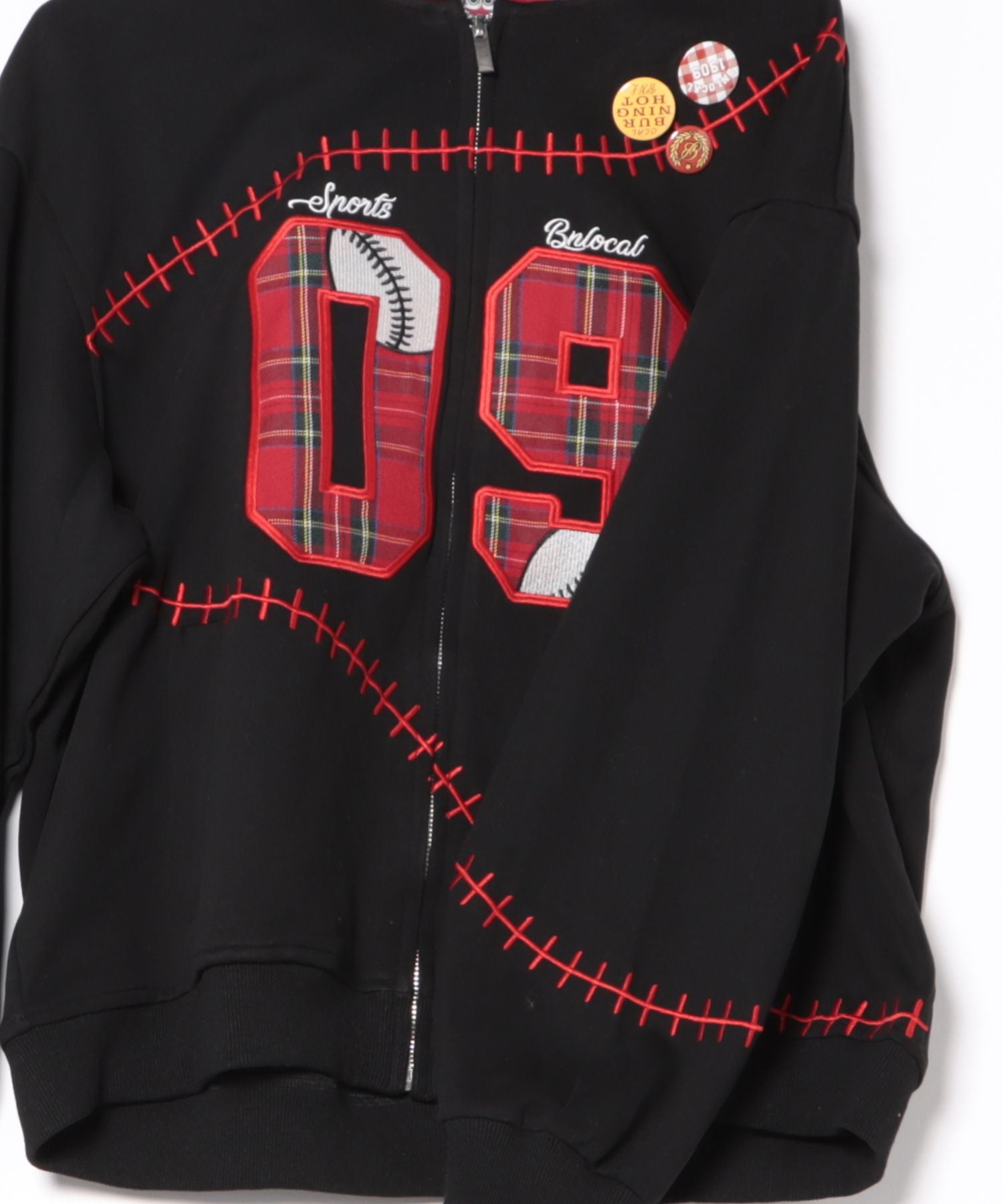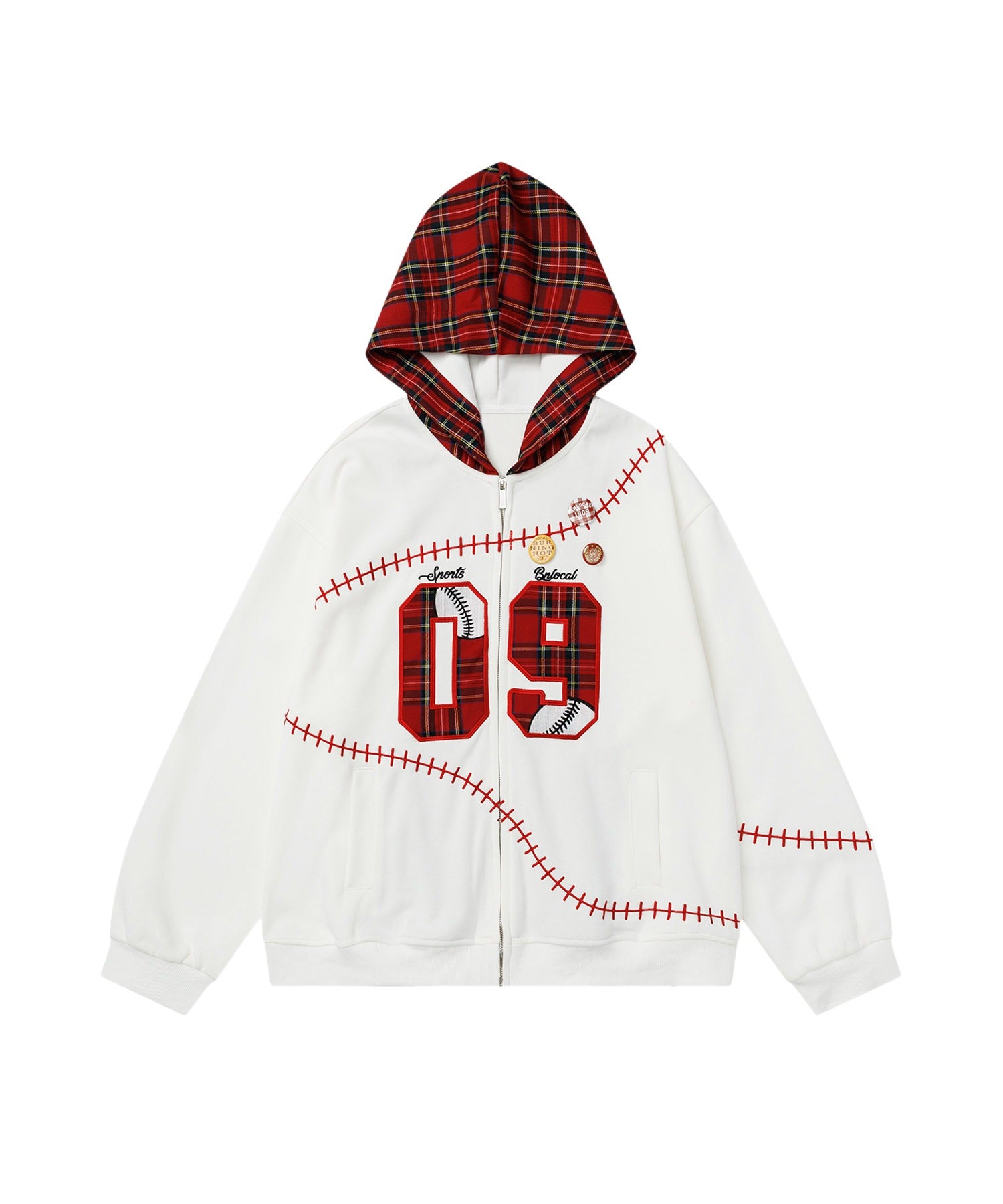 フロントには野球モチーフのワッペンをあしらい、ストリート感のあるデザインに。フードはカジュアルなチェック柄で、スポーティな中にトラッドな雰囲気をプラスしました。袖から身頃にかけて大胆に施された野球ボールのステッチ風プリントもポイント。