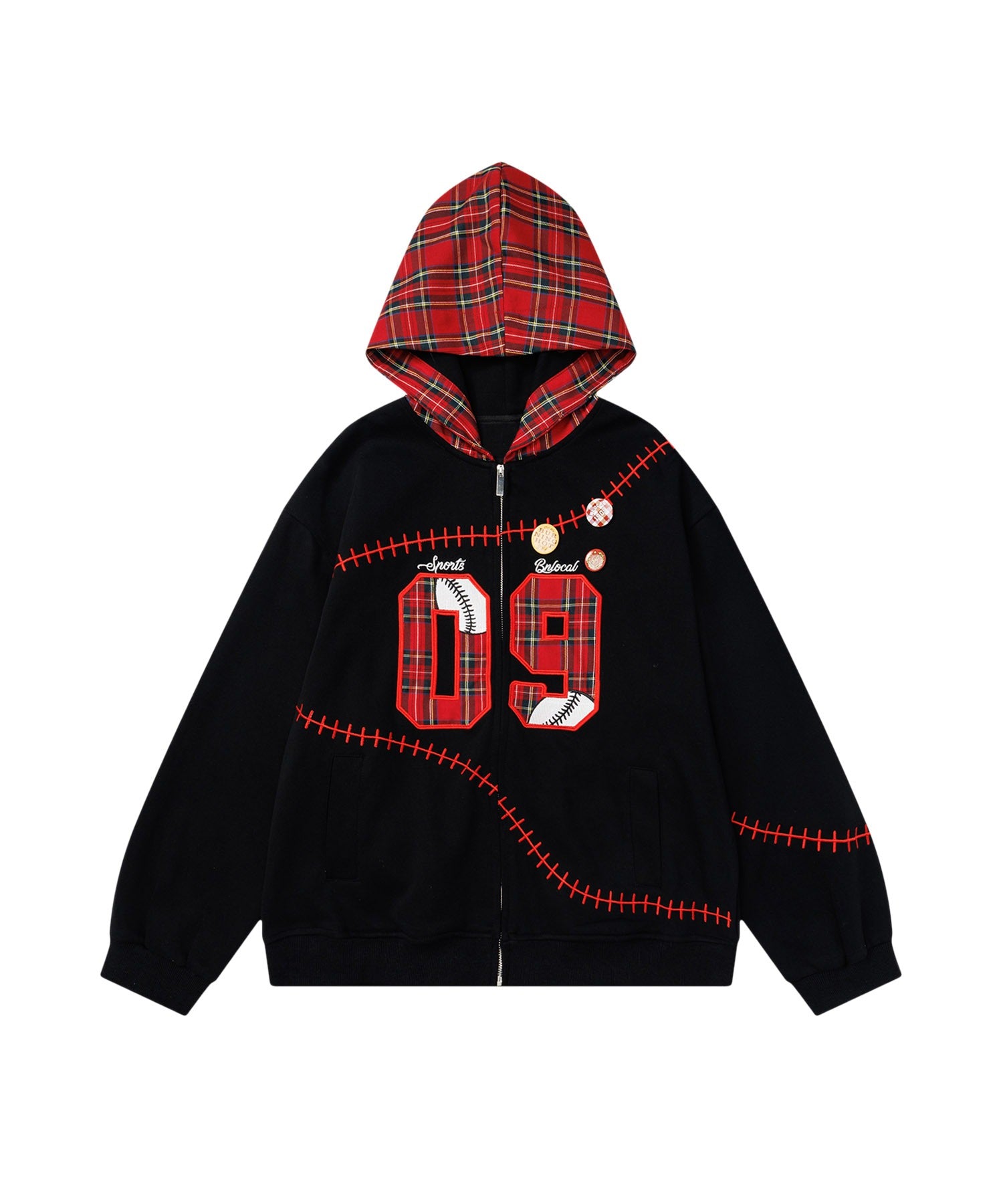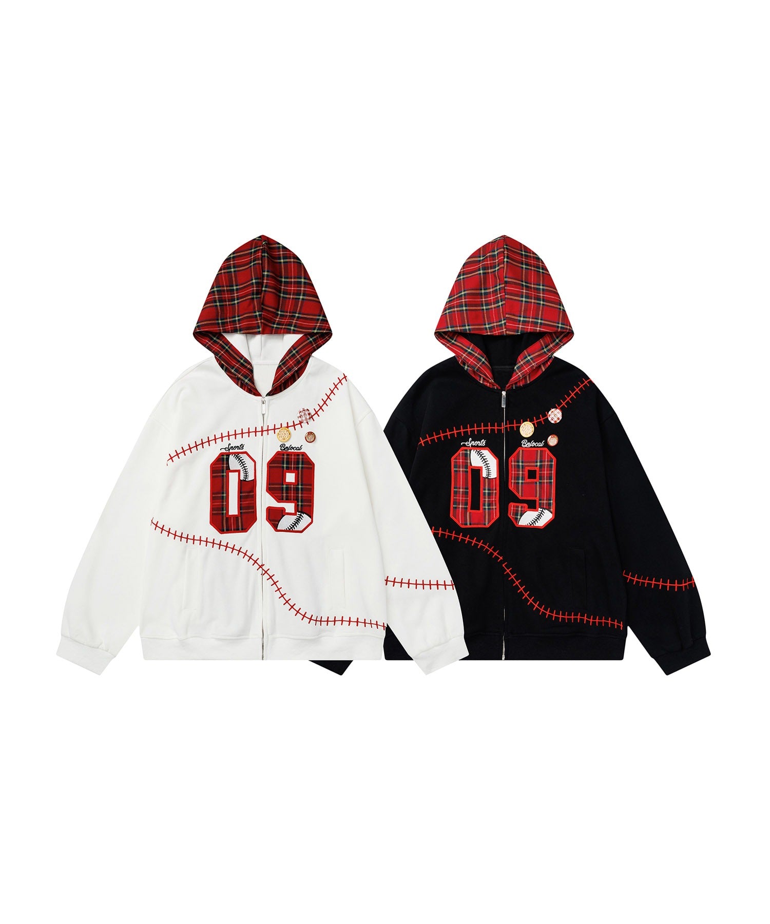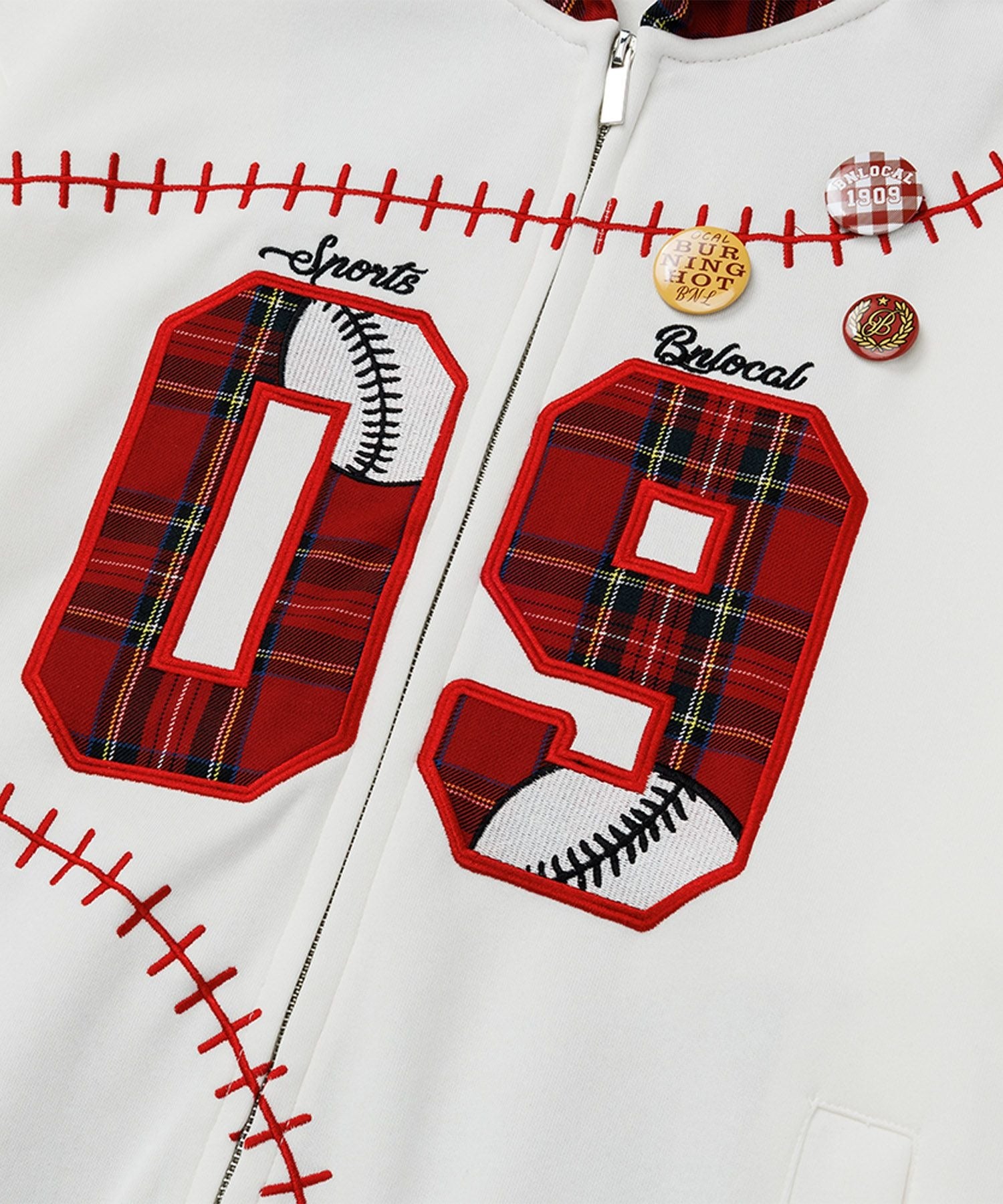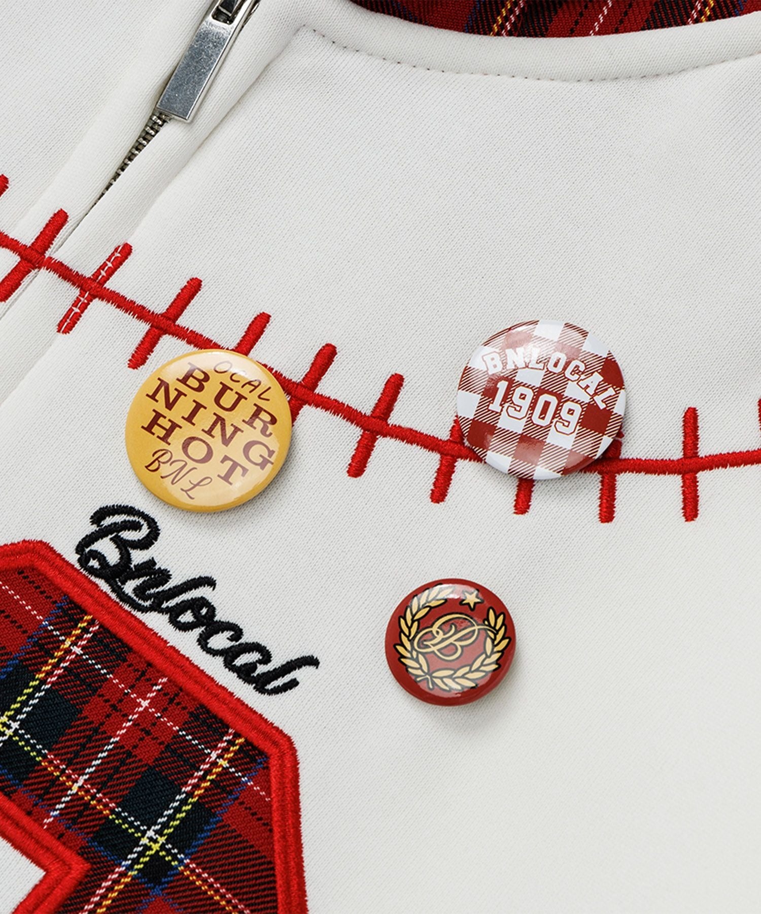 フロントには野球モチーフのワッペンをあしらい、ストリート感のあるデザインに。フードはカジュアルなチェック柄で、スポーティな中にトラッドな雰囲気をプラスしました。袖から身頃にかけて大胆に施された野球ボールのステッチ風プリントもポイント。