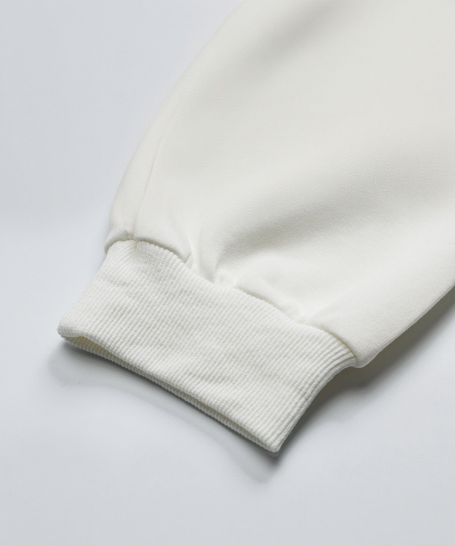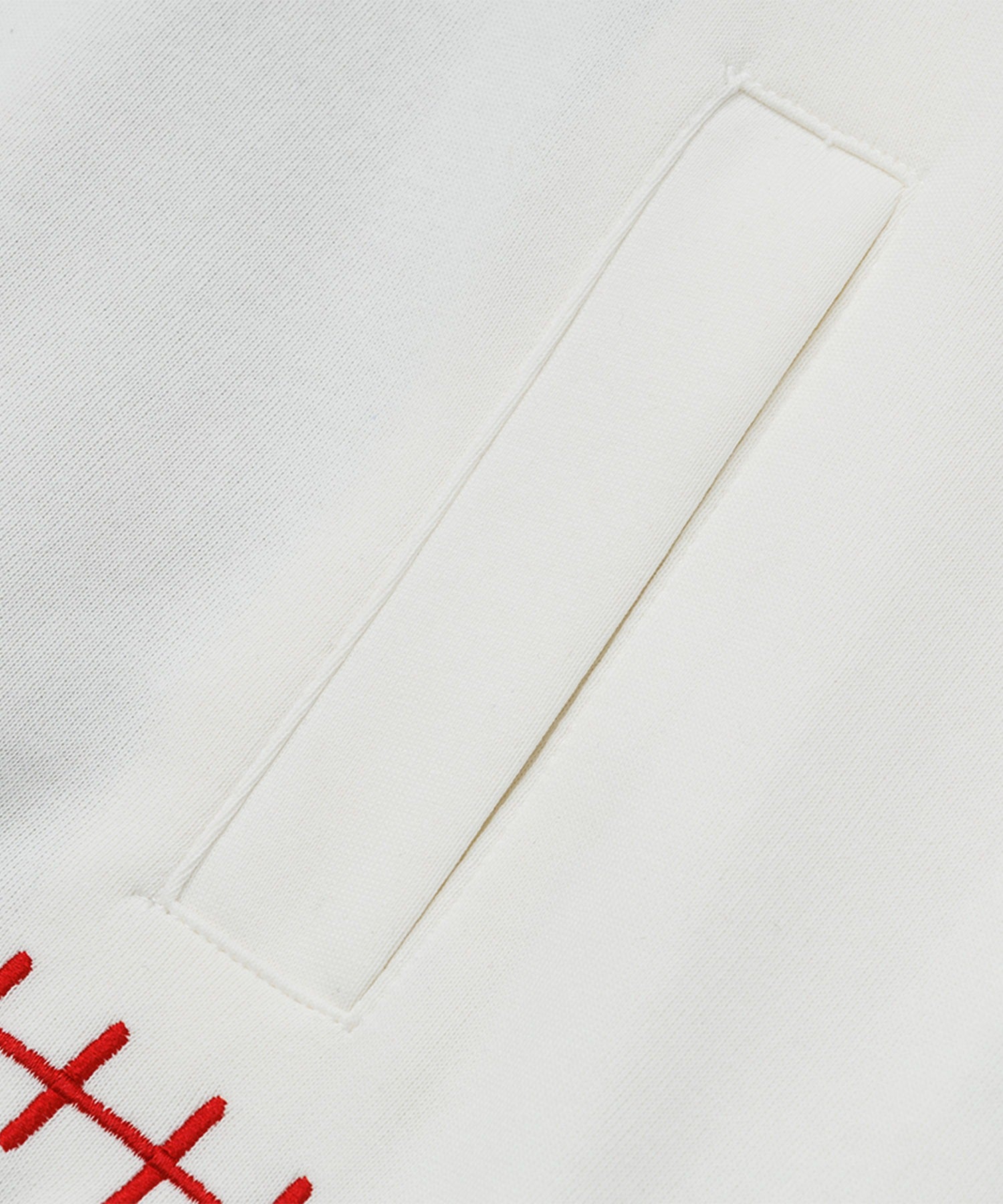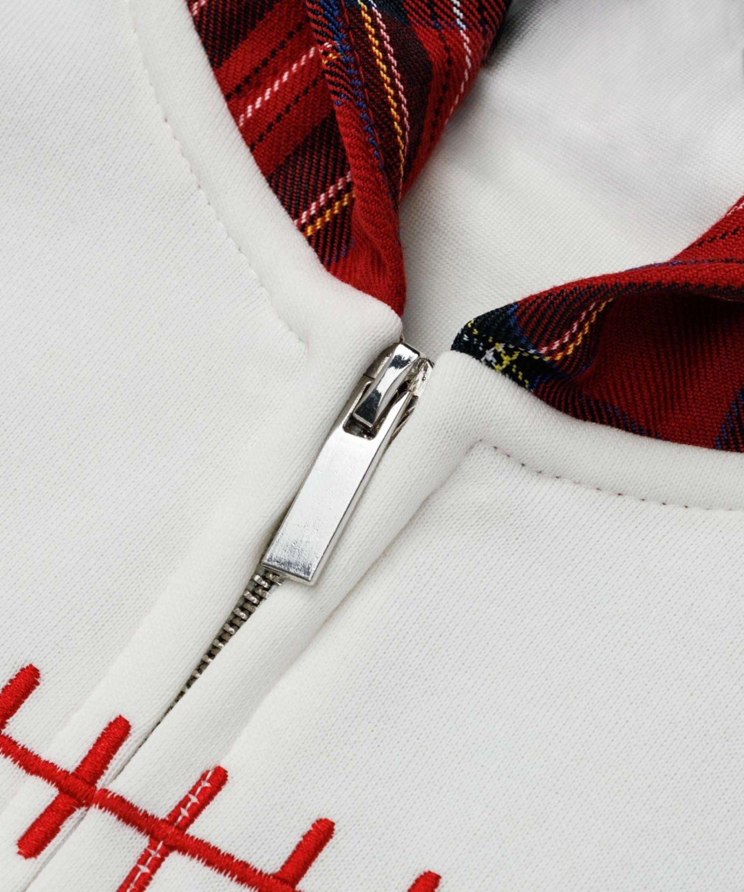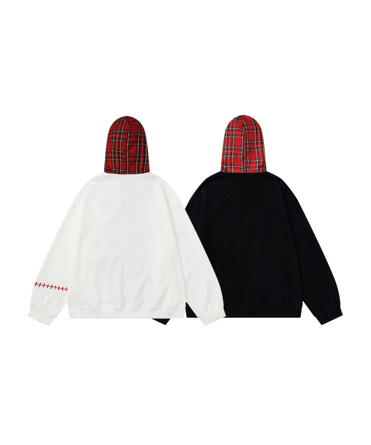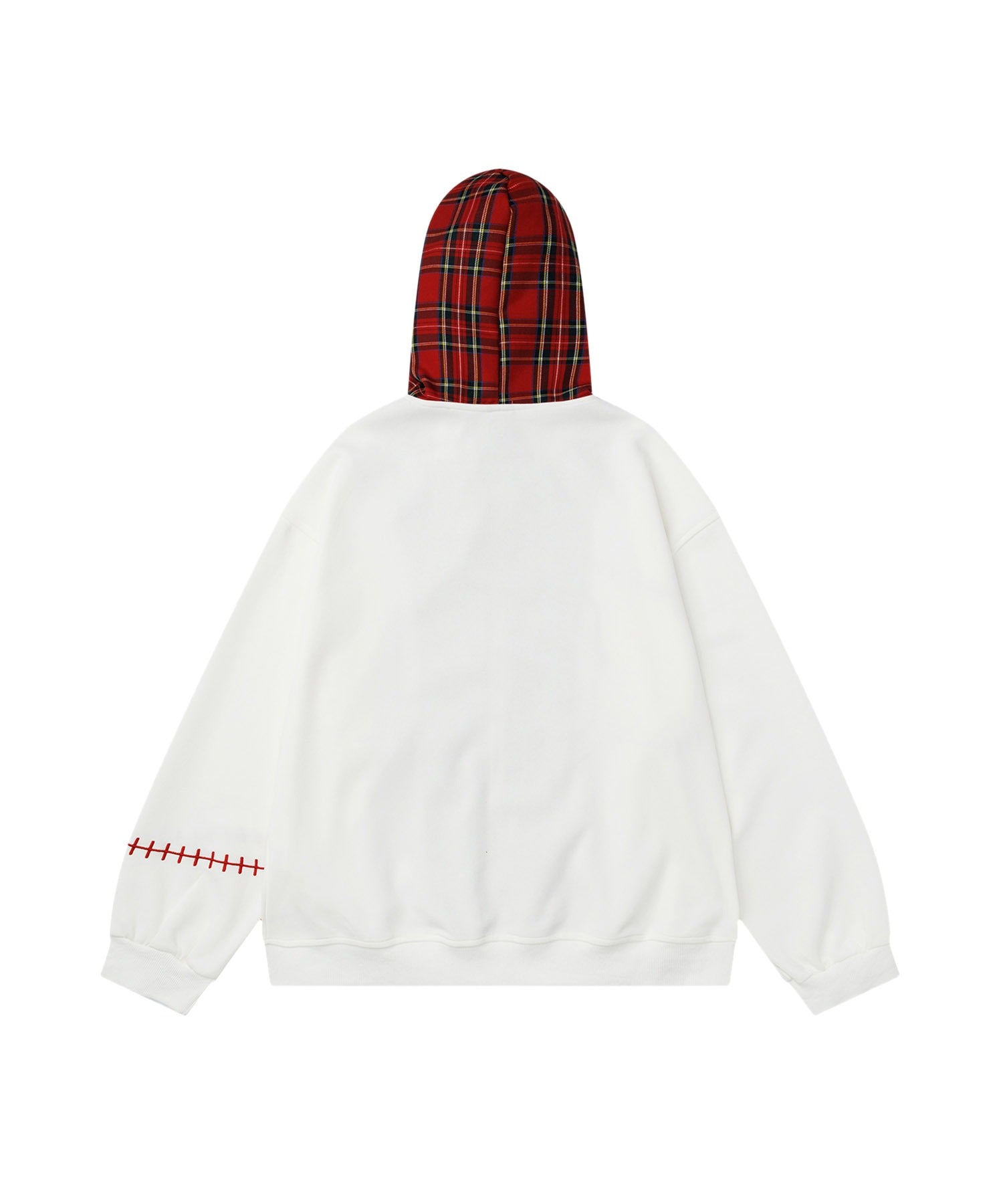 フロントには野球モチーフのワッペンをあしらい、ストリート感のあるデザインに。フードはカジュアルなチェック柄で、スポーティな中にトラッドな雰囲気をプラスしました。袖から身頃にかけて大胆に施された野球ボールのステッチ風プリントもポイント。
