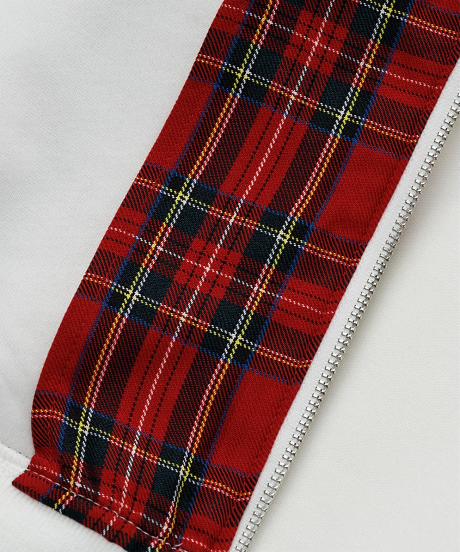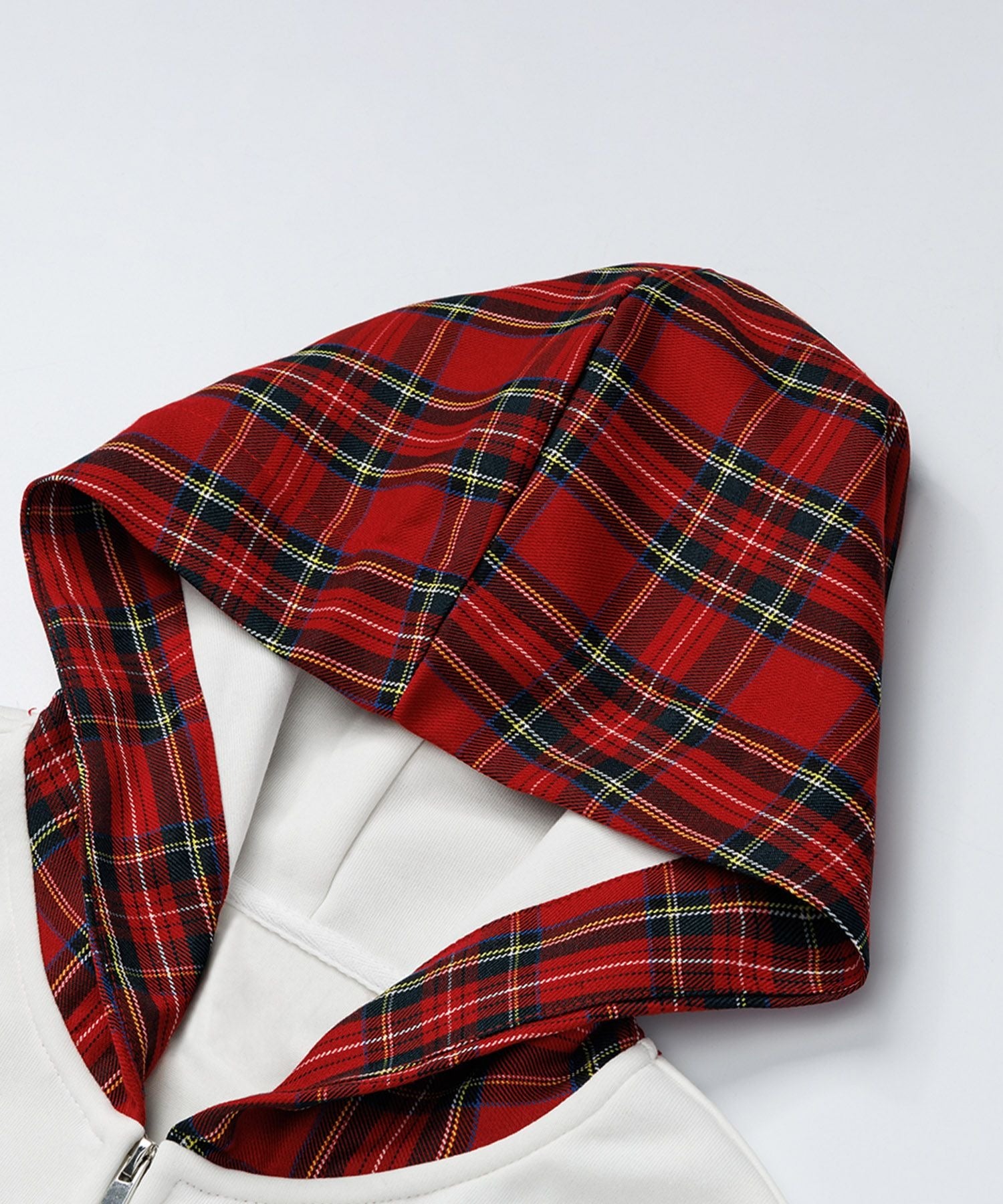 存在感のある チェック柄フード付きのジップアップパーカー。
