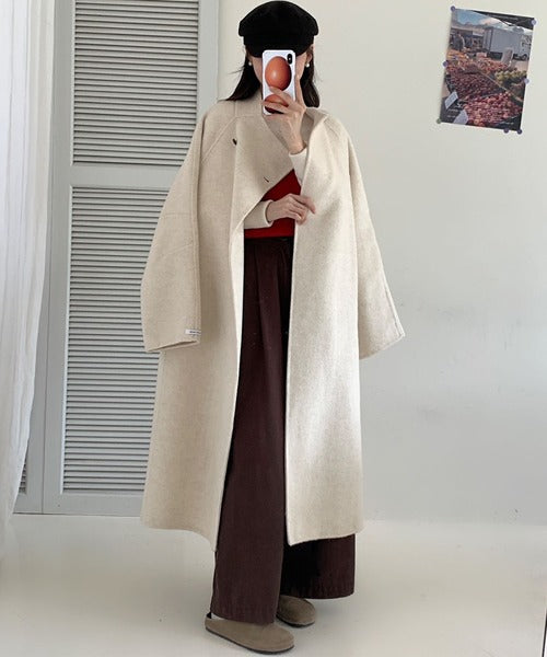 上質なウール素材で仕立てた、エレガントなデザインのロングコート。柔らかな手触りと優れた保温性を兼ね備え、寒い季節でも暖かく快適に過ごせます。ラップスタイルのフロントデザインがモダンなデザインで、1つのボタンがアクセントとなり、さりげないスタイルアップを実現。カフス部分には折り返しが施され、エレガントな雰囲気をプラス。豊富なカラーバリエーションで、どんなスタイリングにも合わせやすく、日常使いから特別な日まで幅広く活躍する一着です。