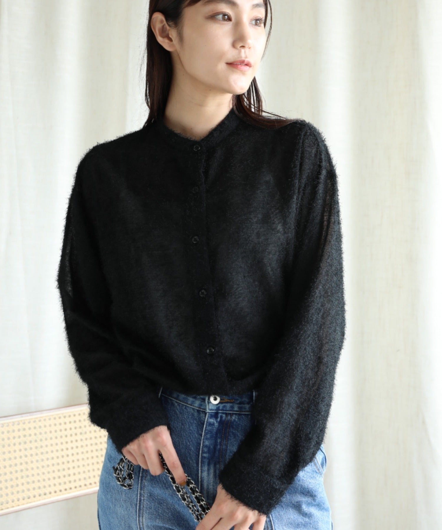 このシャツは、ふんわりとした毛羽立ちのある生地で作られており、柔らかく軽やかな印象を与えます。見た目にも温かみがあり、秋冬シーズンにぴったりのアイテムです。