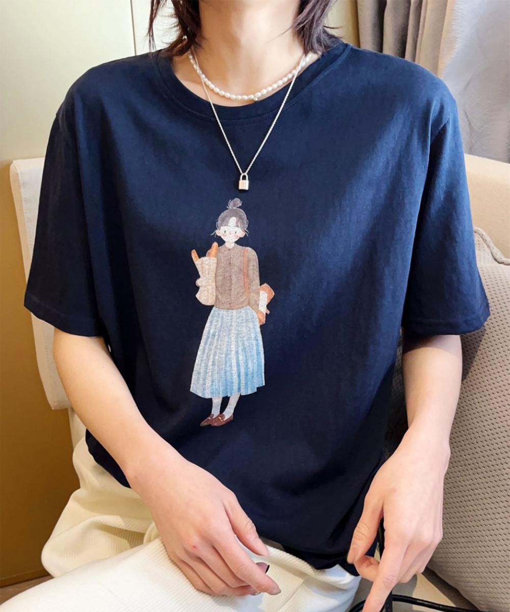女性のイラストが描かれたシンプルなデザインのカジュアルTシャツ。プリントが華やかでありながらも落ち着いた印象を与え、どんなスタイルにも合わせやすい一枚です。ゆったりとしたシルエットで、リラックスした着心地が魅力です。