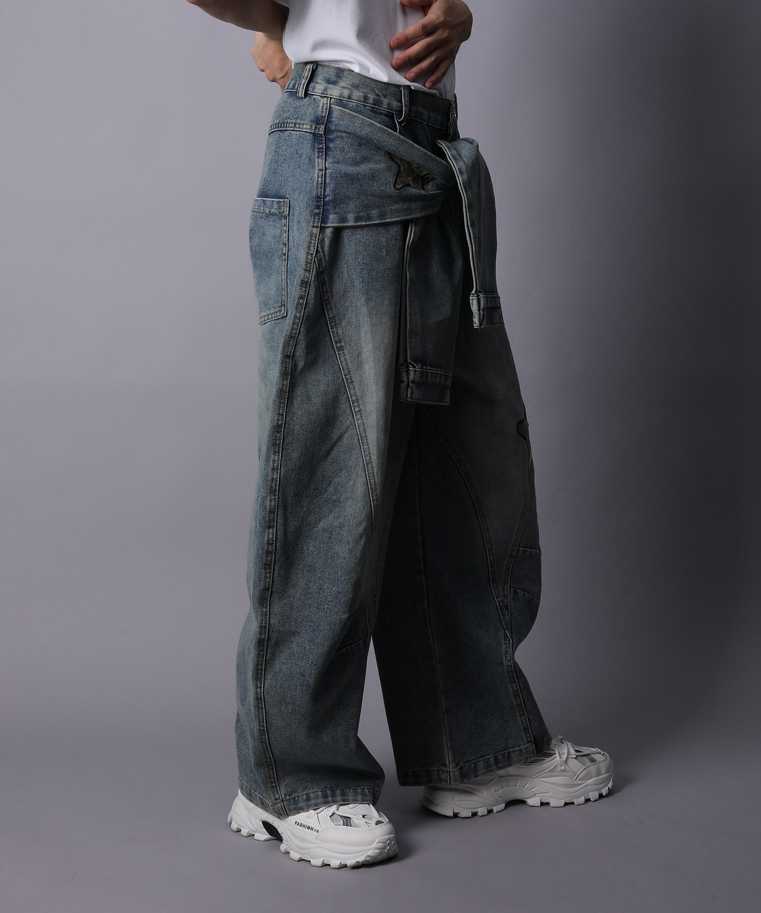 切り替えの効いた立体感のあるデザインに加え、ウエスト部分の巻きつけ風ディテールがアクセントとなり、個性的ながらもスタイリングに取り入れやすい一本です。