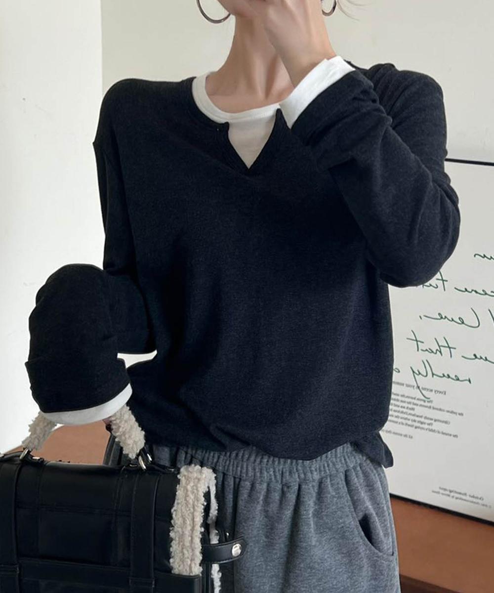 上品なバイカラーデザインが魅力のレイヤードカットソー。ネックラインや袖口、裾部分に施された配色がポイントとなり、シンプルながらもスタイリッシュな印象を与えます。ゆったりとしたシルエットと柔らかなラインで、リラックス感と女性らしい雰囲気を両立したアイテムです。