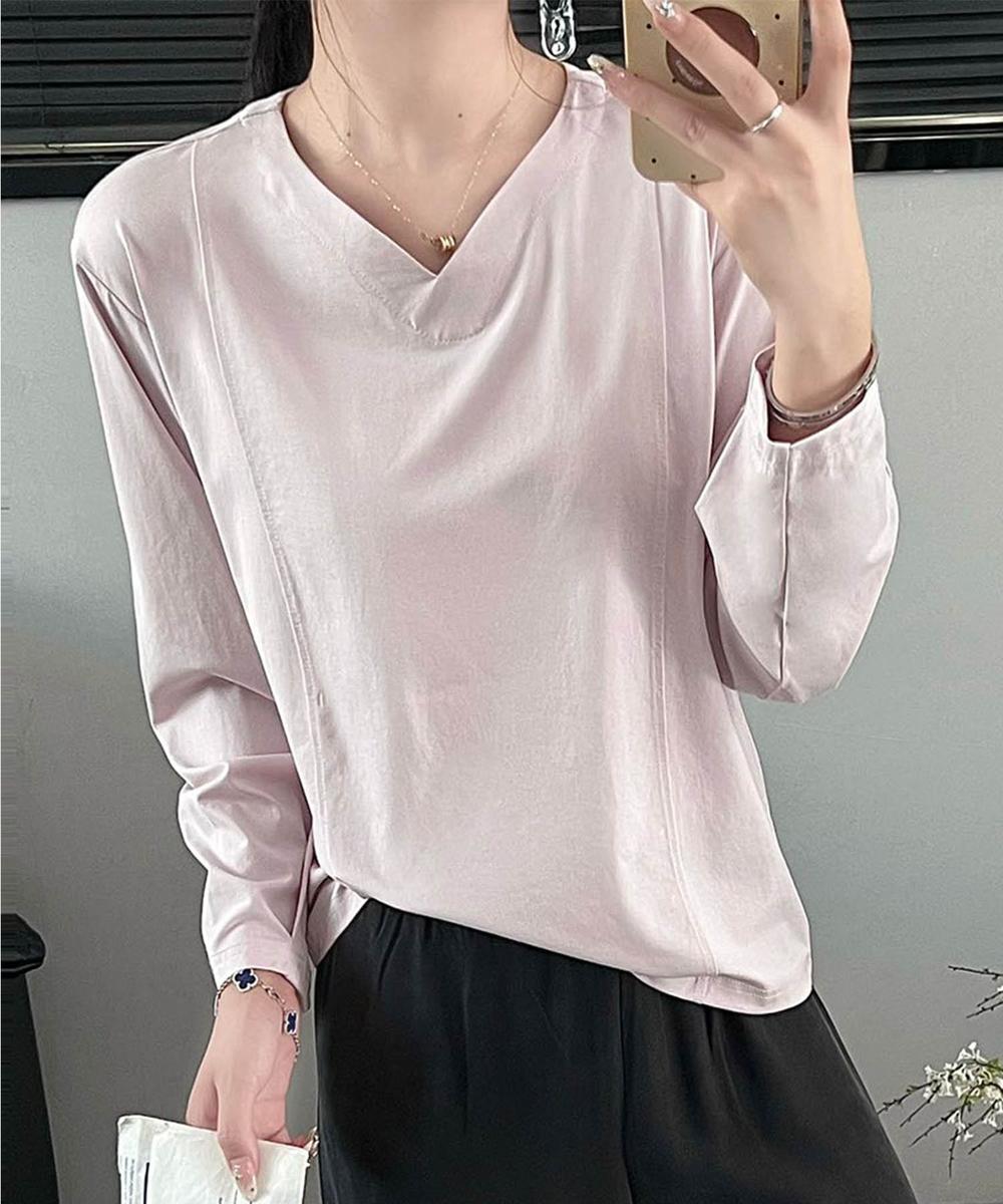 シンプルでエレガントなVネックロングスリーブカットソー。首元を美しく見せるVネックデザインと、ほどよくゆとりのあるシルエットが特徴です。サイドスリットがアクセントとなり、動きやすさと女性らしい柔らかい印象を両立しています。