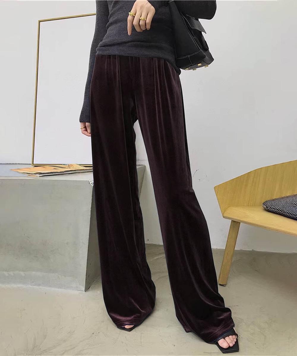 上品な光沢感を持つベルベット素材のワイドパンツ。ゆったりとしたシルエットが脚のラインを美しく見せるだけでなく、リラックスした履き心地。ウエスト部分はゴム仕様で、簡単に着脱らくらく。カジュアルからエレガントなシーンまで幅広く活躍する一着です。