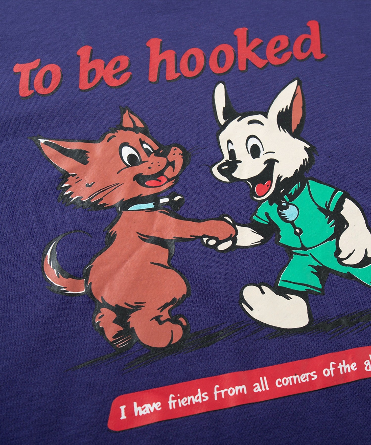 「to be hooked」「I have friends from all corners of the globe」のメッセージが遊び心をプラスし、カジュアルながらも個性を引き立てる一枚。