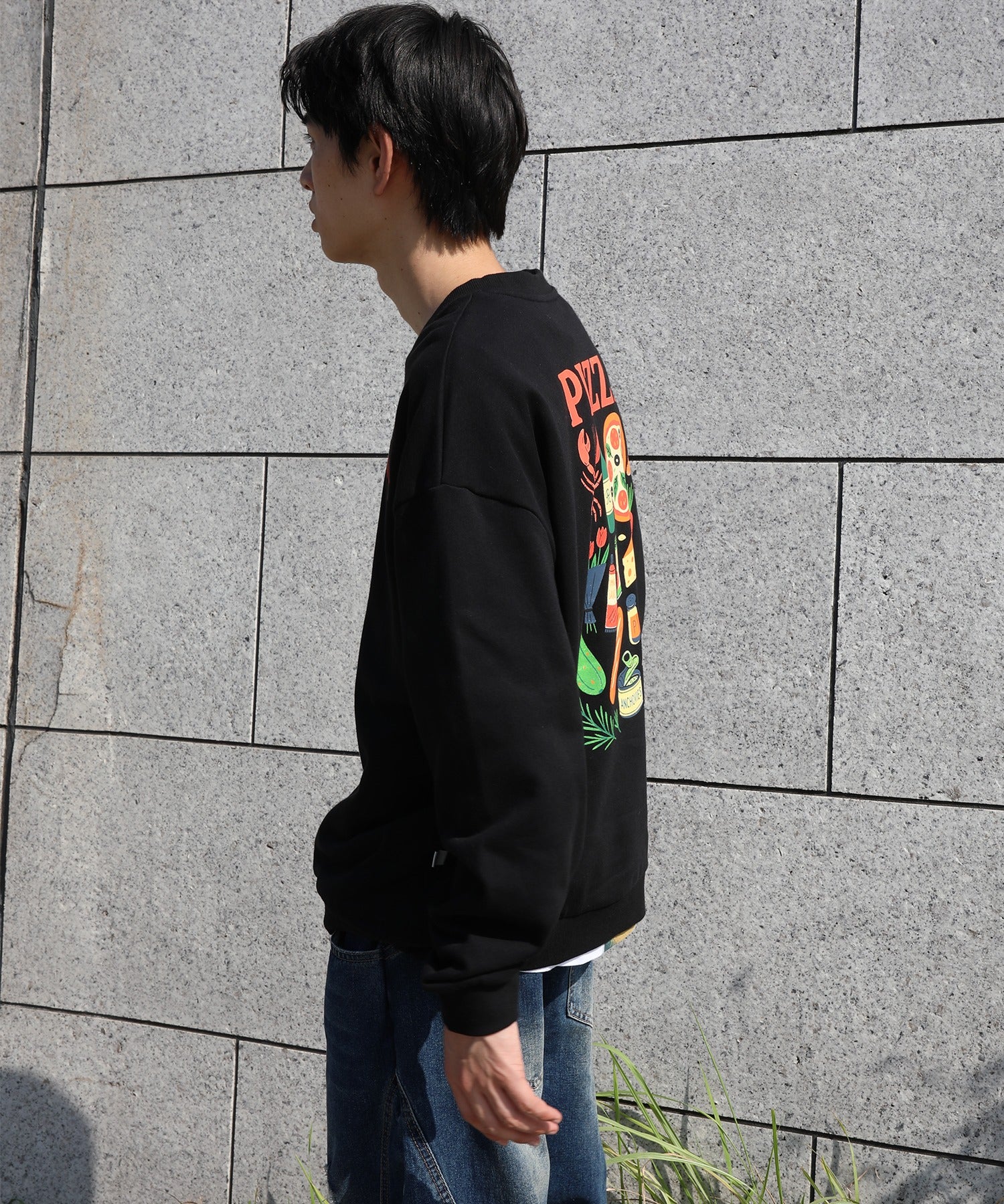 羊や草花、小屋が描かれた前面の総柄が目を惹く一方で、背面はあえて無地で切り替え、抜け感をプラス。