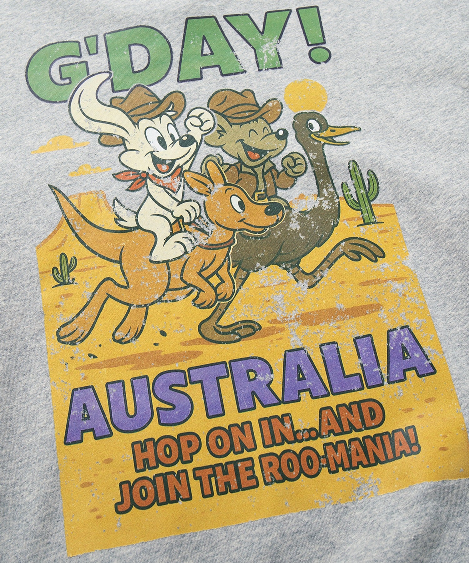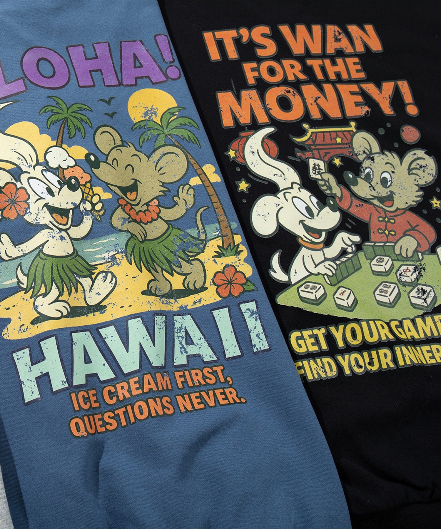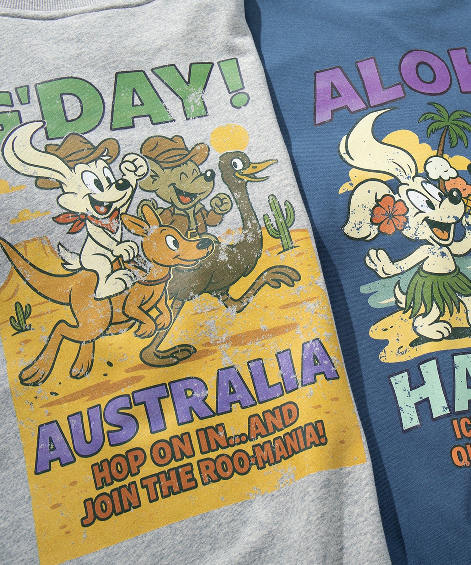 HAWAII、CHINA、AUSTRALIA――それぞれの舞台で活躍するキャラたちが描かれた、どこか懐かしいタッチのバックプリントが魅力。