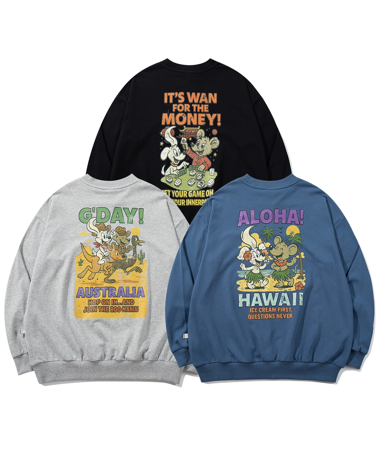 ポップでキュートなアニマルキャラたちが世界を旅する、冒険スウェットシリーズ。