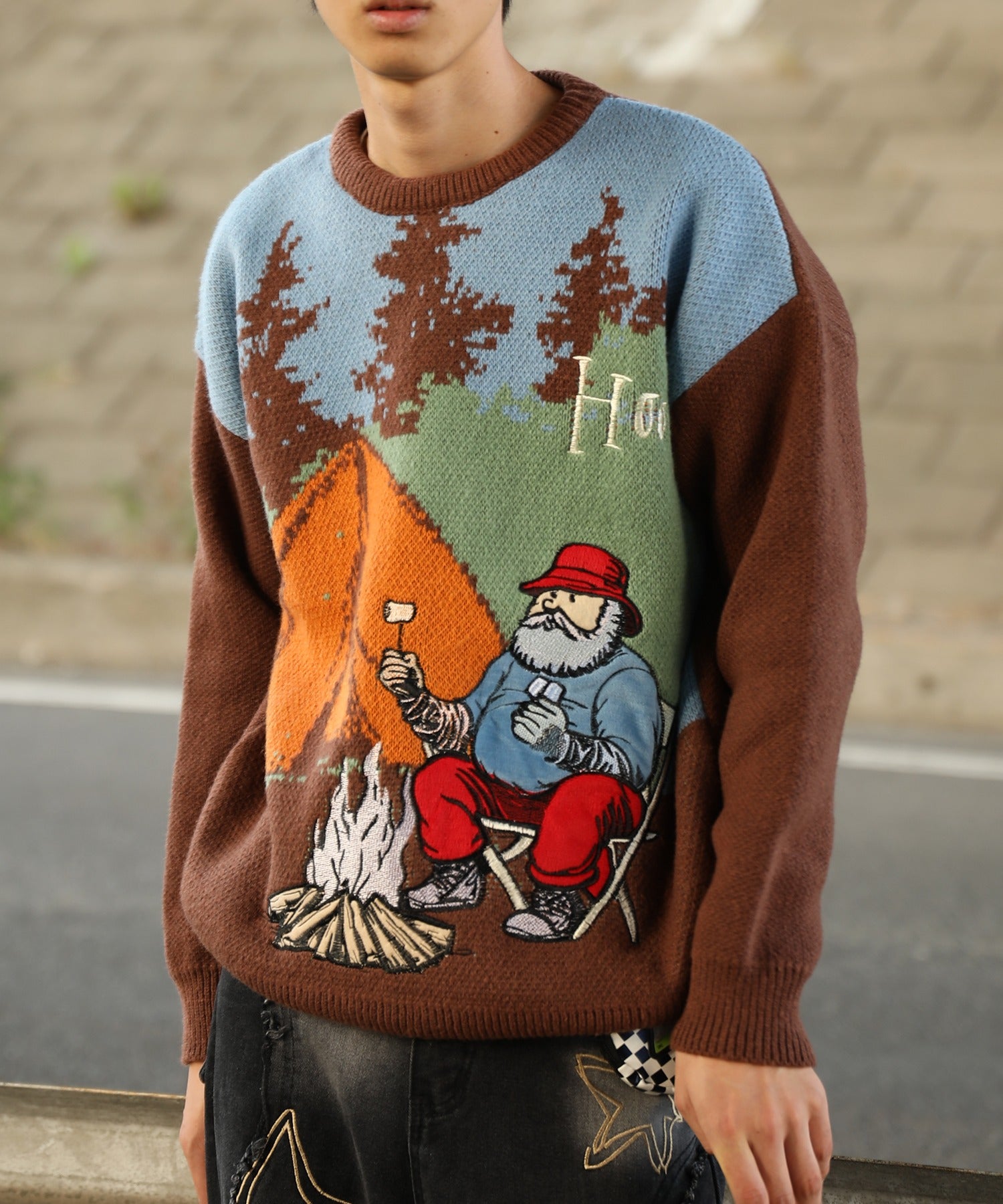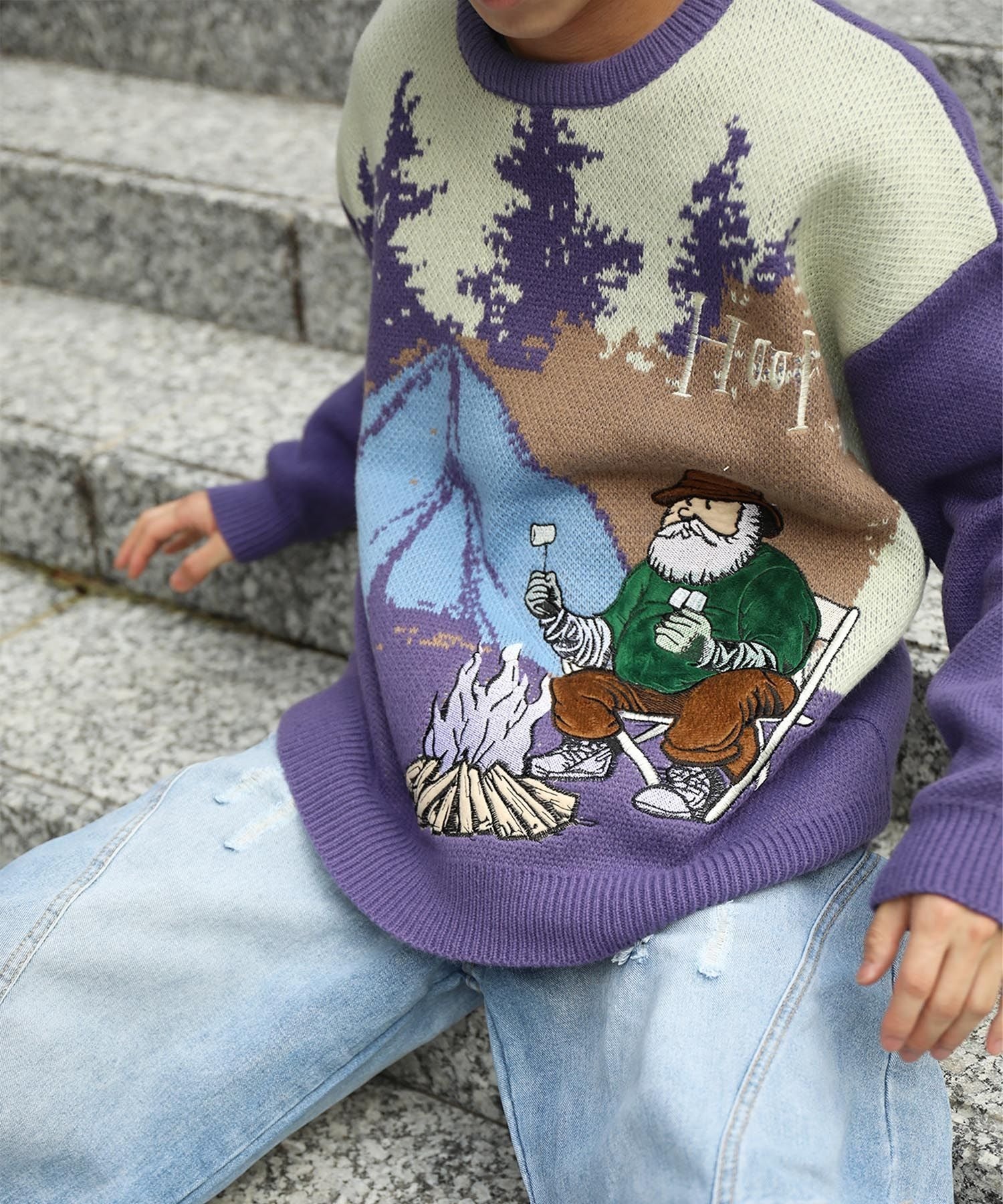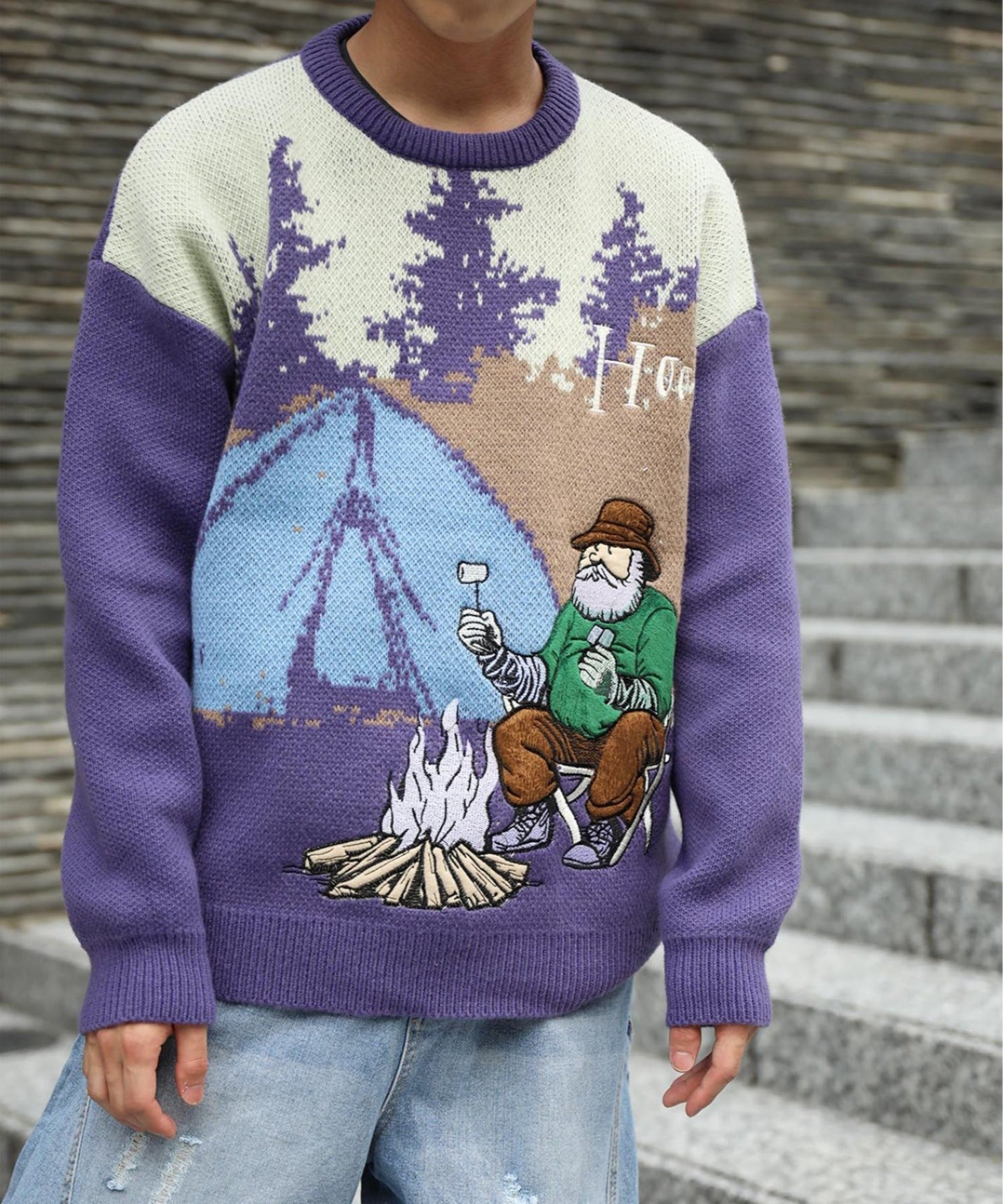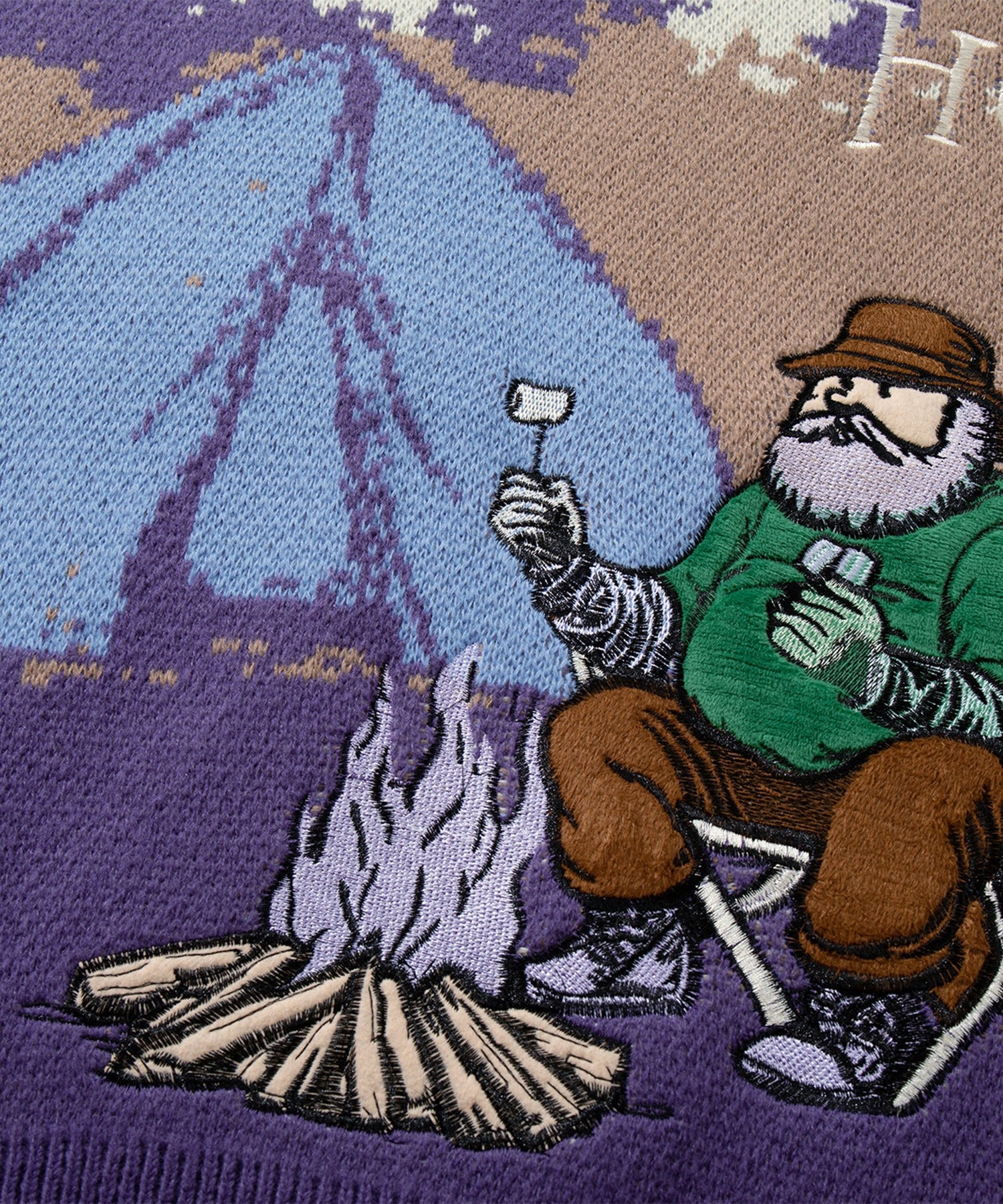 焚き火の前でくつろぐ「キャンプおじさん」が主役の、レトロポップな刺繍ニット。