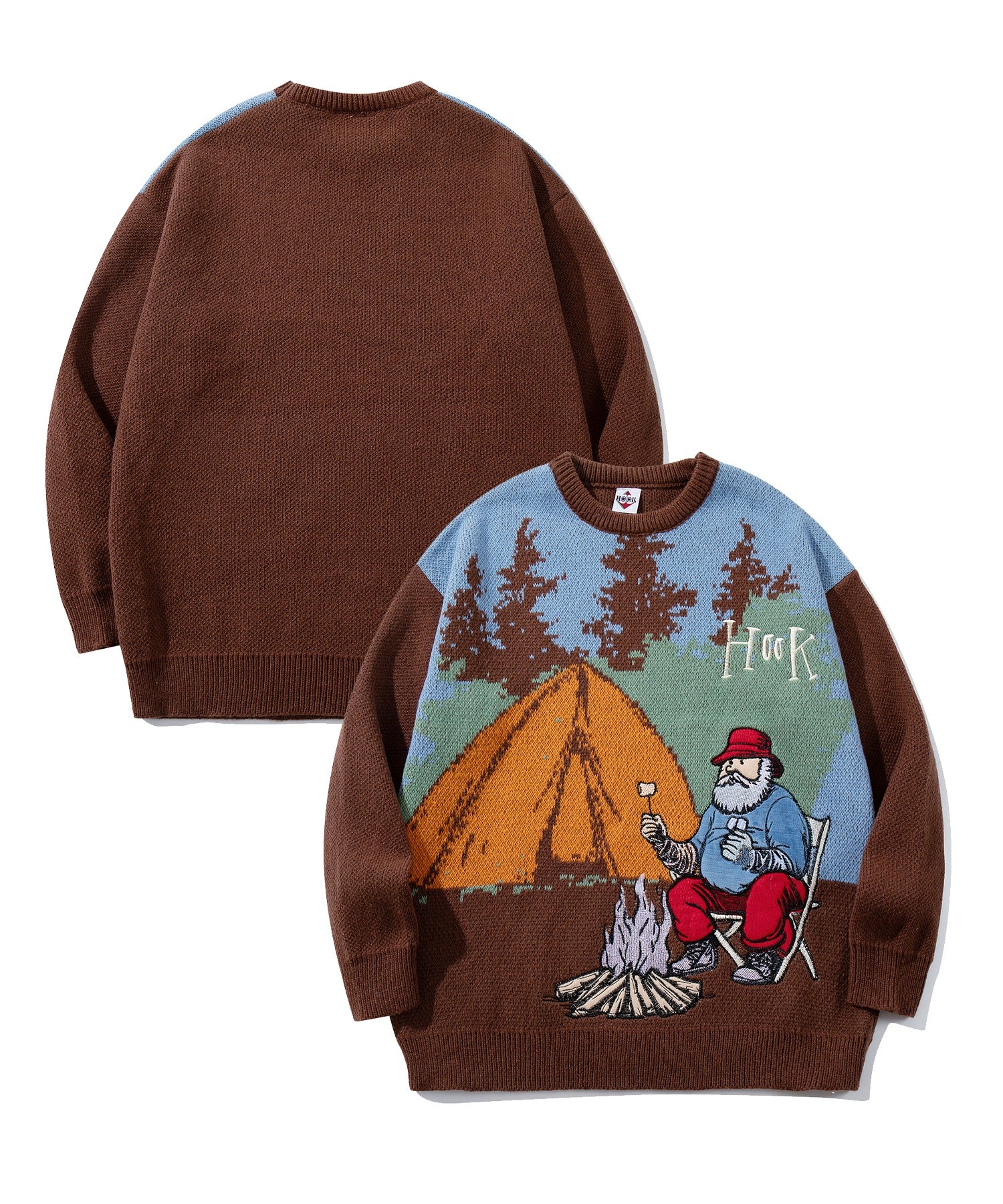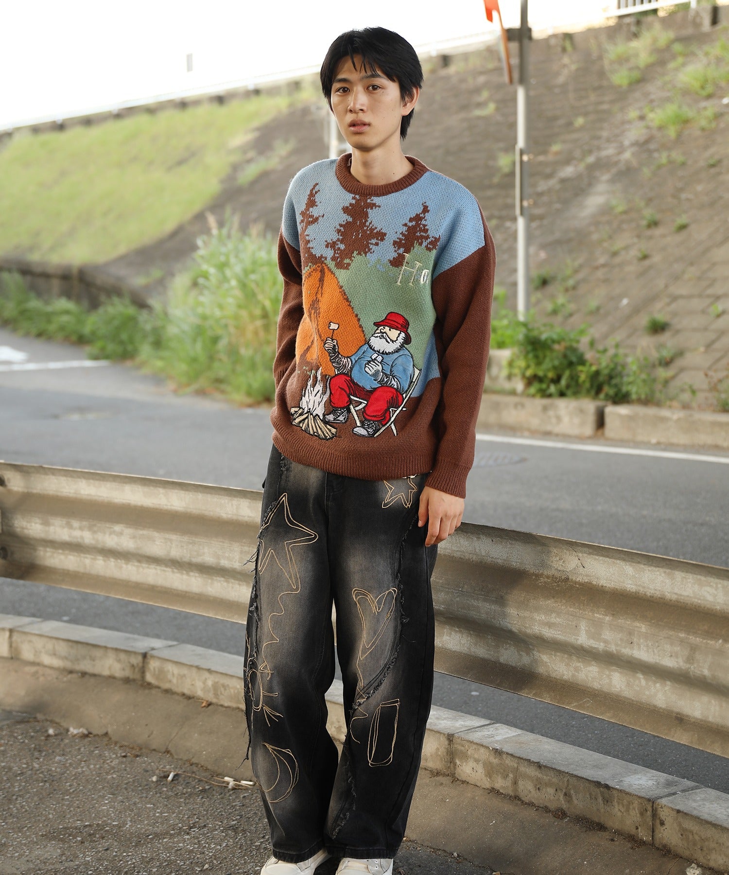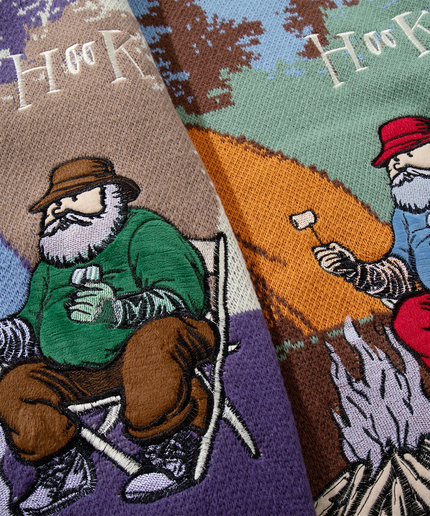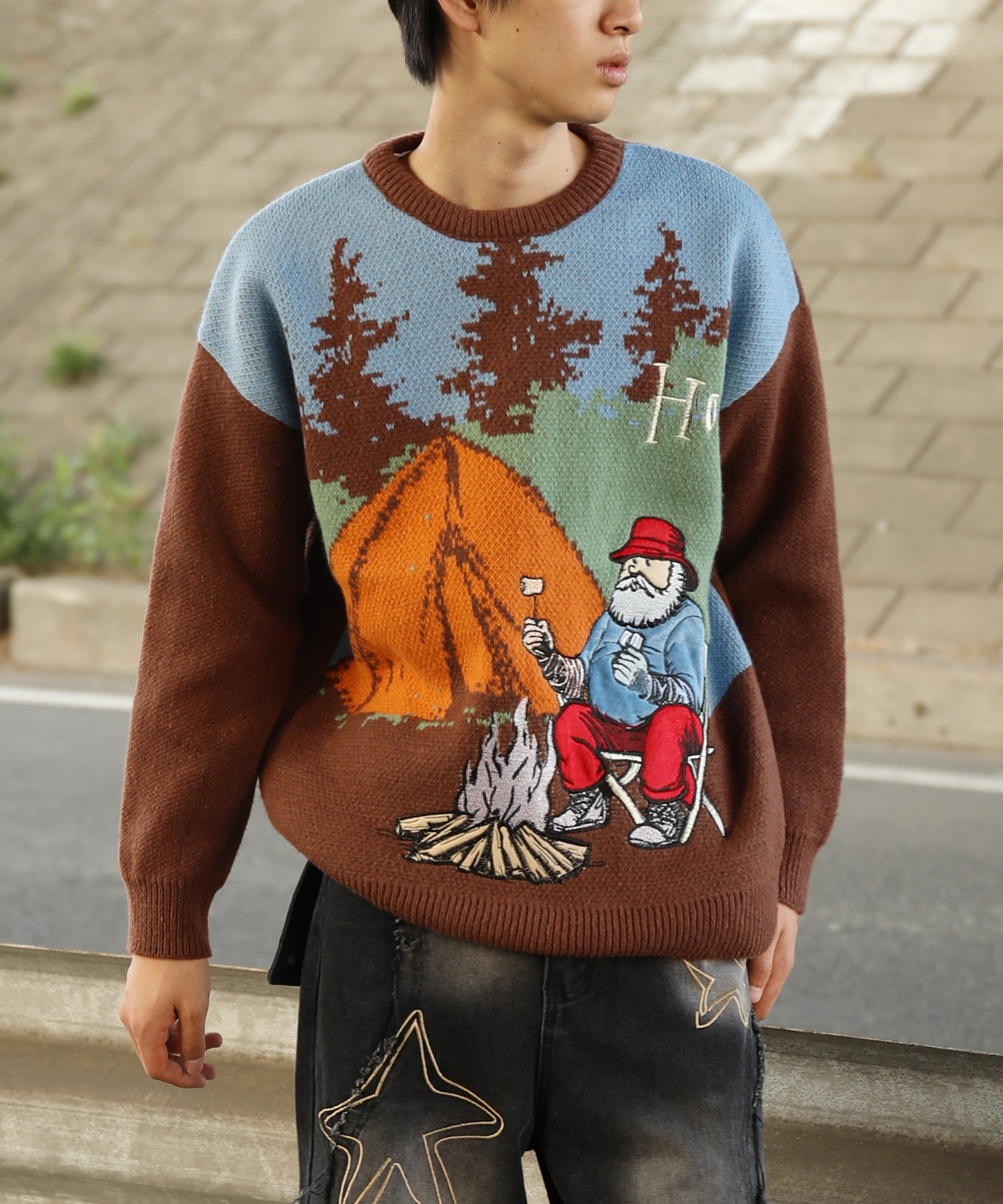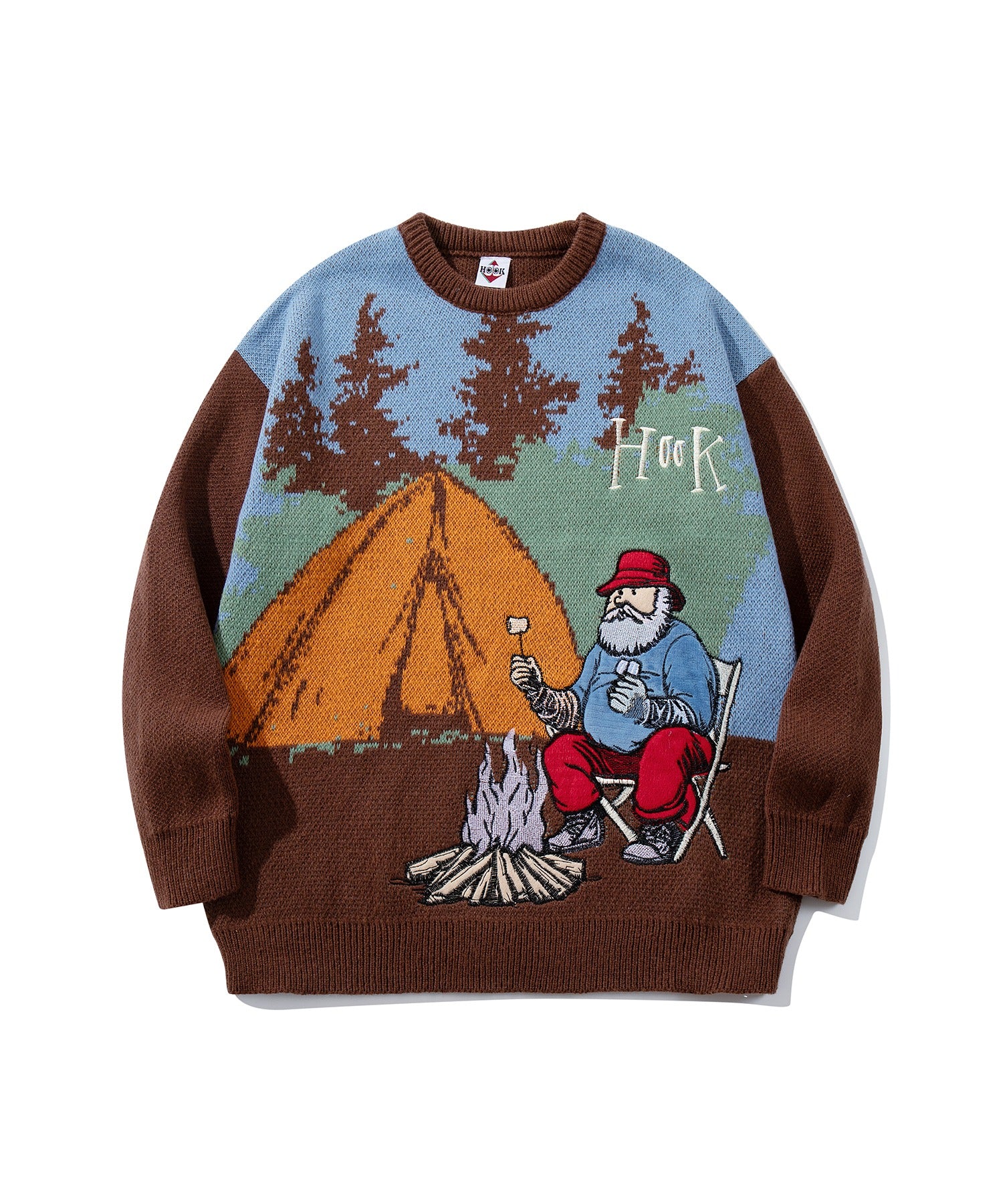 焚き火の前でくつろぐ「キャンプおじさん」が主役の、レトロポップな刺繍ニット。
