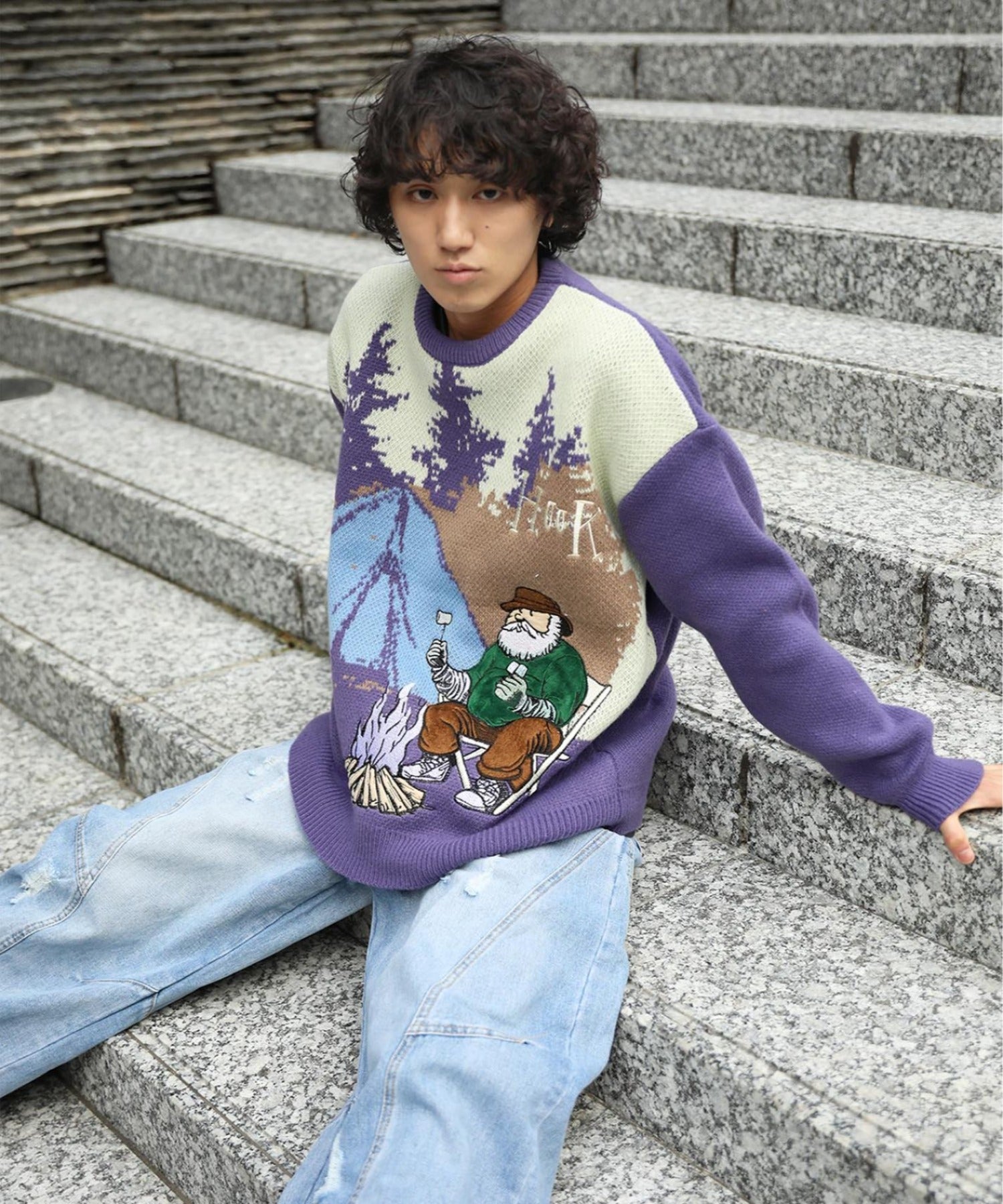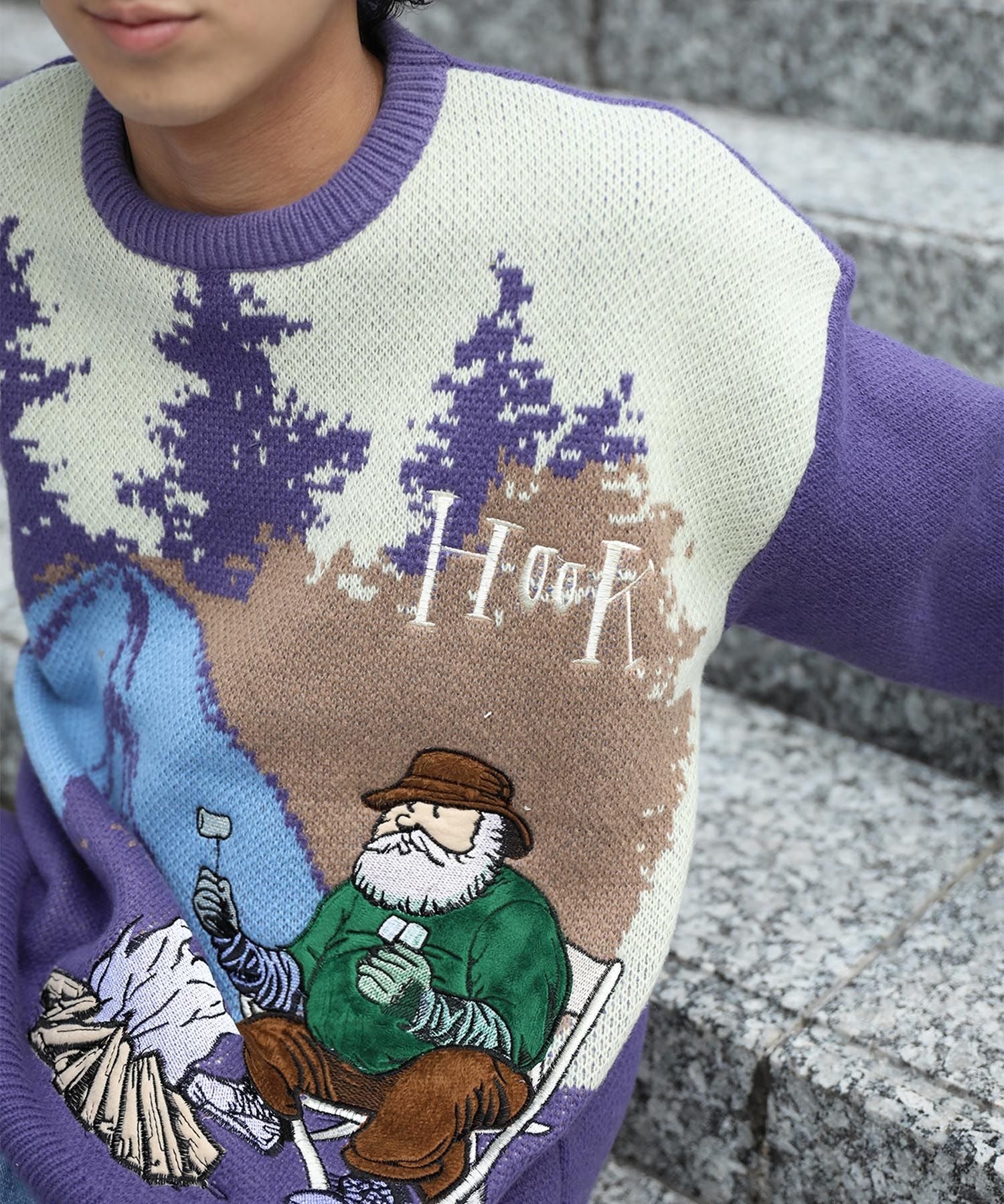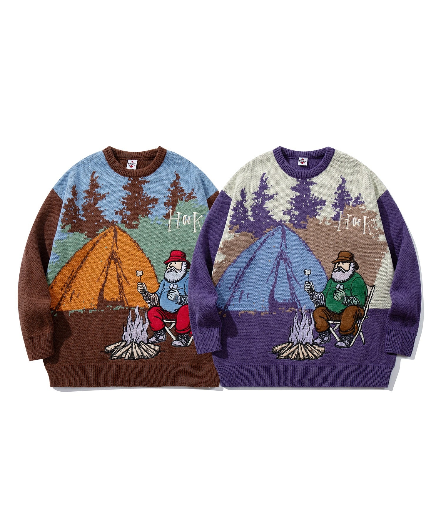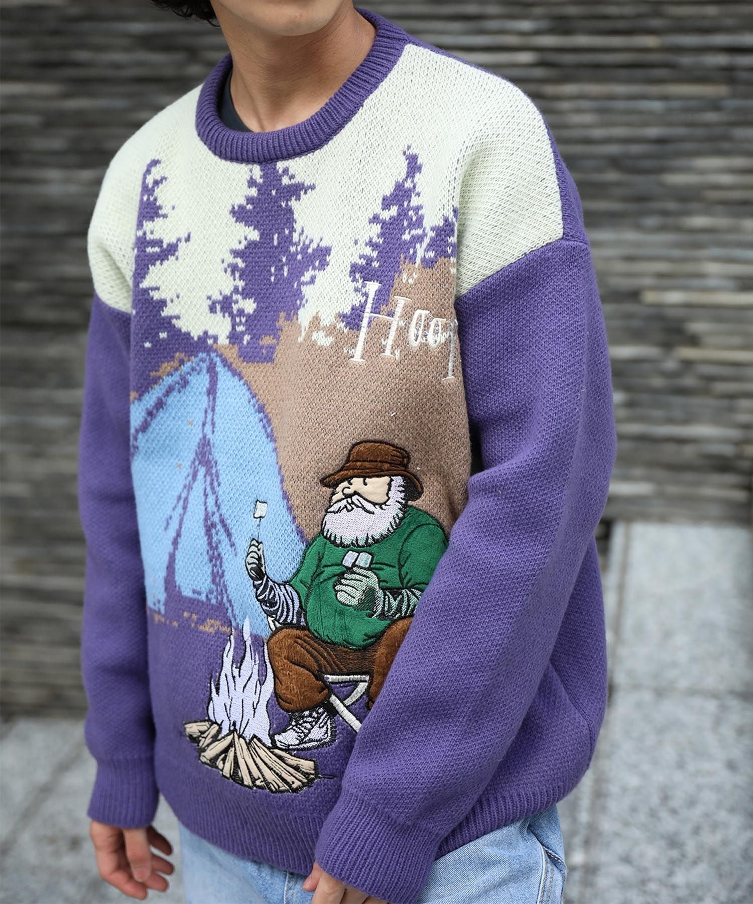 焚き火の前でくつろぐ「キャンプおじさん」が主役の、レトロポップな刺繍ニット。