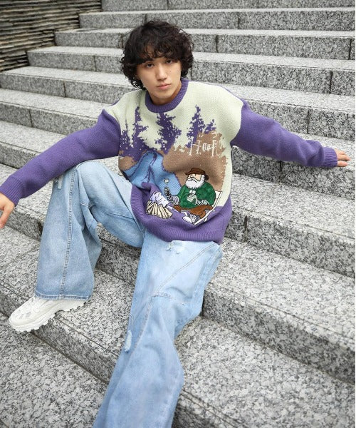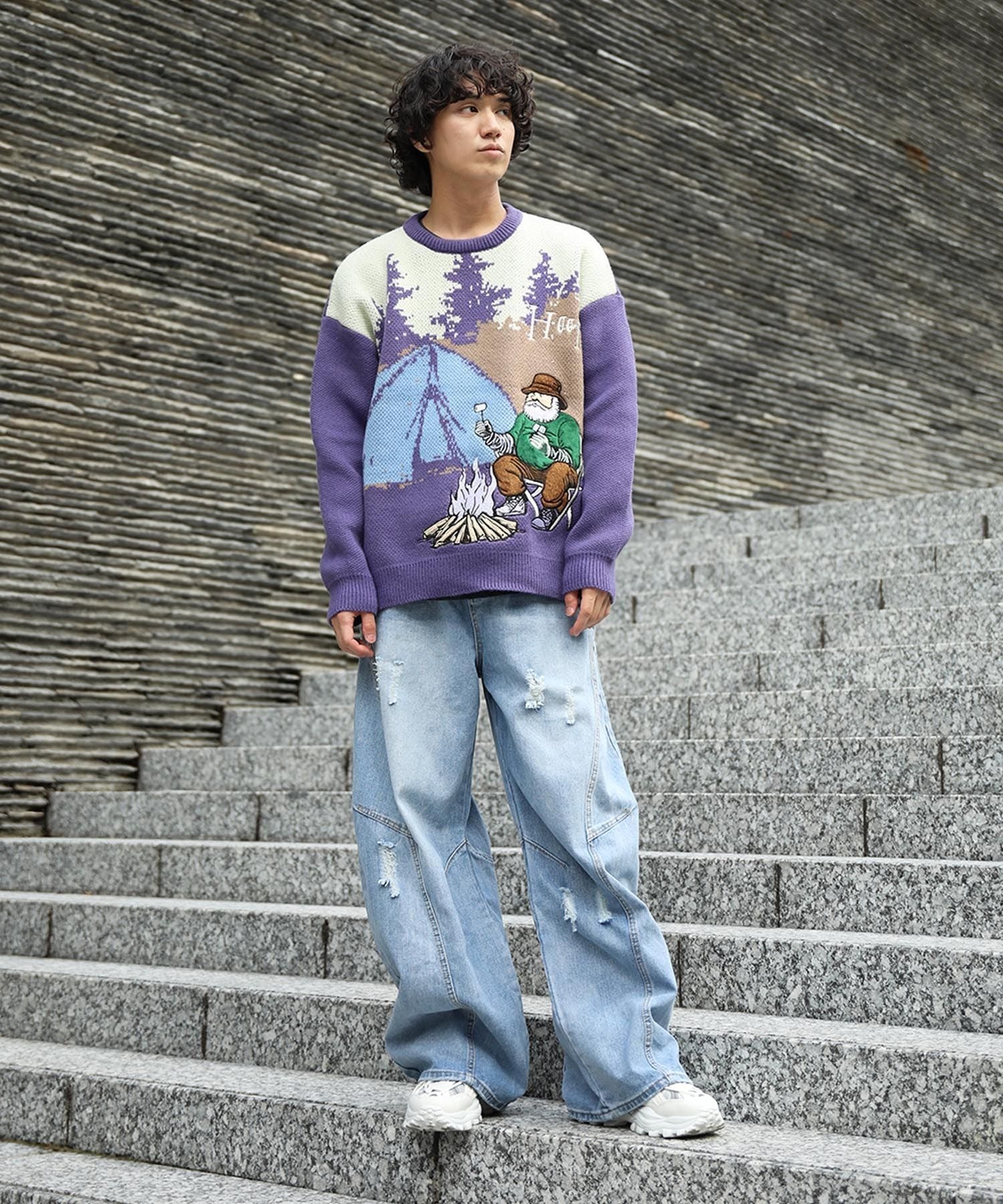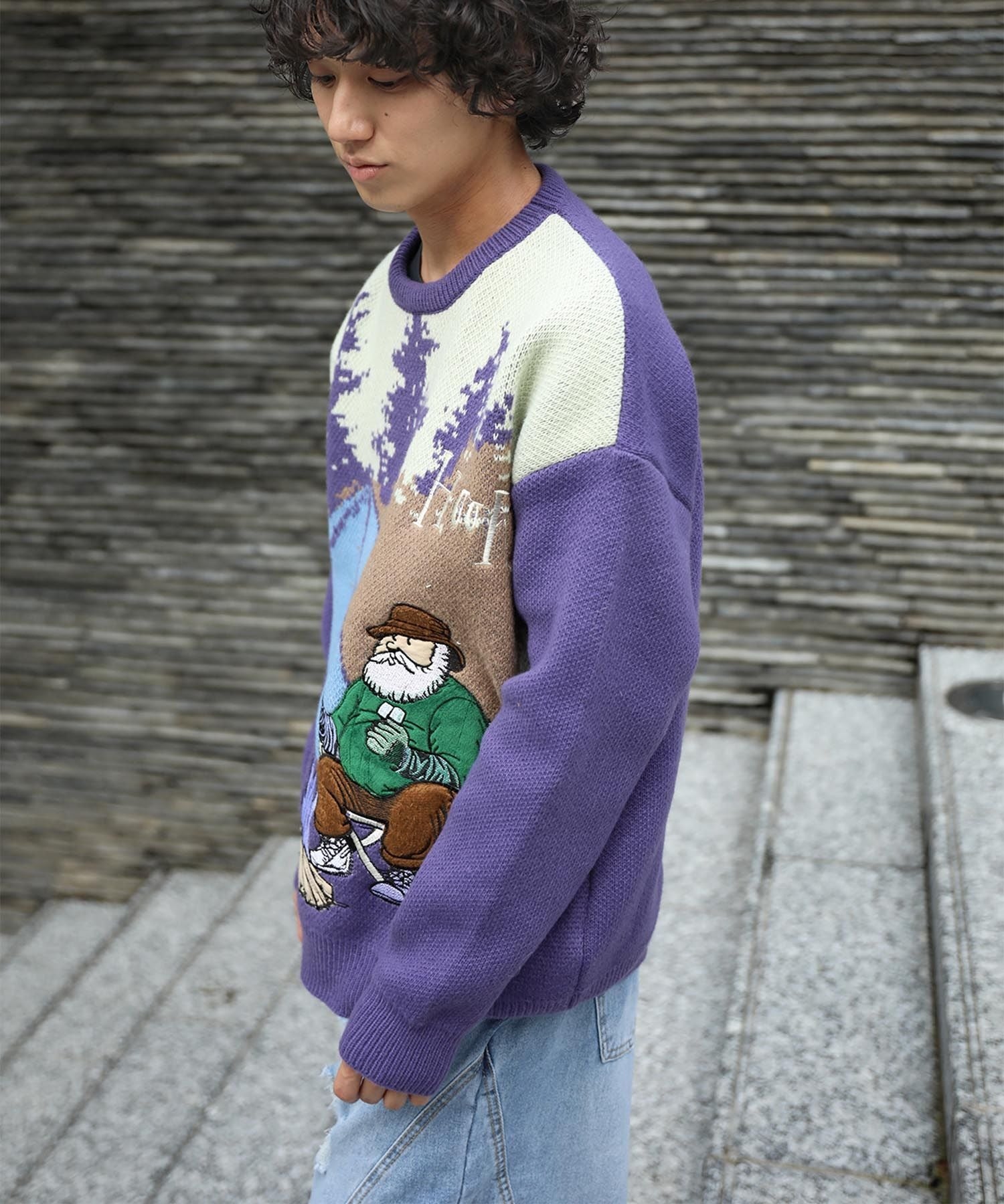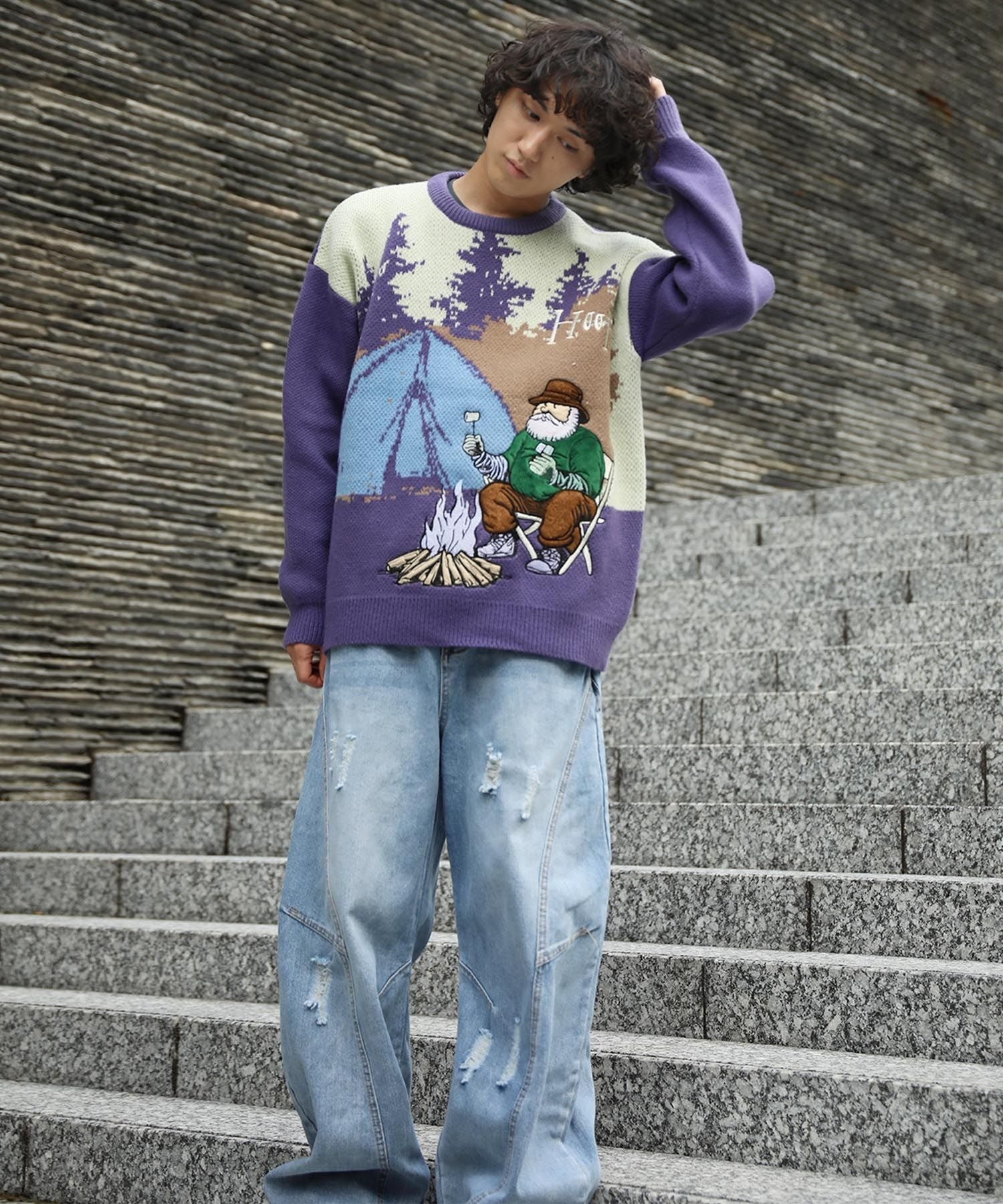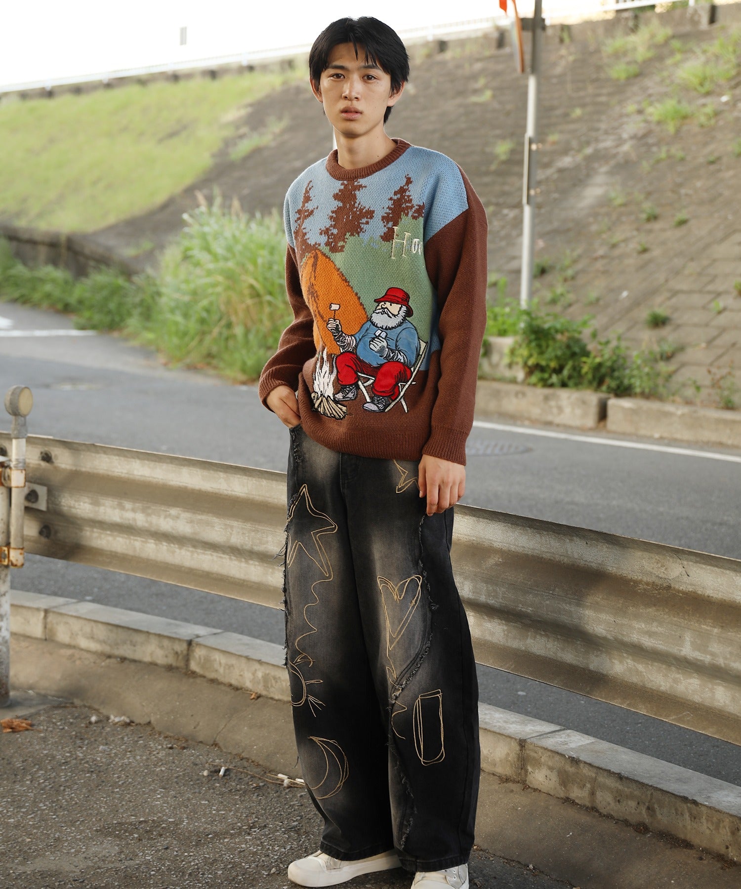 焚き火の前でくつろぐ「キャンプおじさん」が主役の、レトロポップな刺繍ニット。