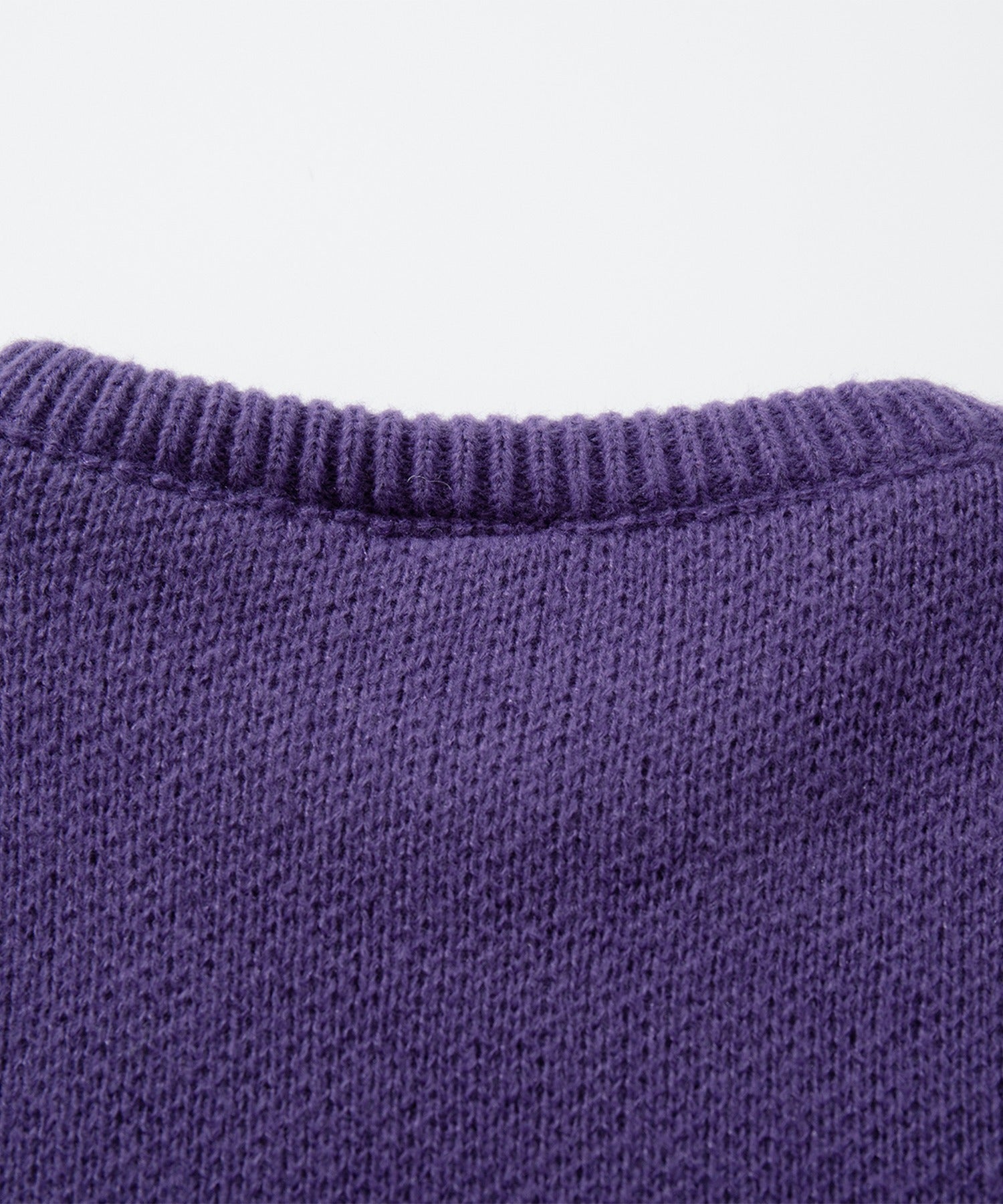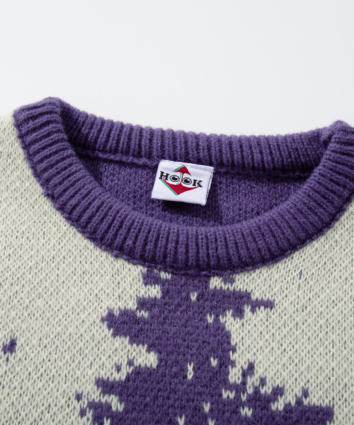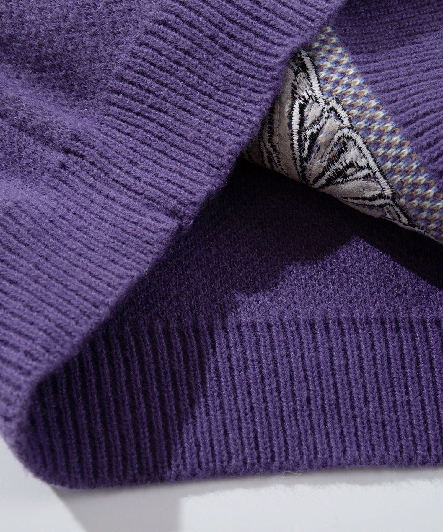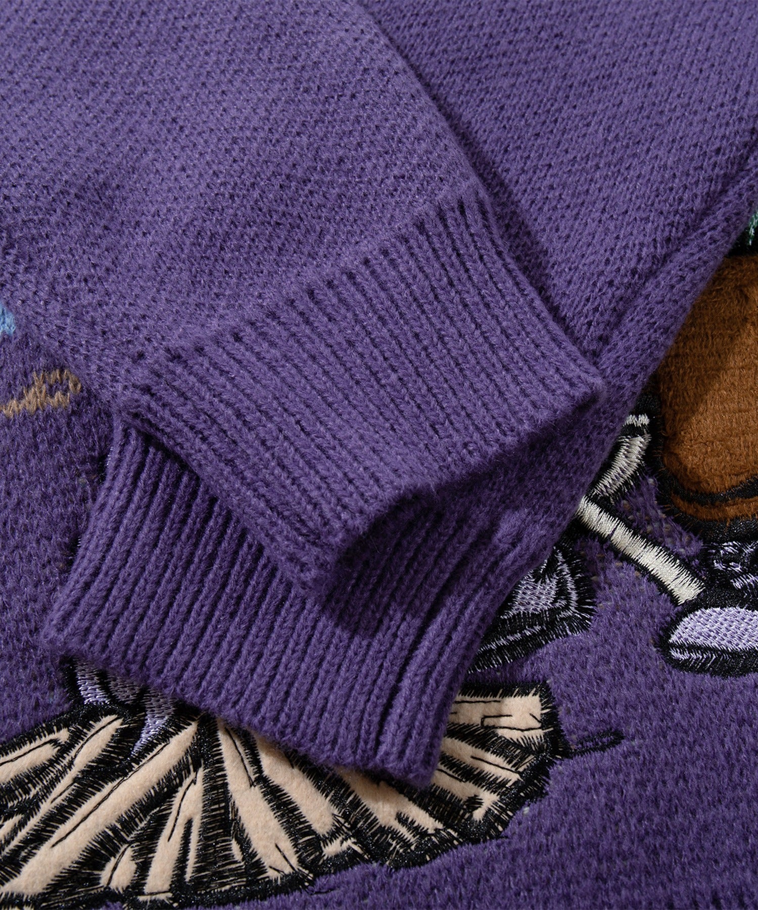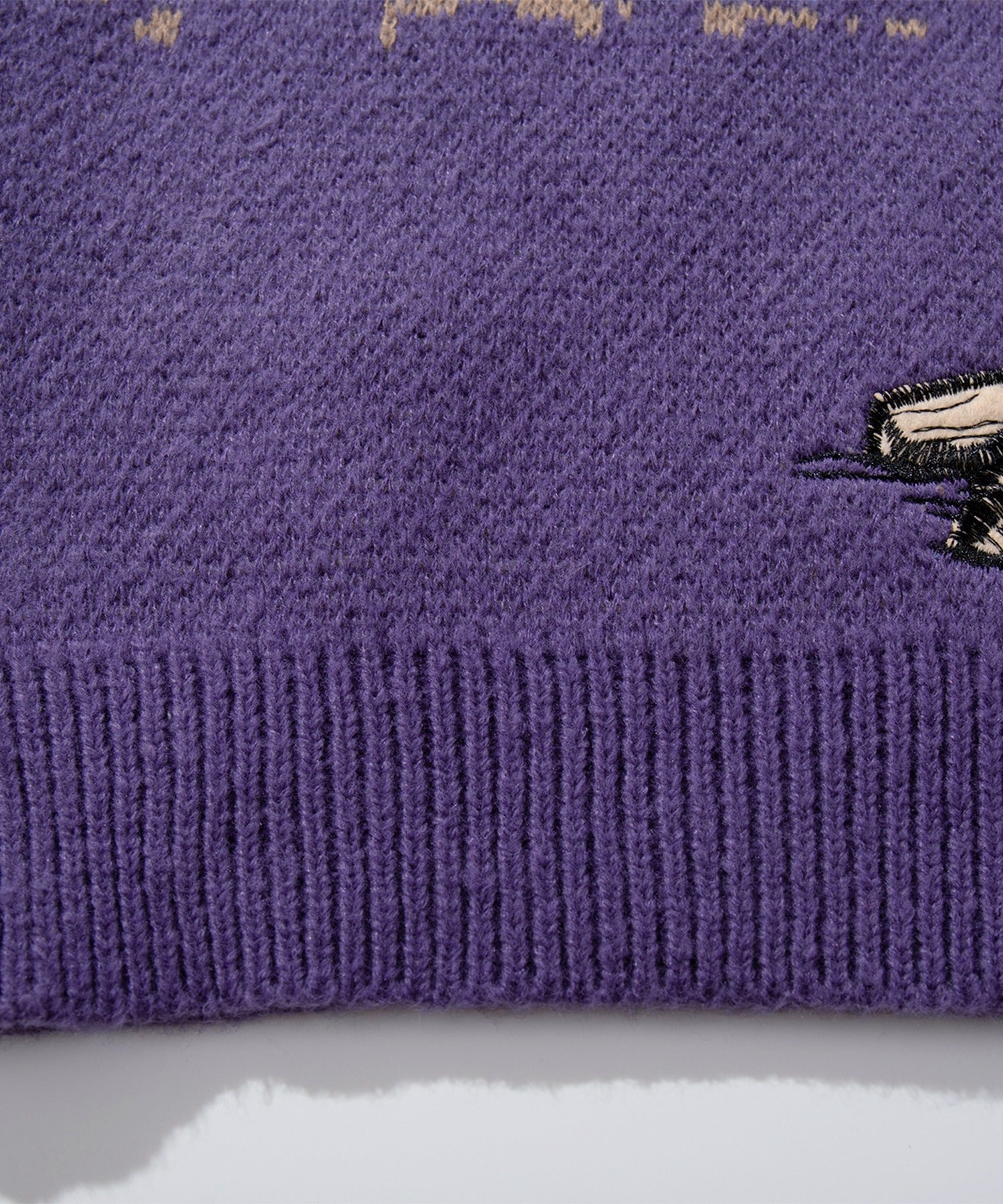 人物部分はベルベット貼りの布刺繍で仕上げられており、ふわっと立体的な存在感が生まれています。遊び心とクラフト感を両立させた、まさに"刺さる人にはぶっ刺さる"ニット。