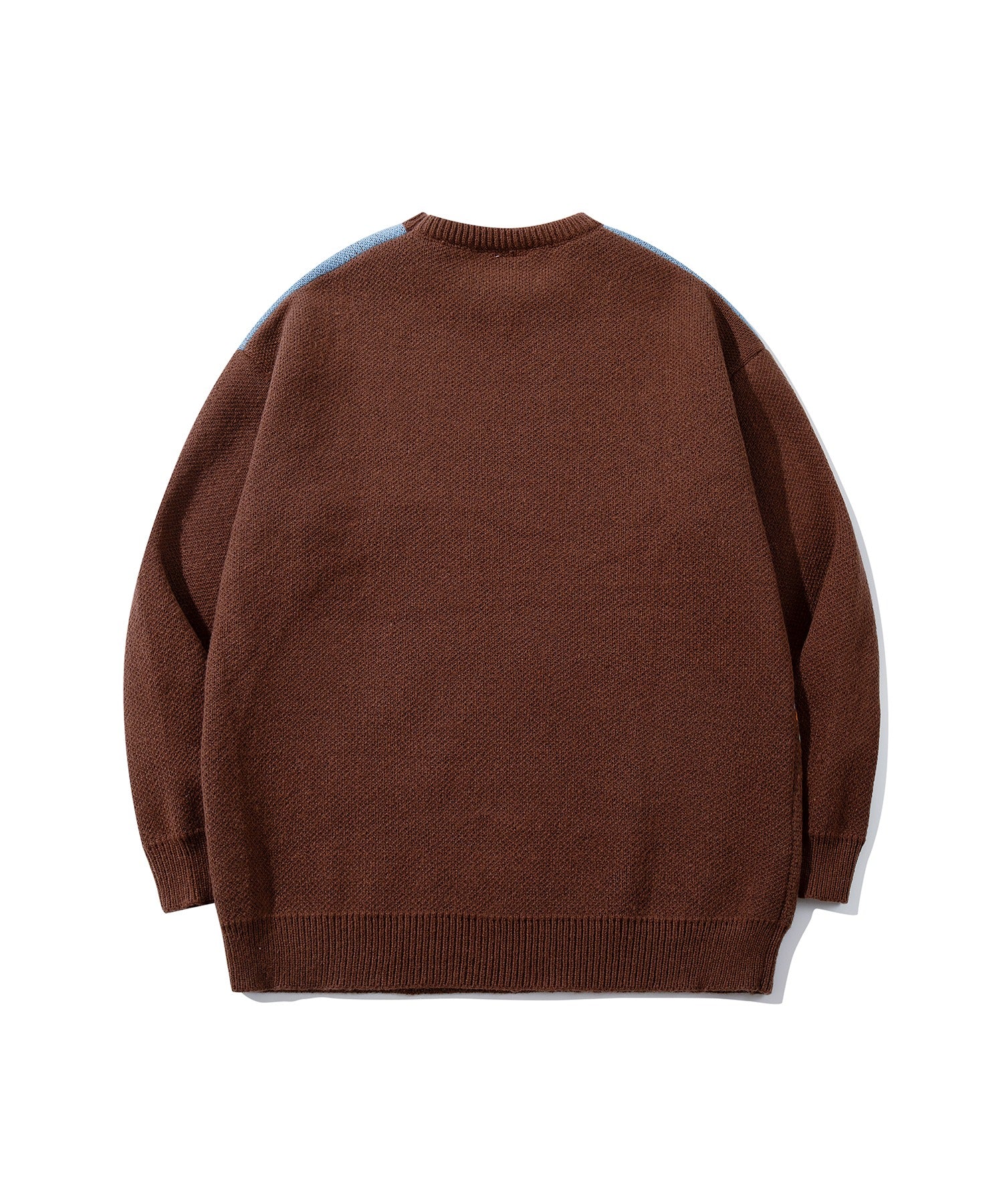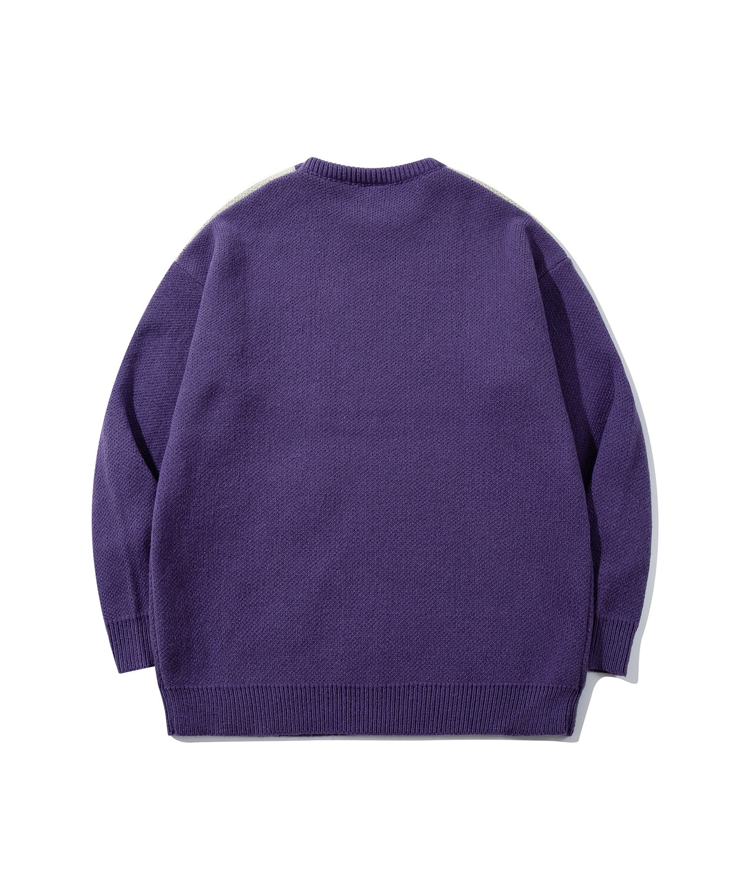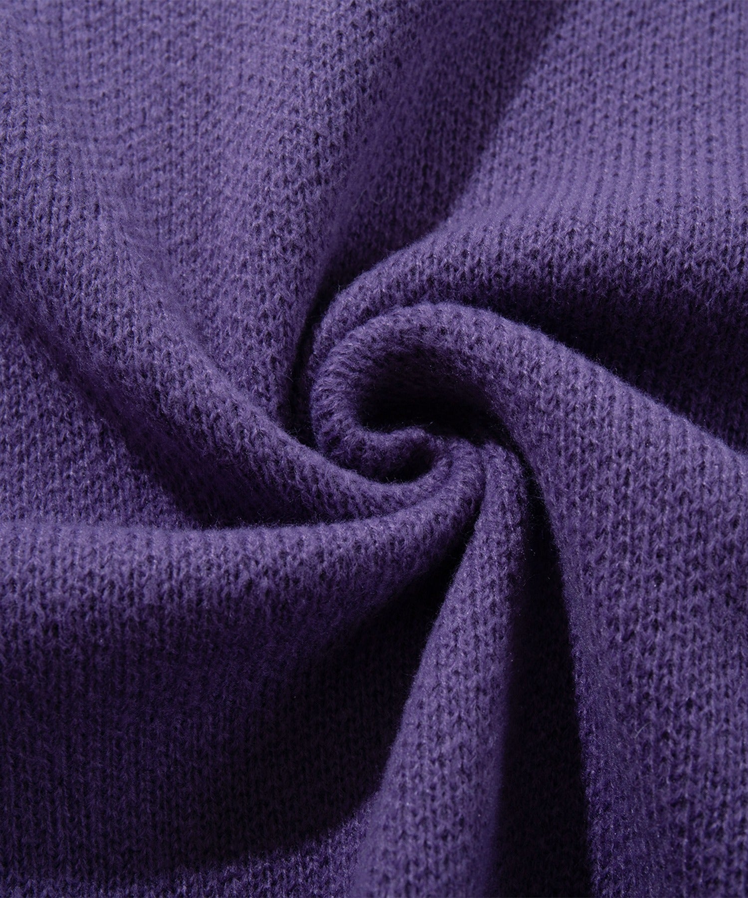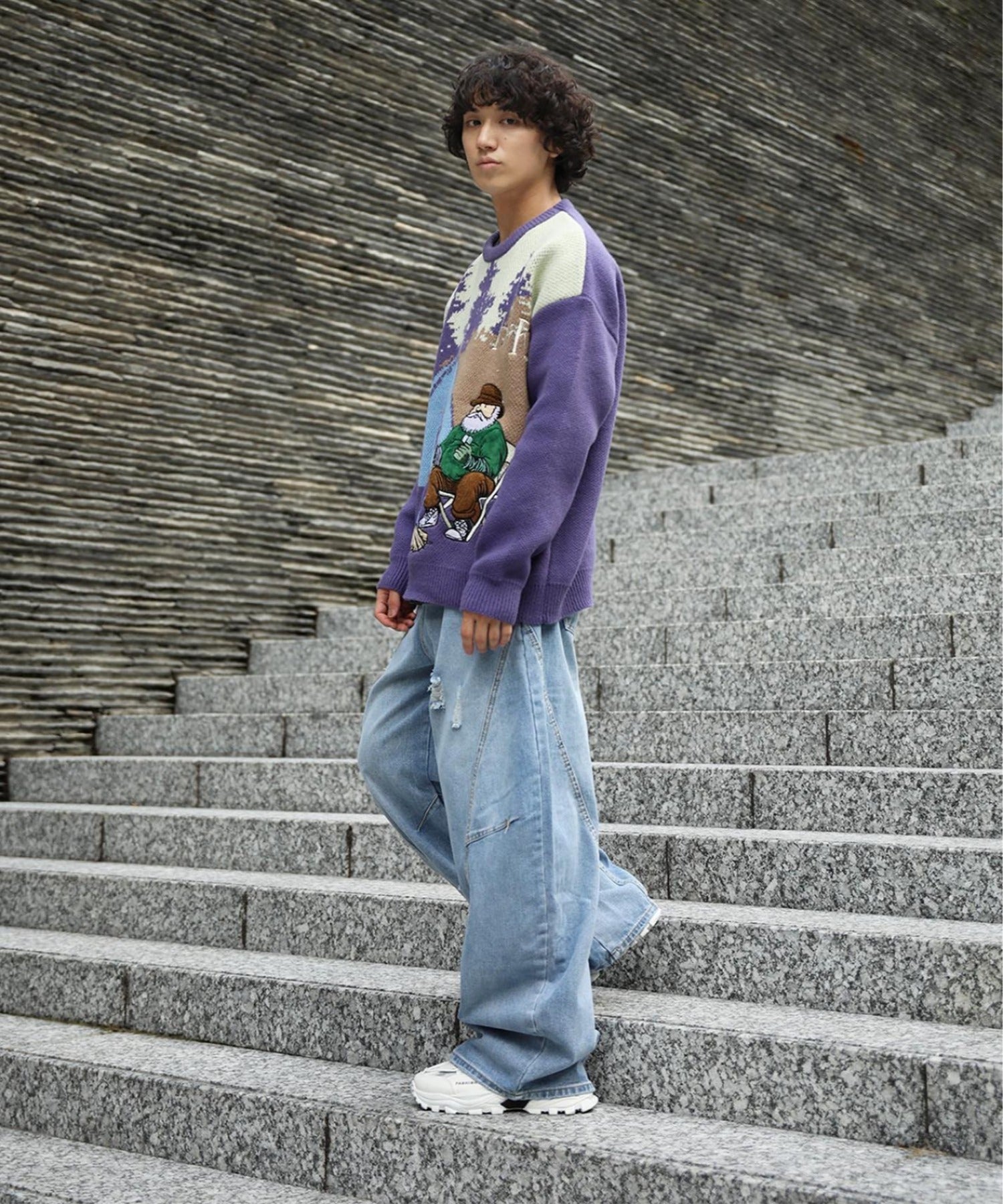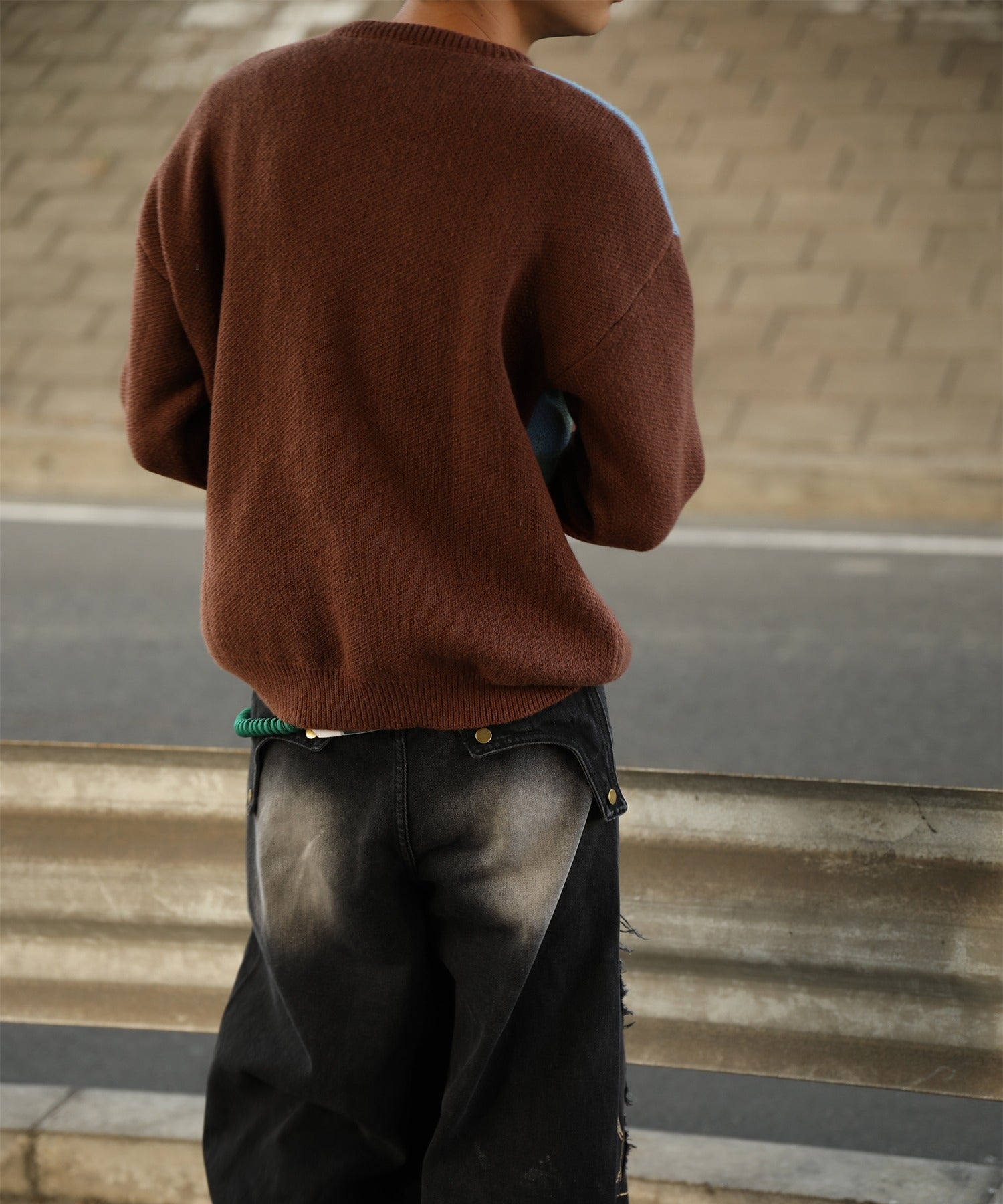 人物部分はベルベット貼りの布刺繍で仕上げられており、ふわっと立体的な存在感が生まれています。遊び心とクラフト感を両立させた、まさに"刺さる人にはぶっ刺さる"ニット。