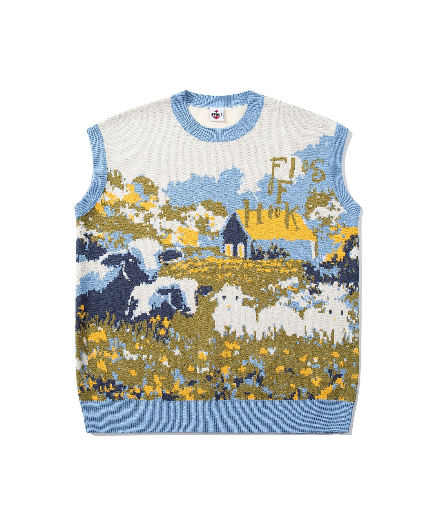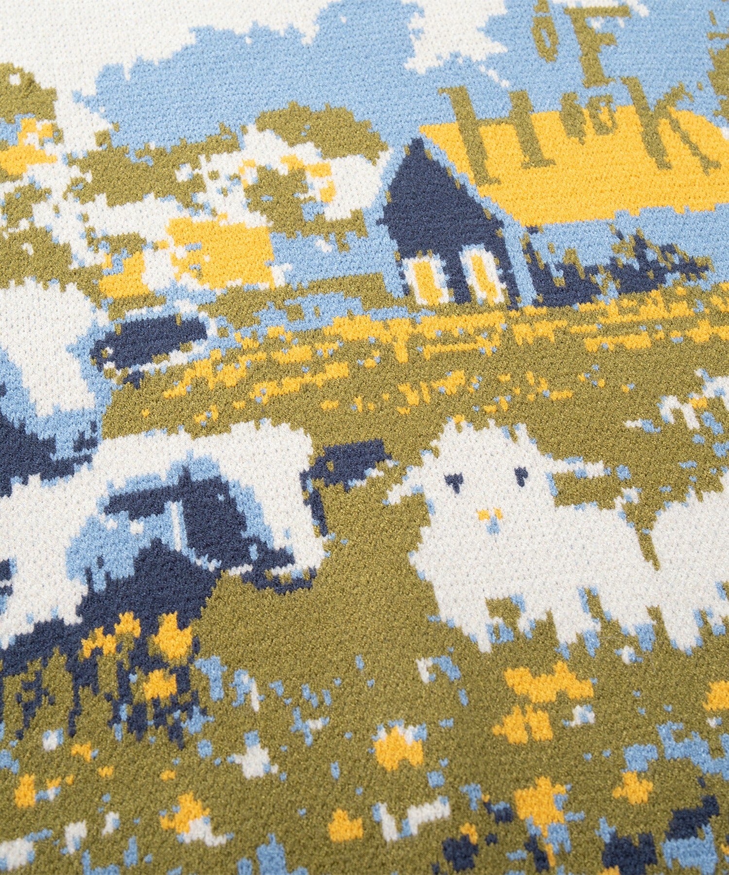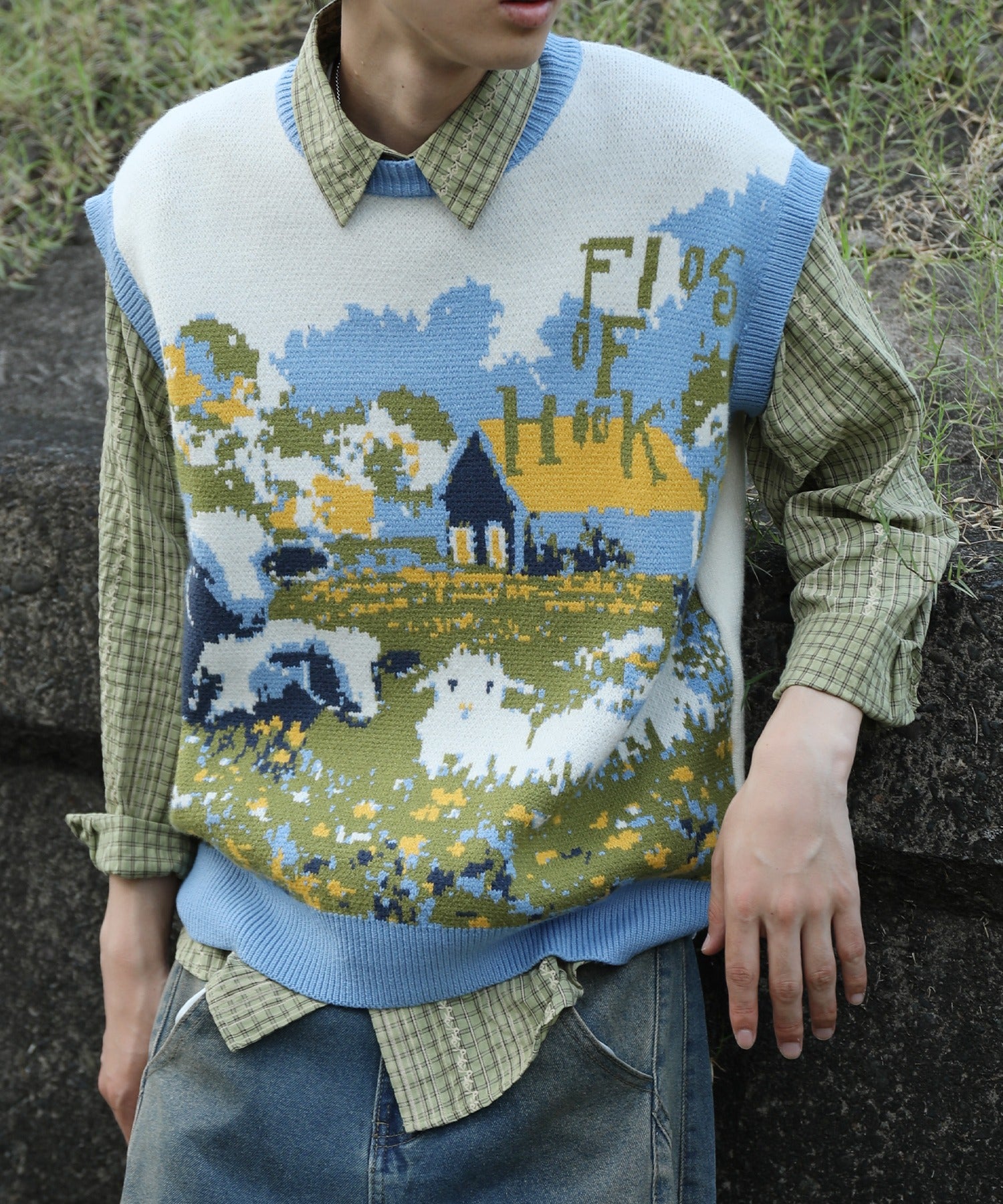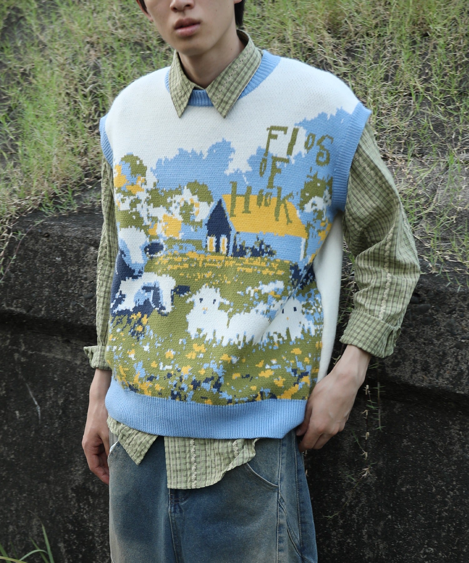 まるで一枚の絵画のような、のどかな牧場風景を編み込んだグラフィックニットベスト。