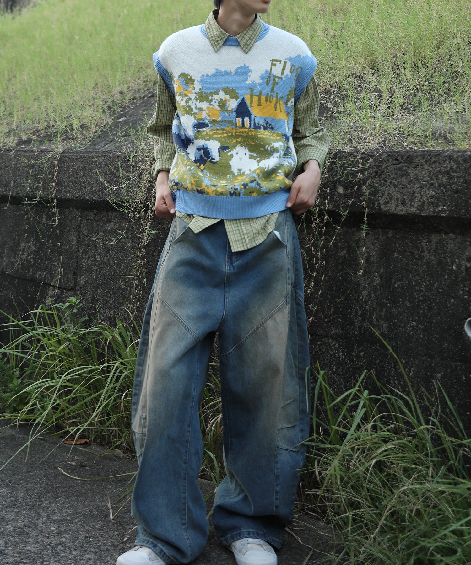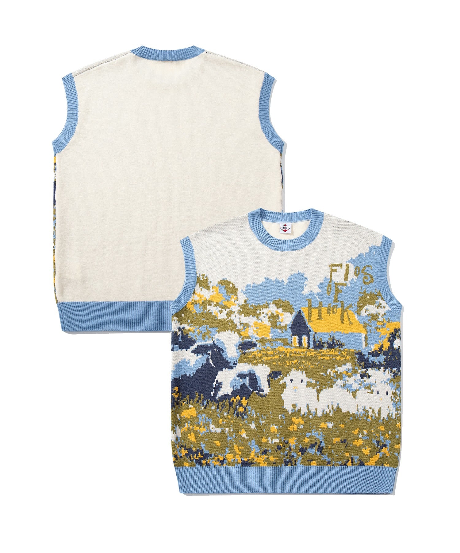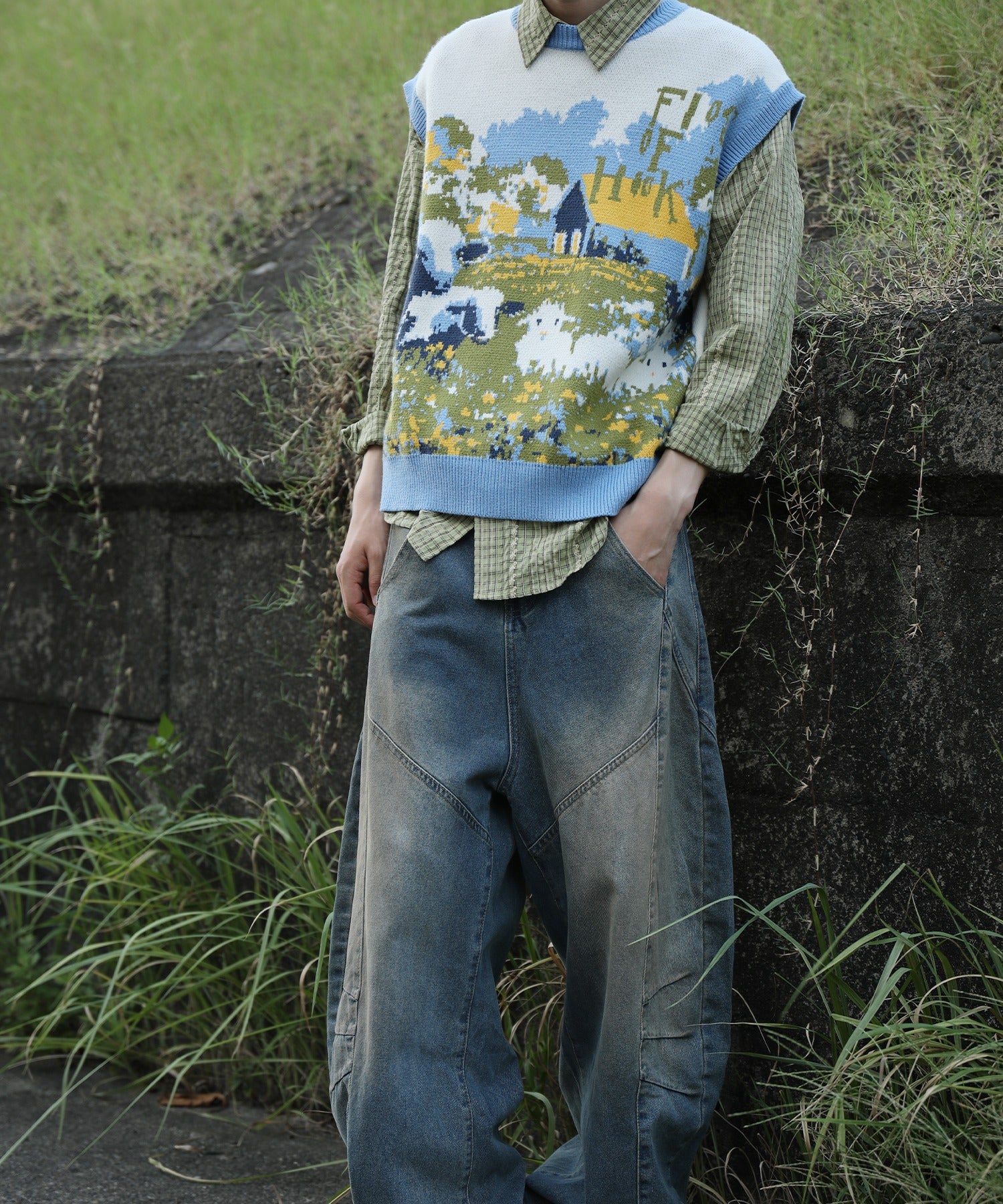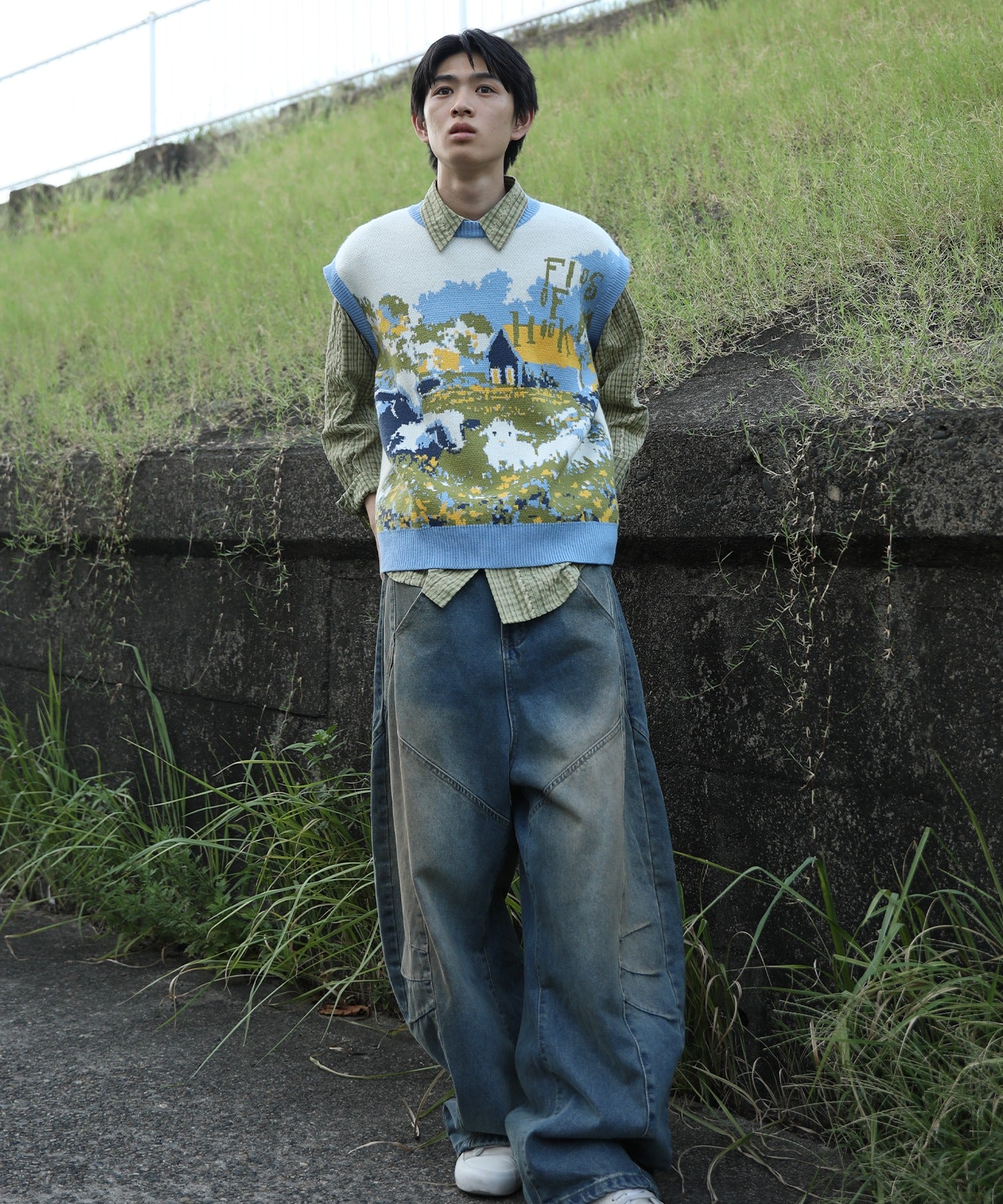 まるで一枚の絵画のような、のどかな牧場風景を編み込んだグラフィックニットベスト。