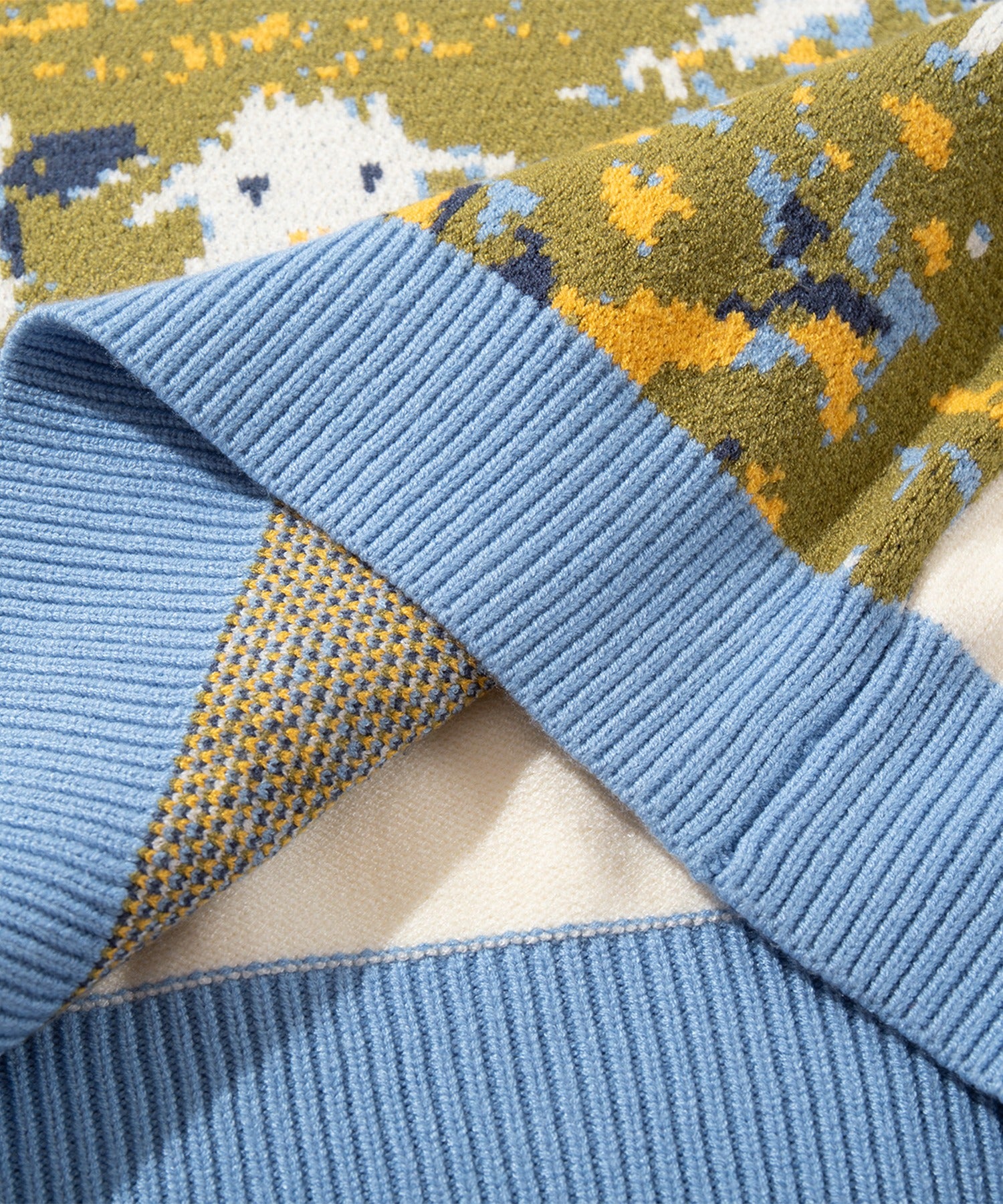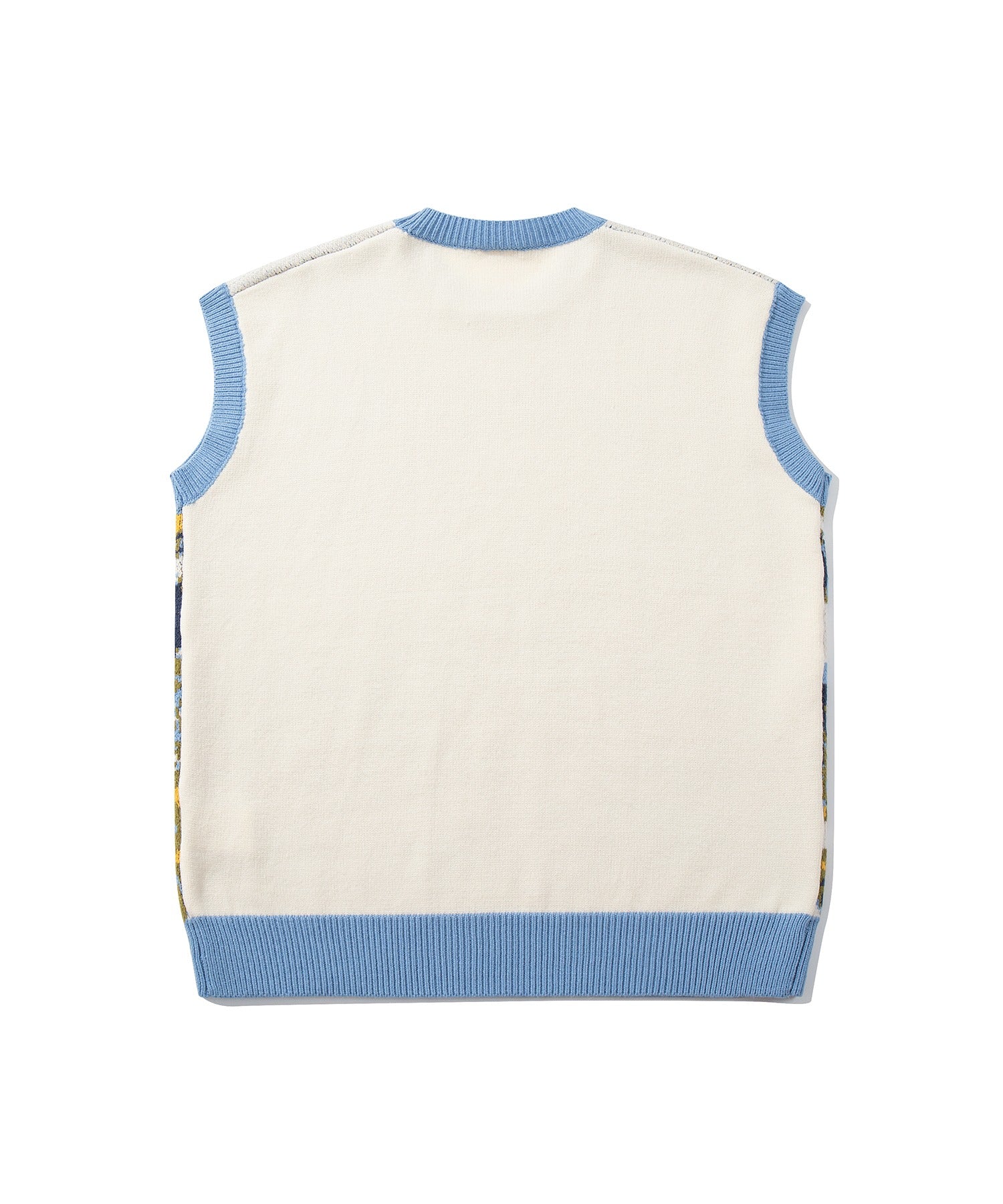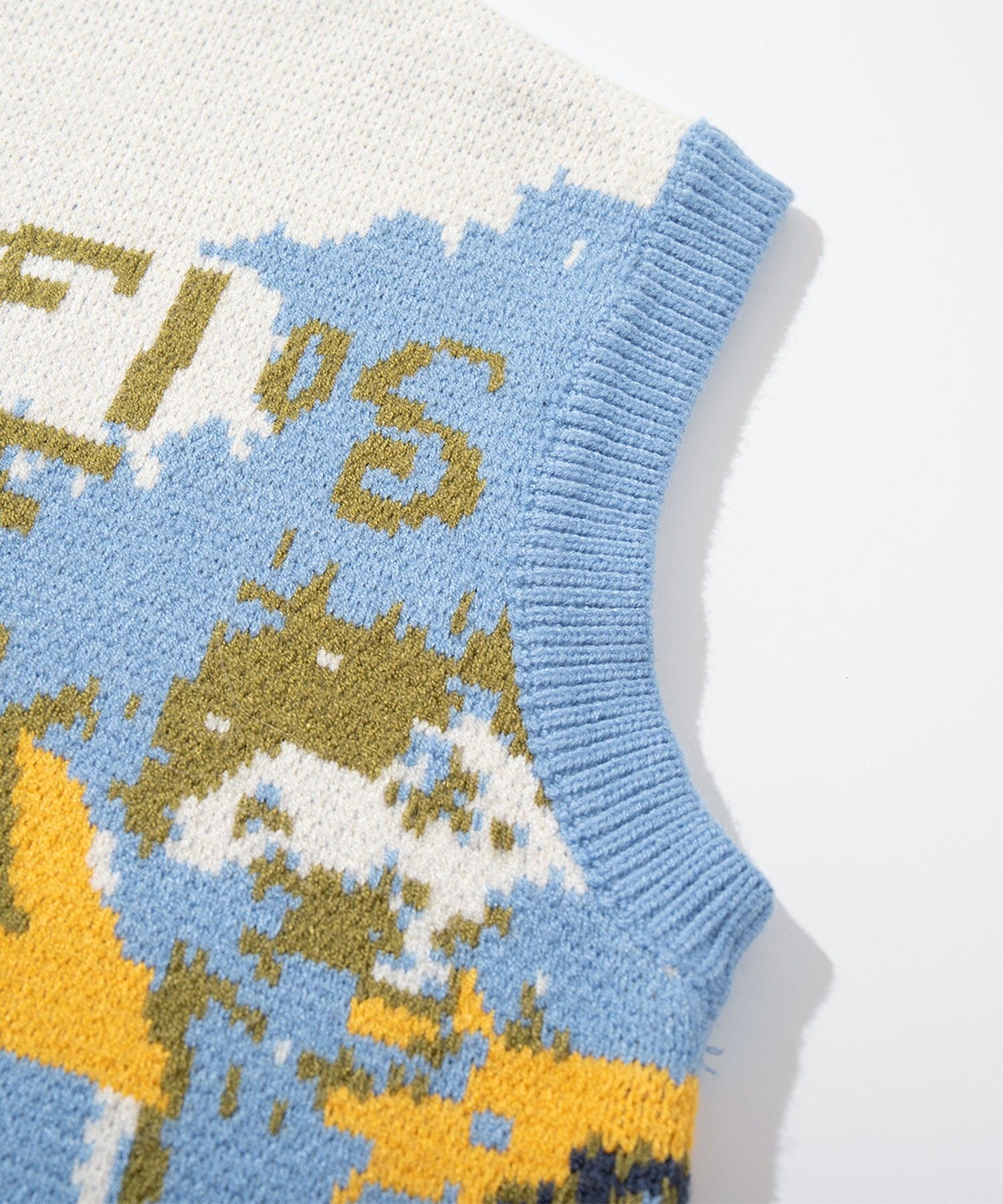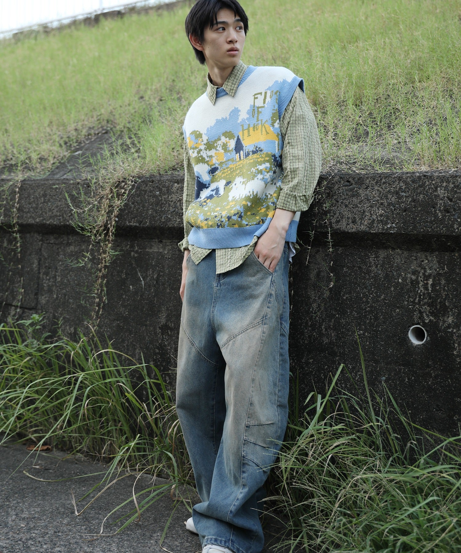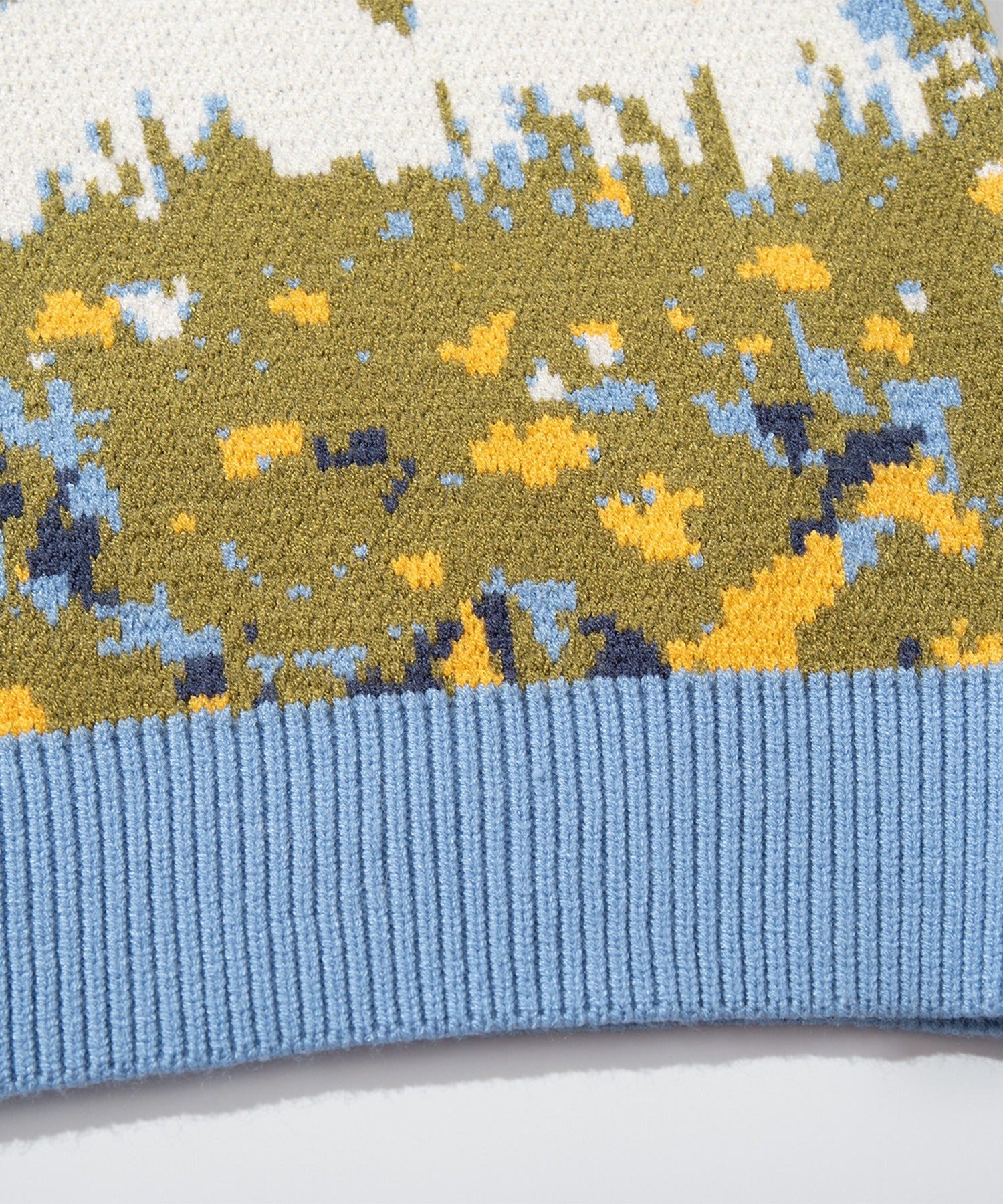 まるで一枚の絵画のような、のどかな牧場風景を編み込んだグラフィックニットベスト。