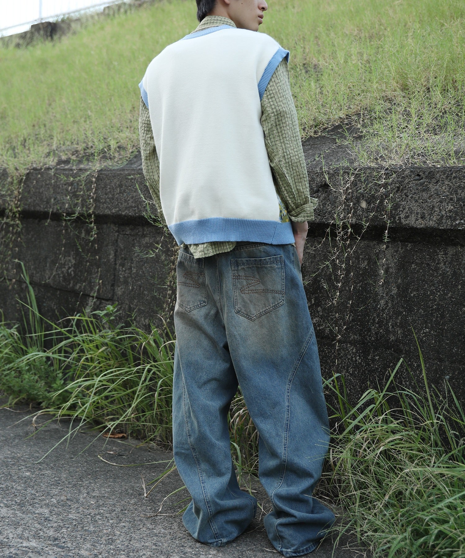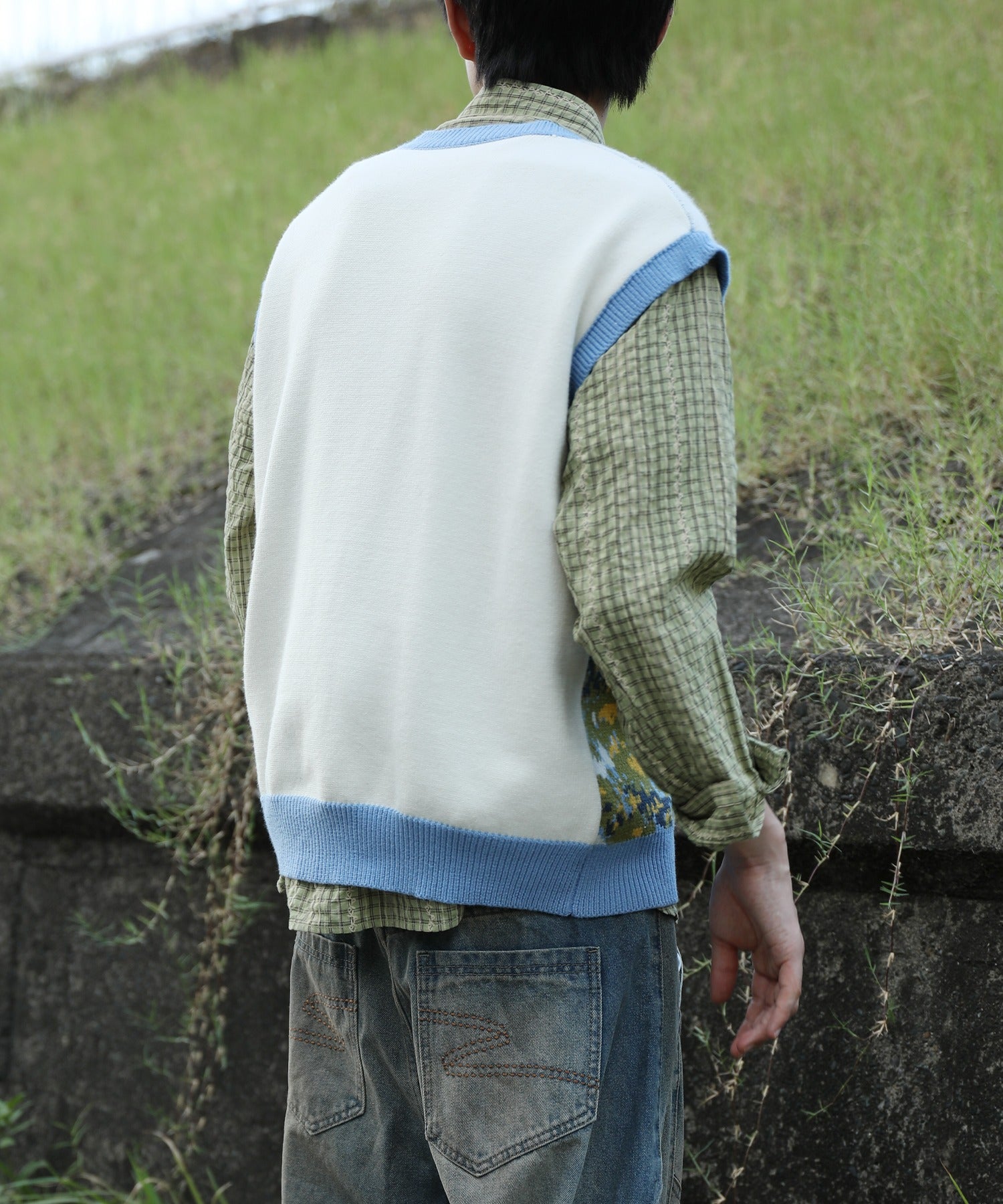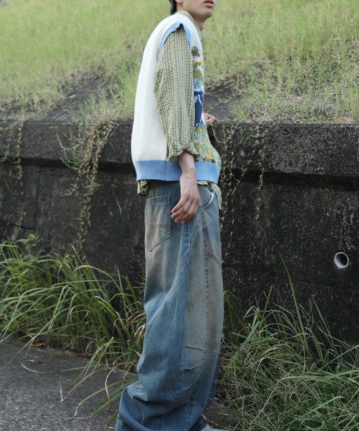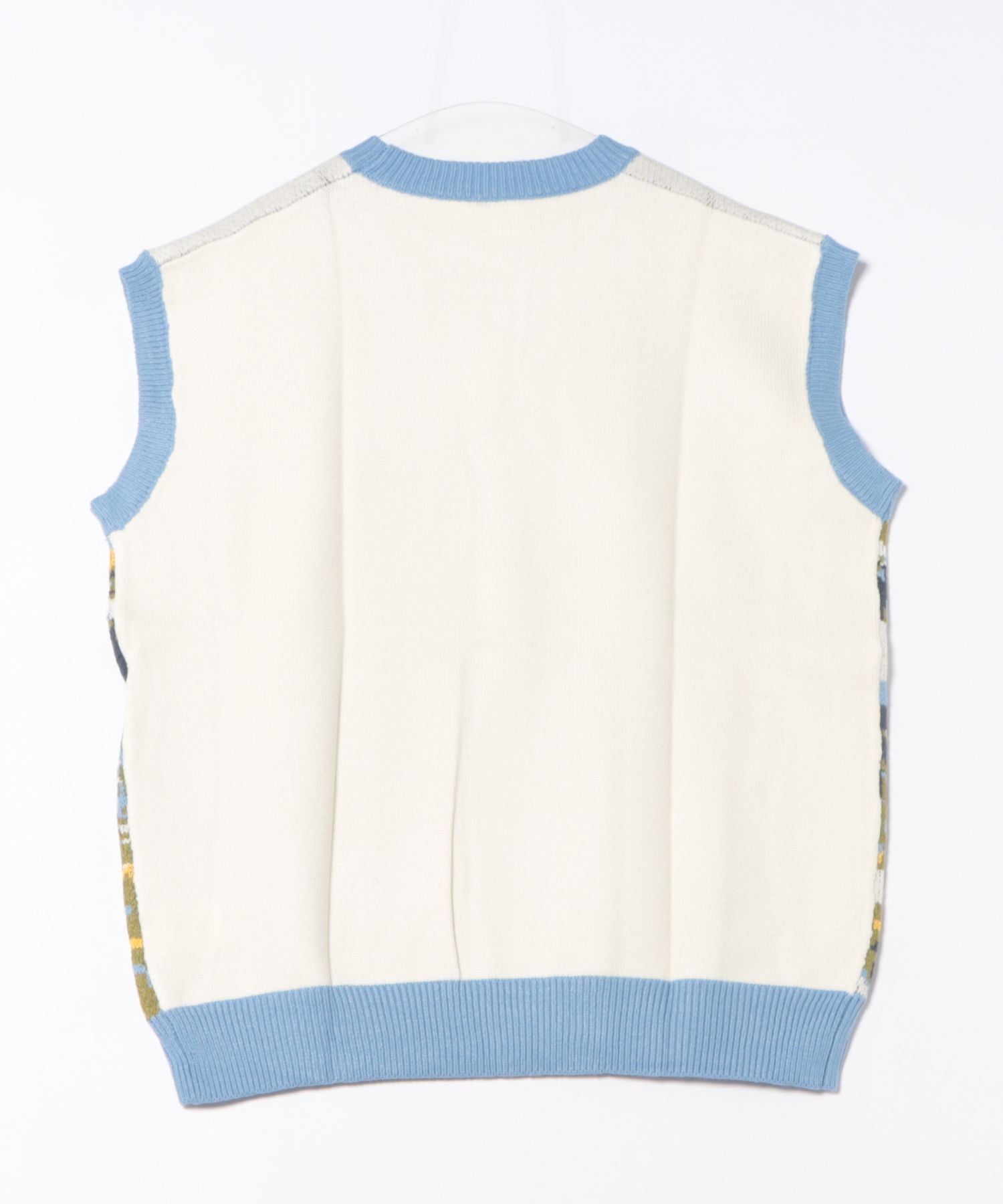 まるで一枚の絵画のような、のどかな牧場風景を編み込んだグラフィックニットベスト。