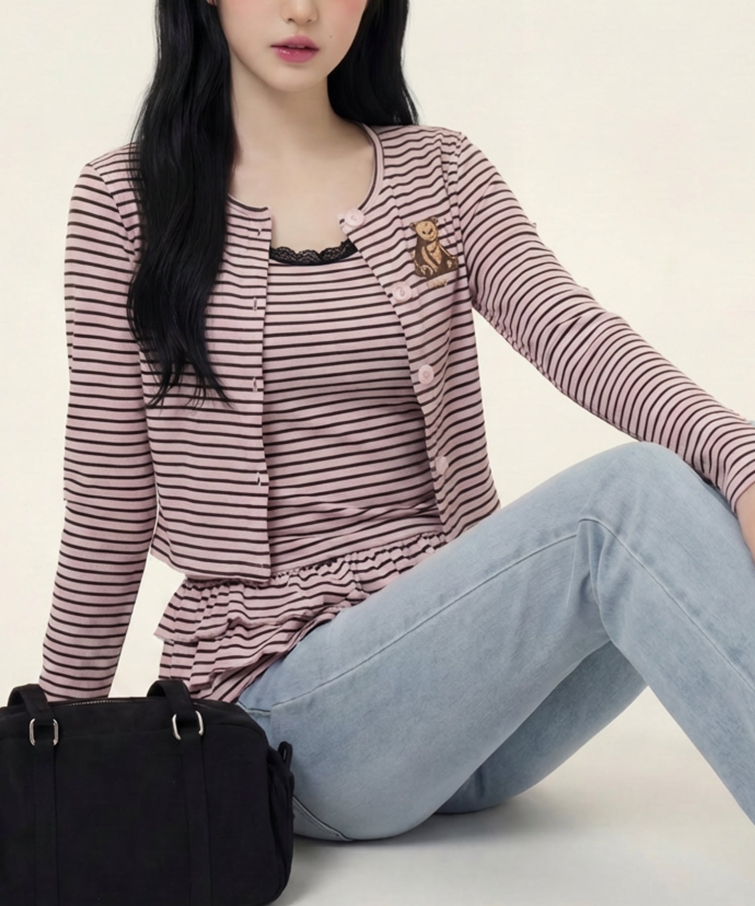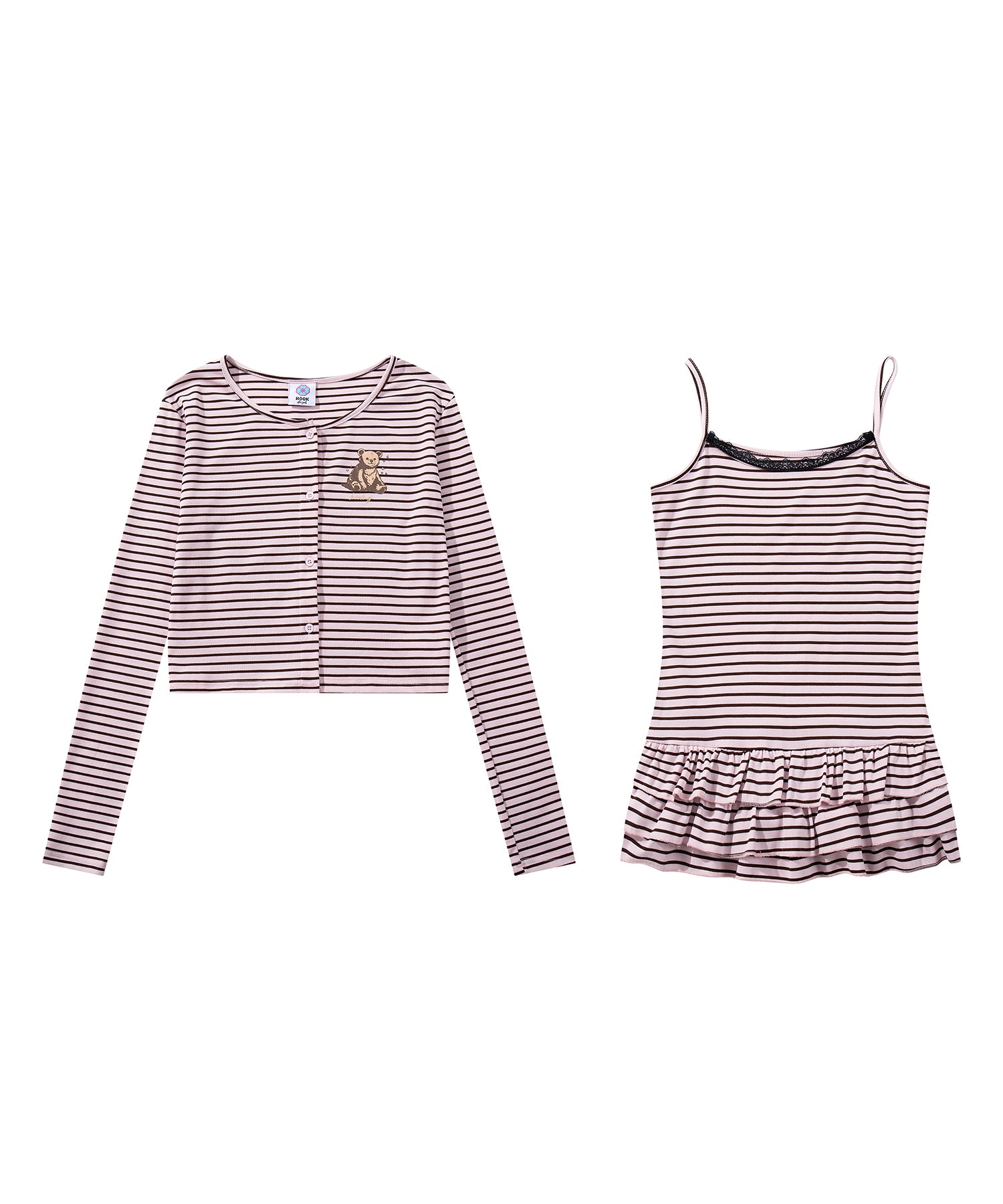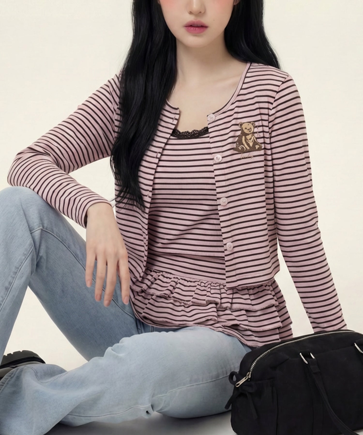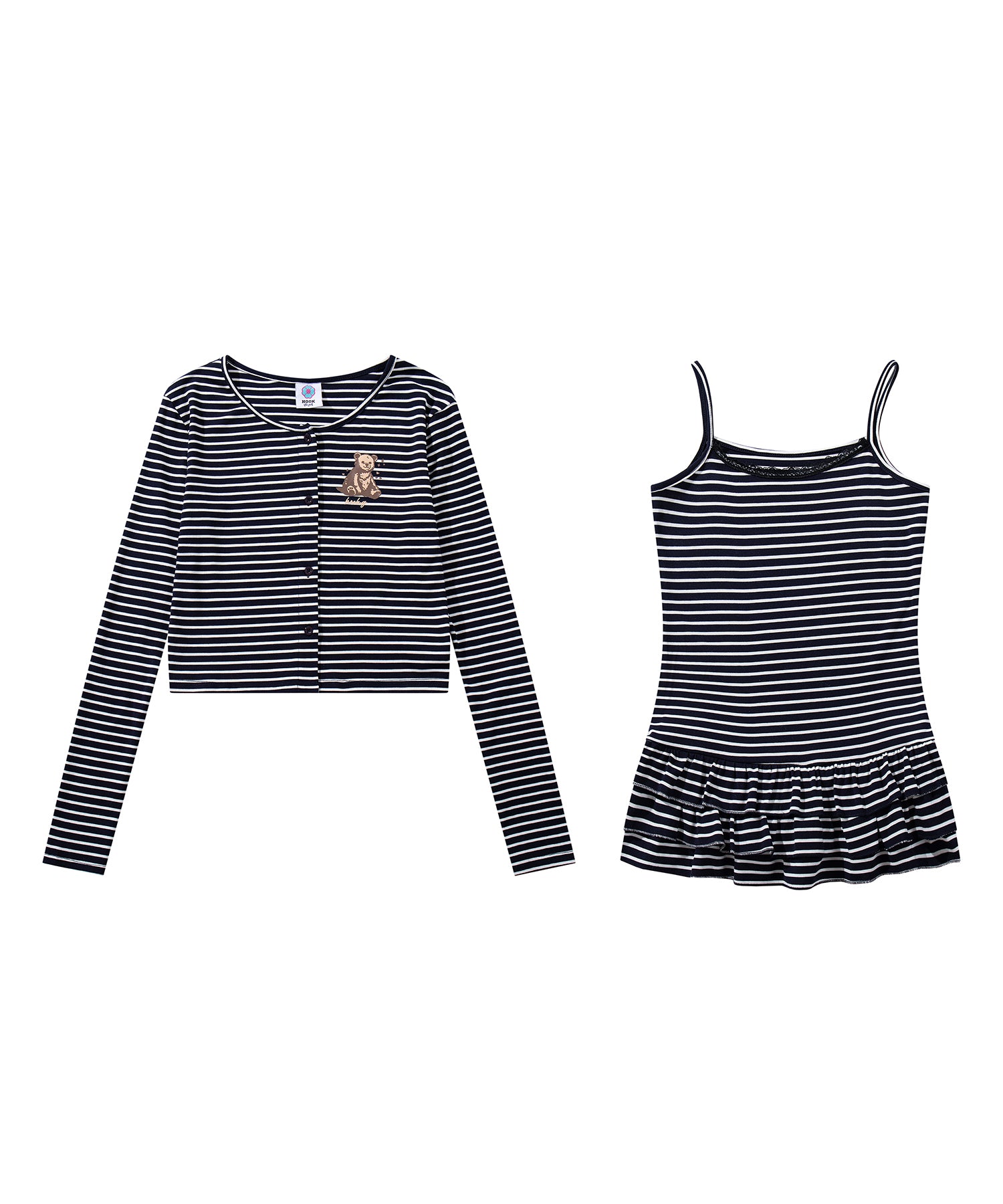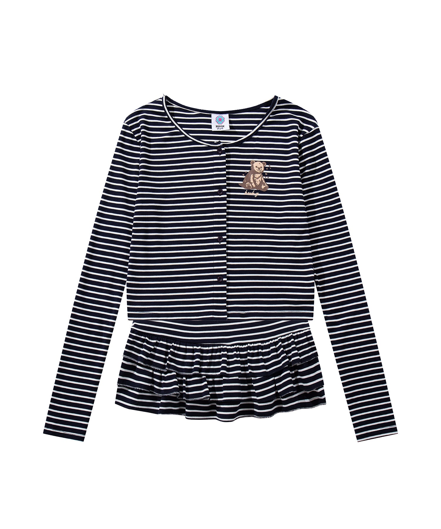 胸元ワンポイントのベアプリントが可愛いボーダーアンサンブル。