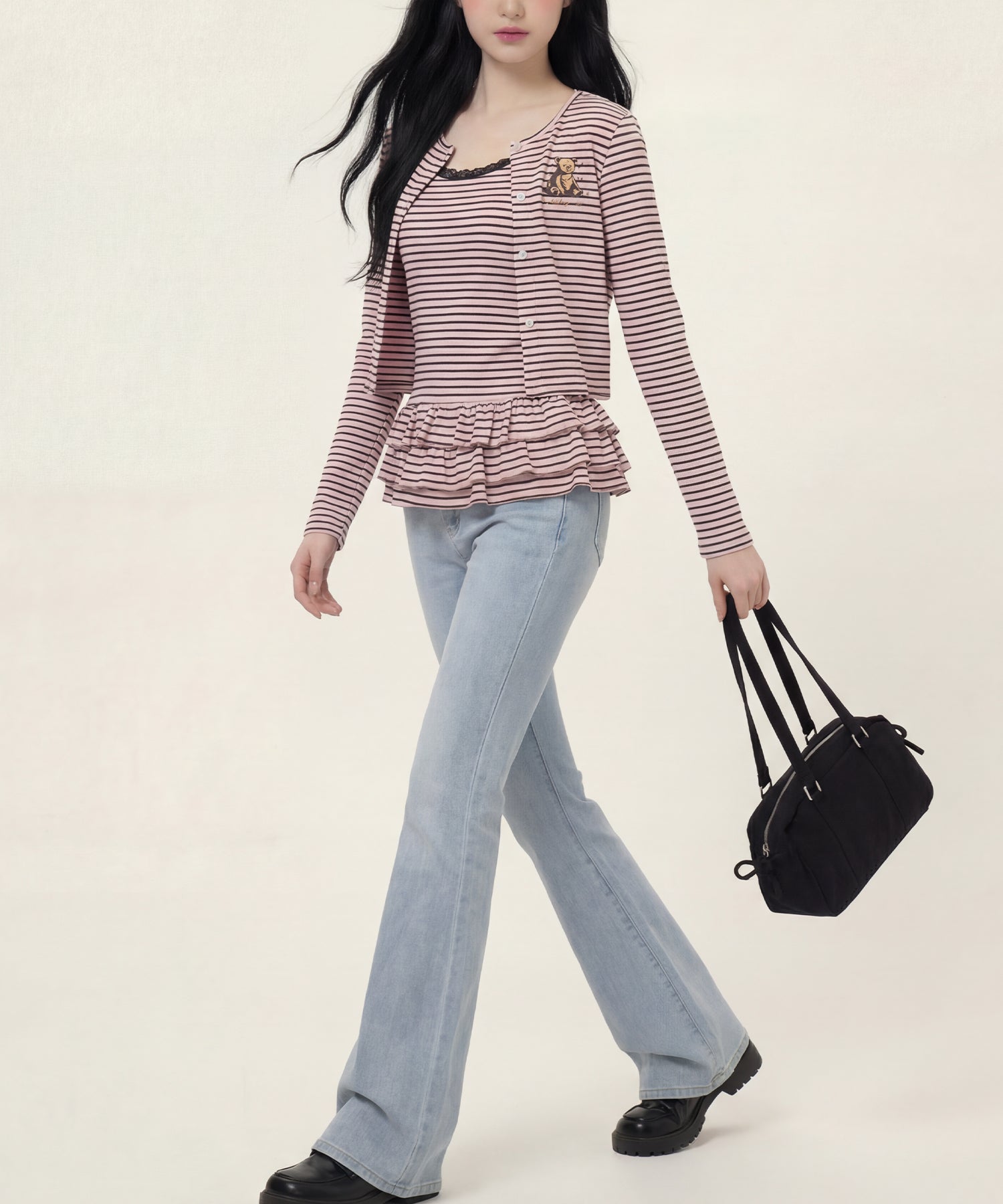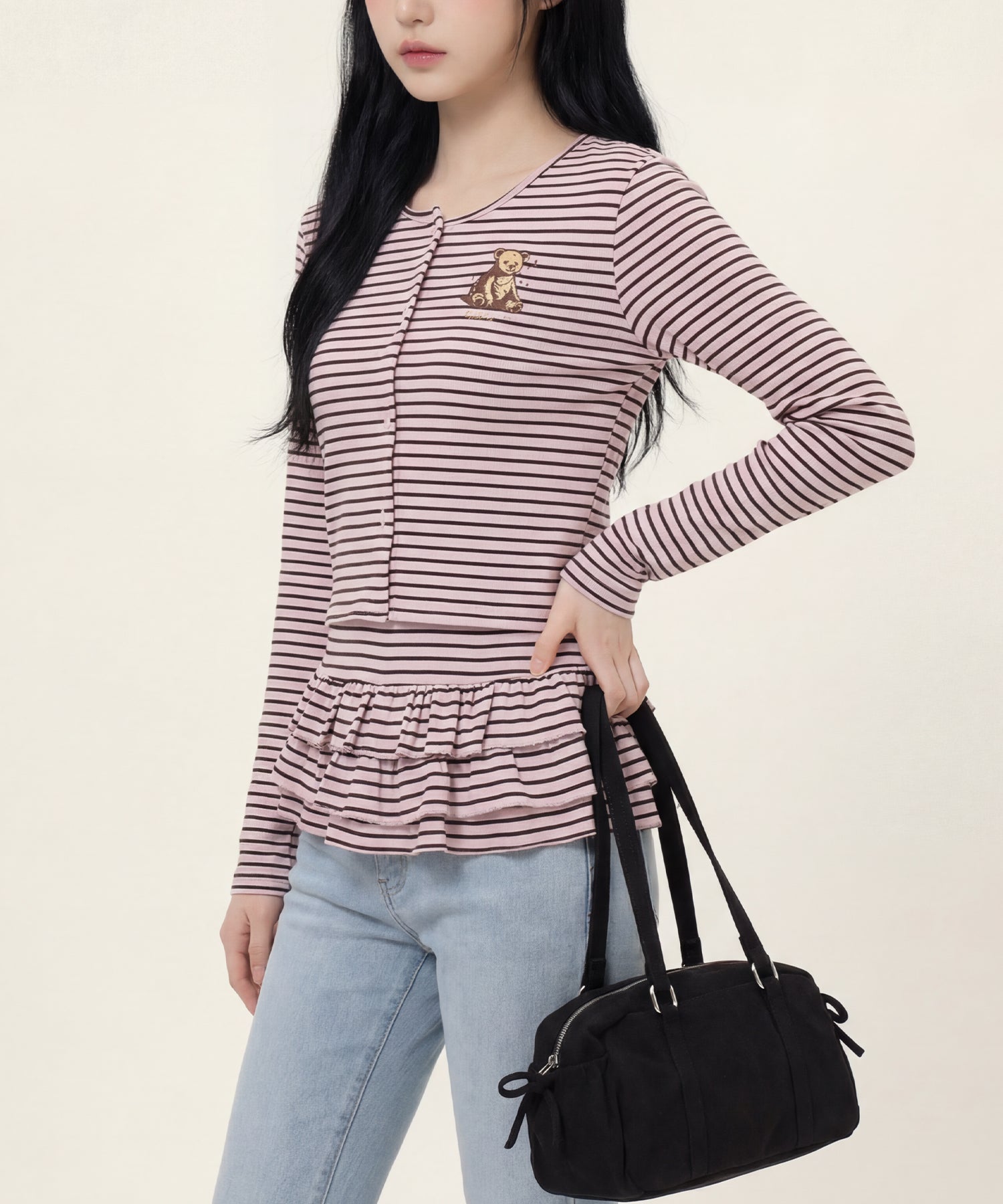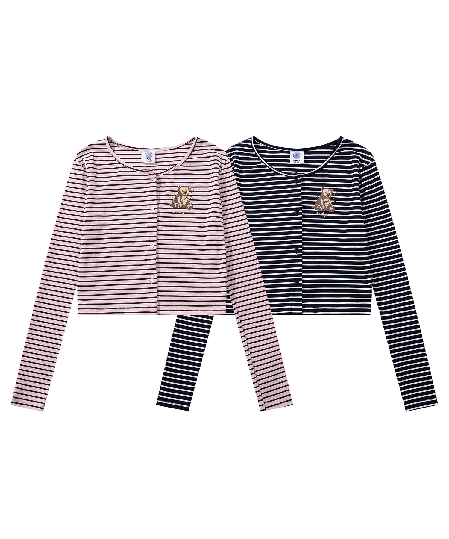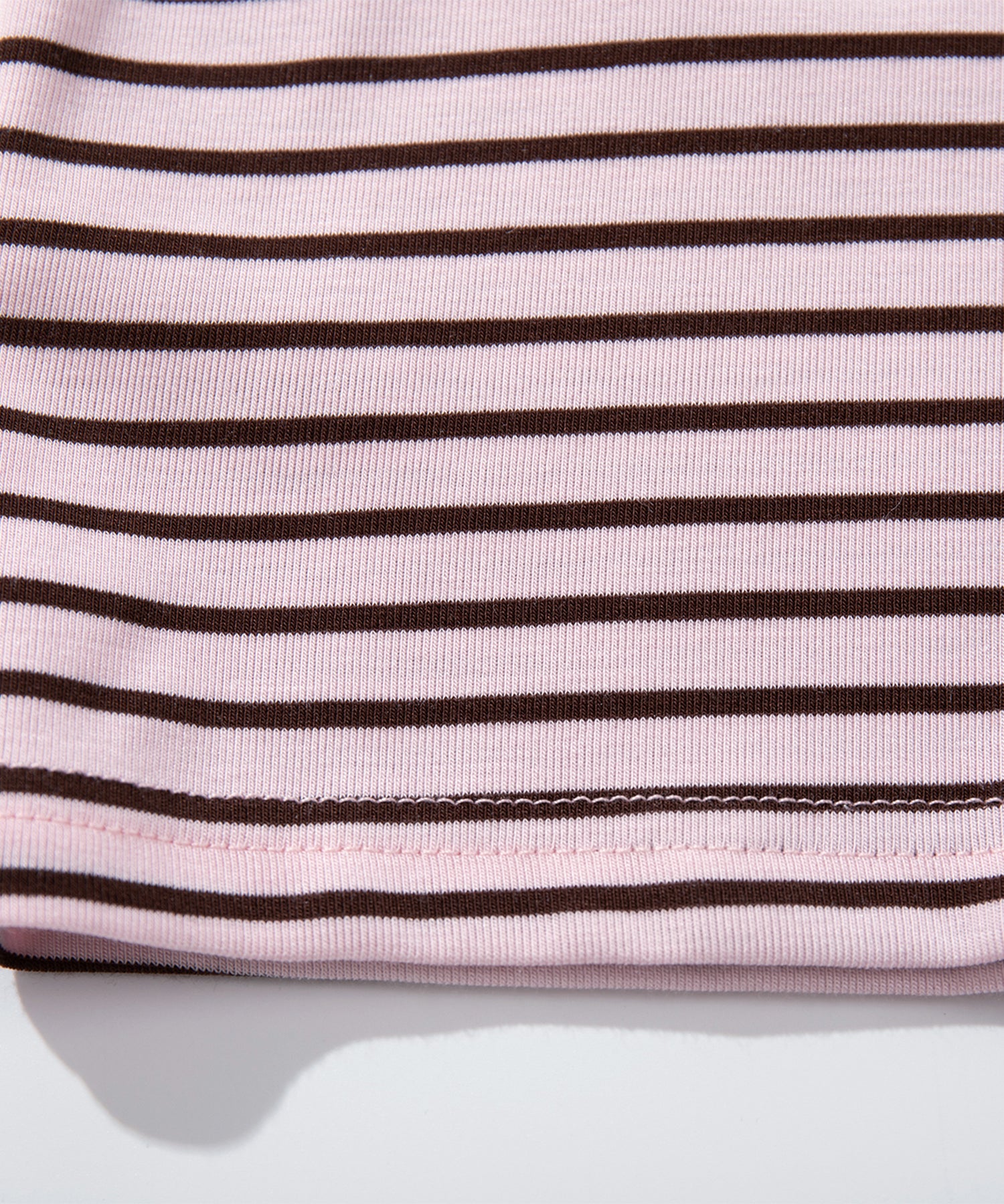 胸元ワンポイントのベアプリントが可愛いボーダーアンサンブル。