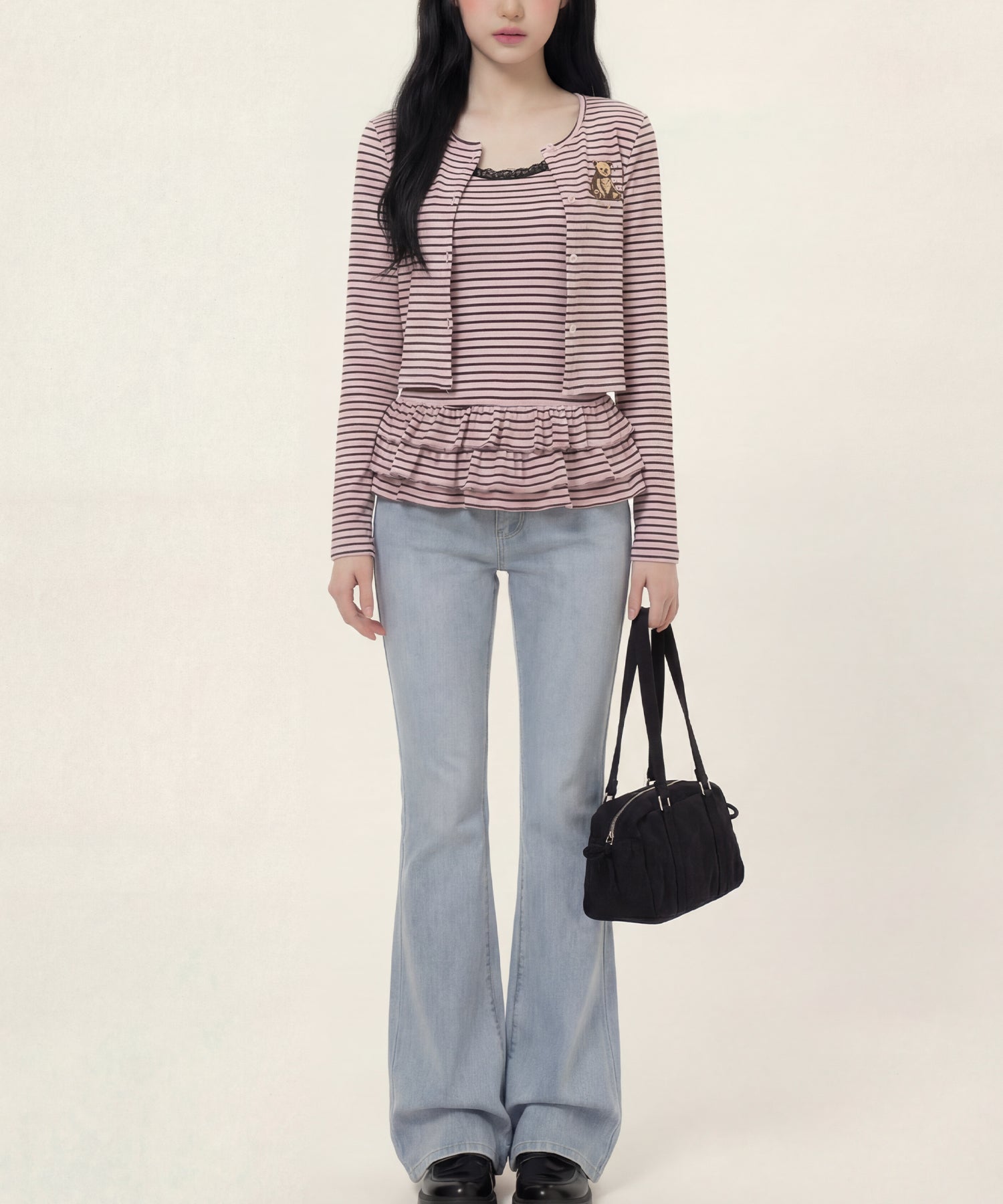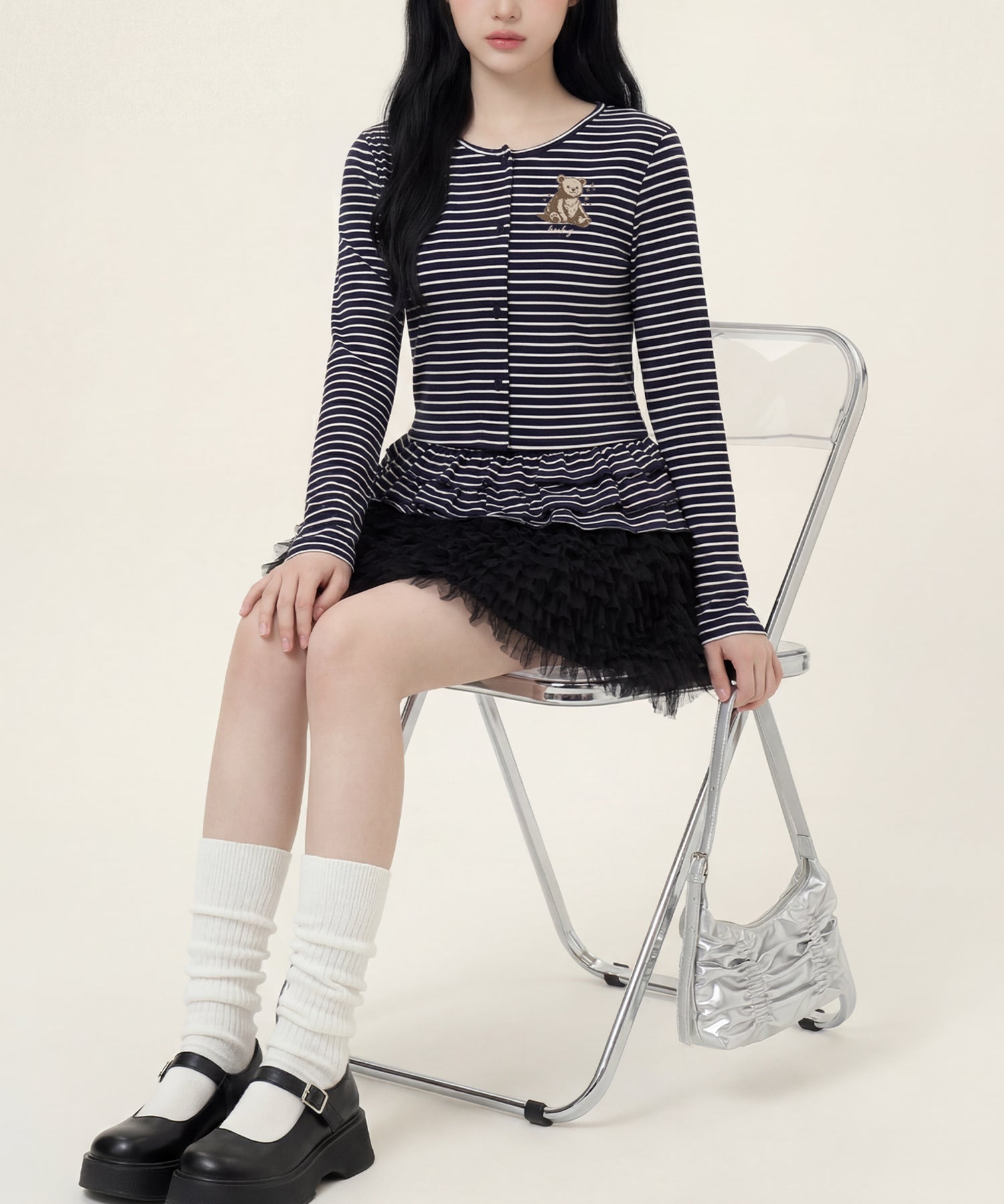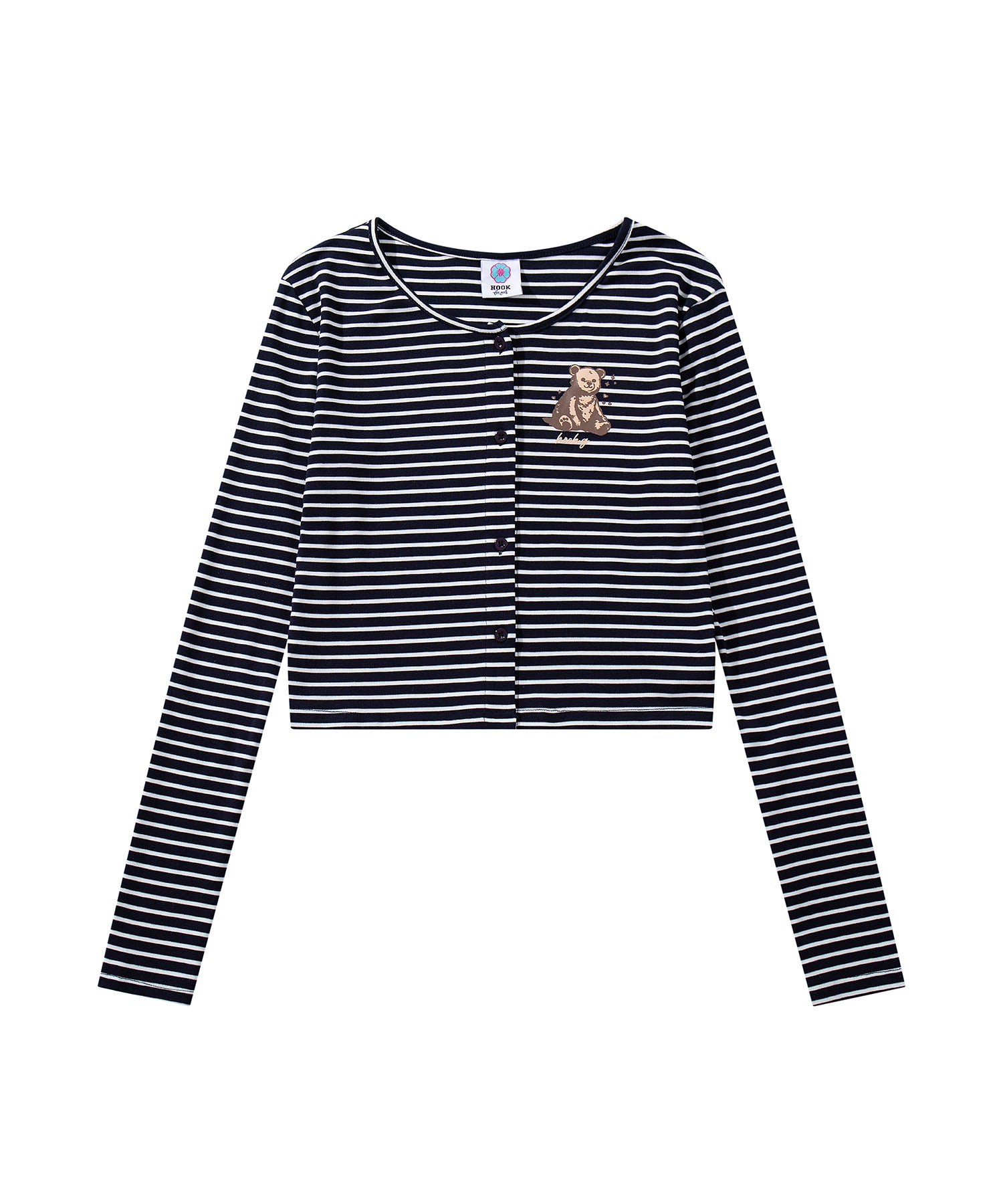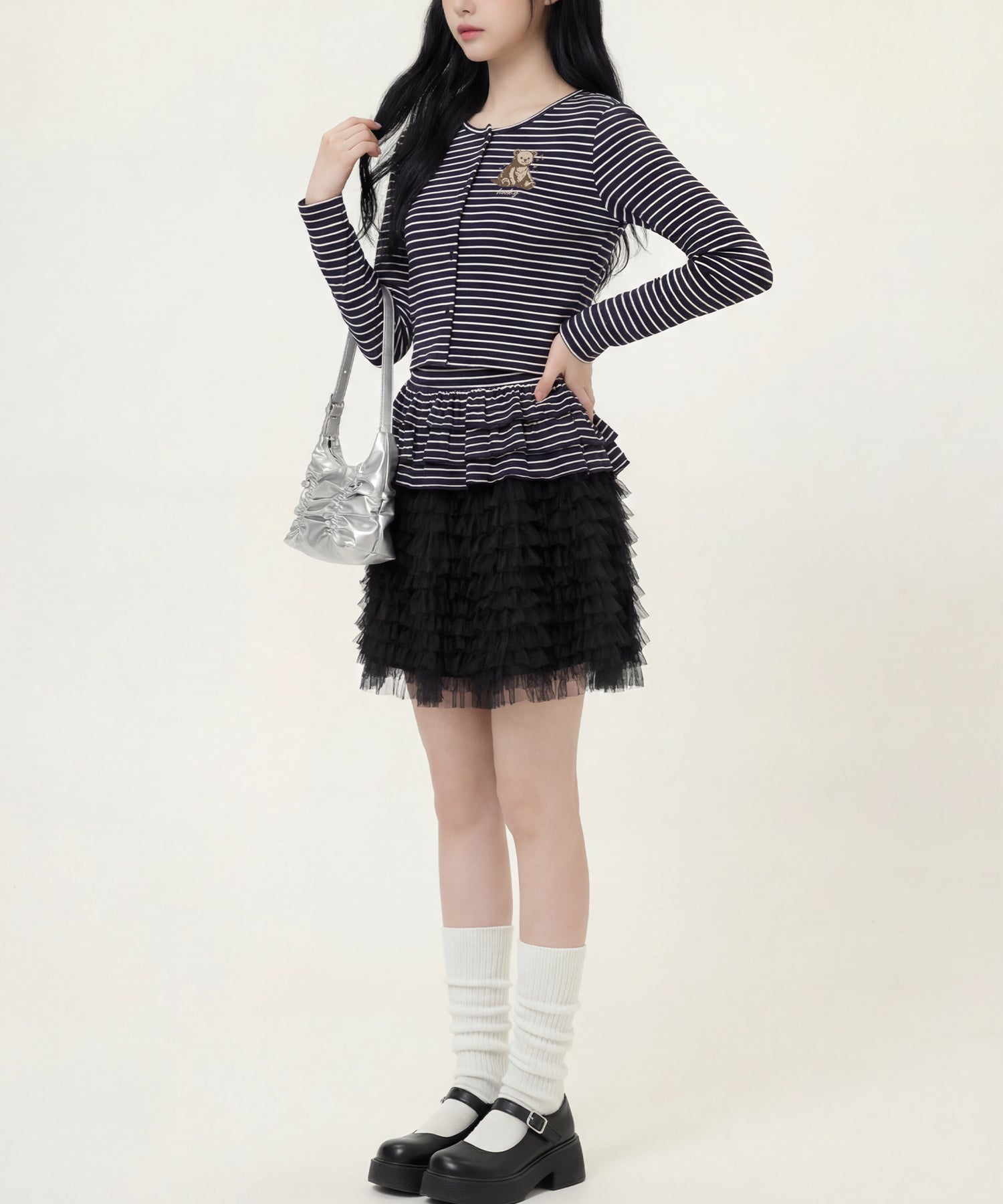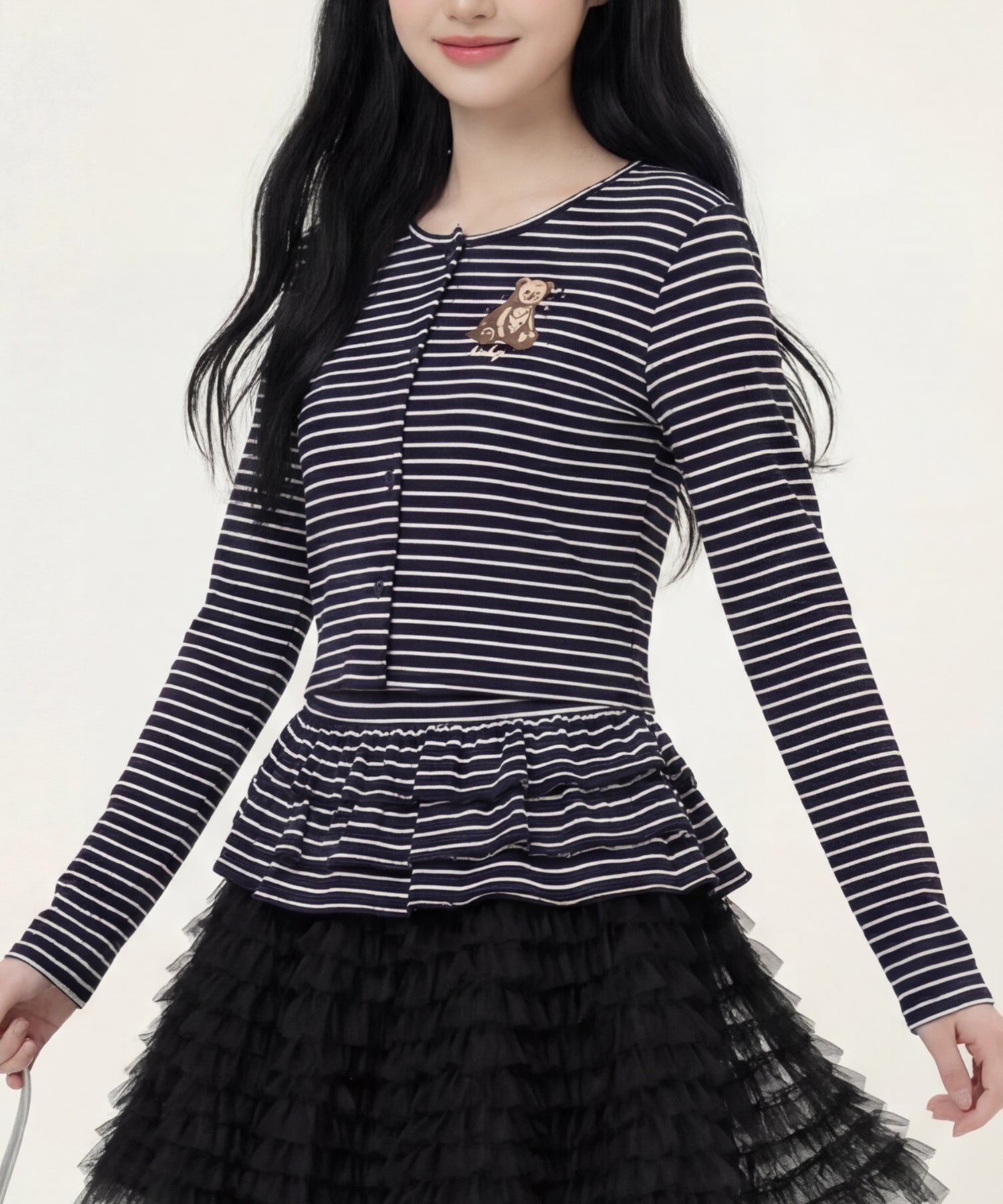胸元ワンポイントのベアプリントが可愛いボーダーアンサンブル。