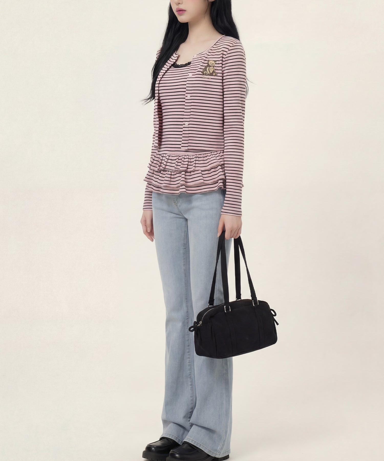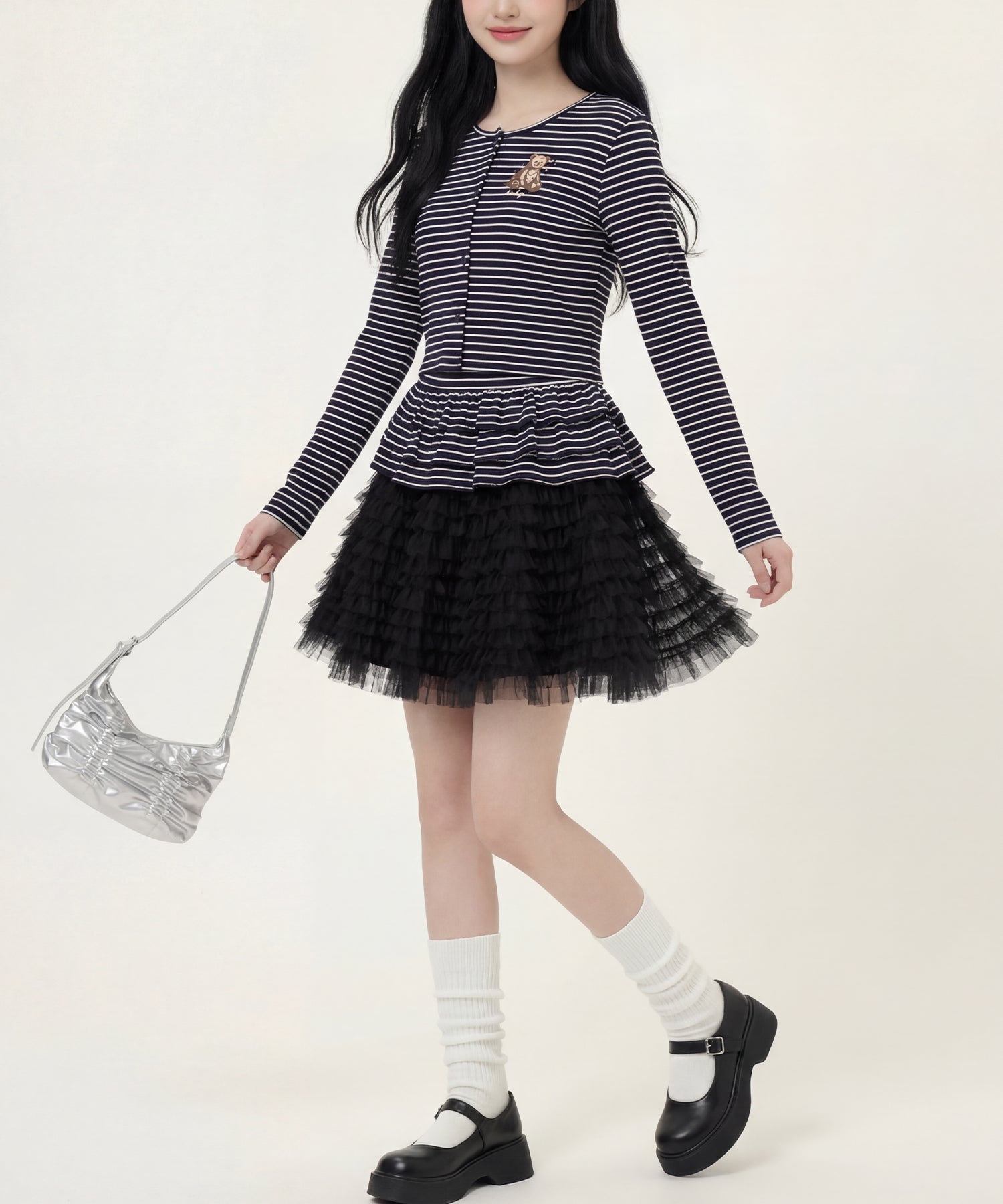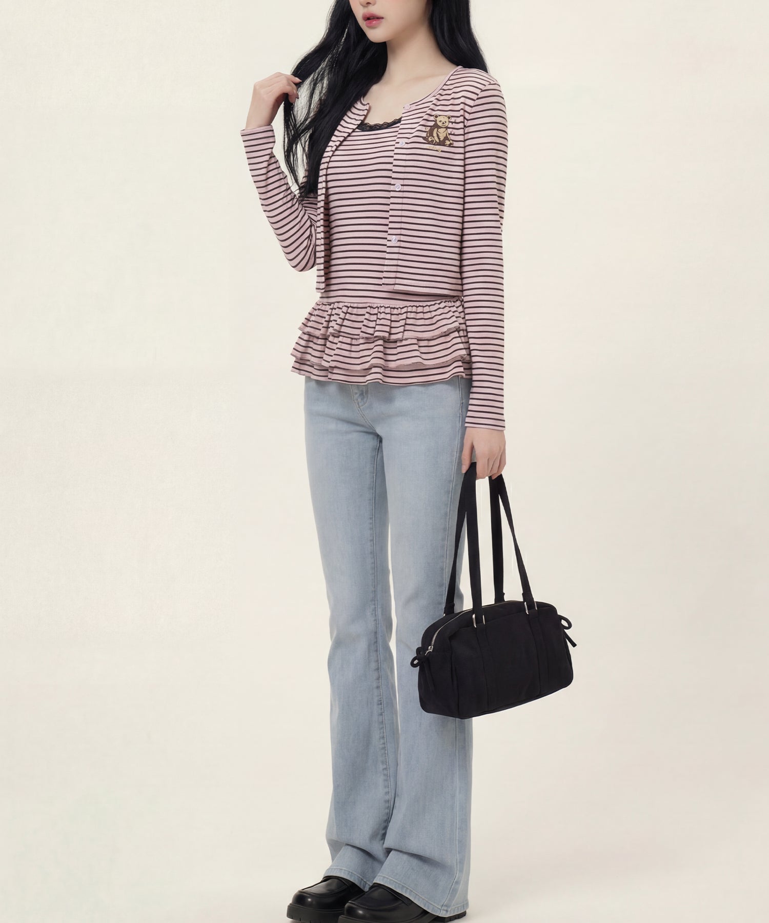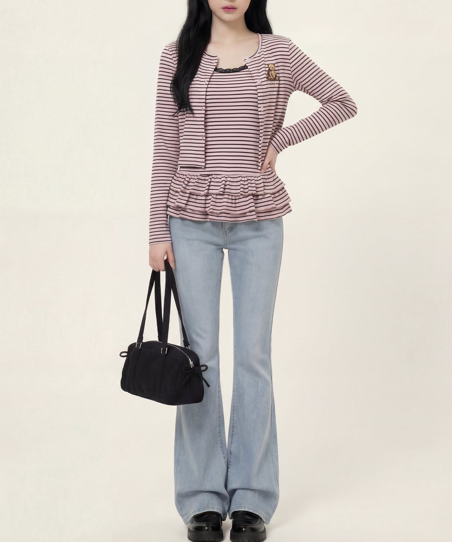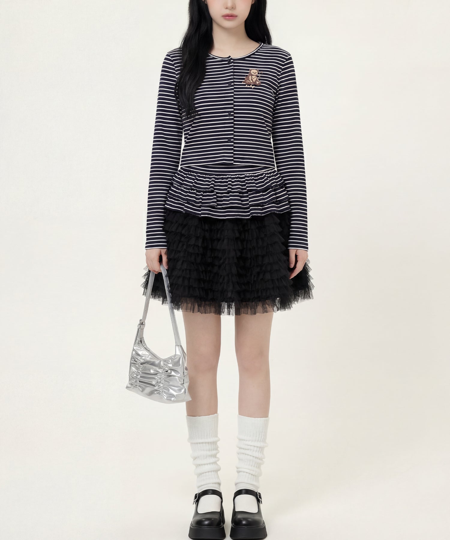 胸元ワンポイントのベアプリントが可愛いボーダーアンサンブル。