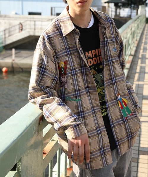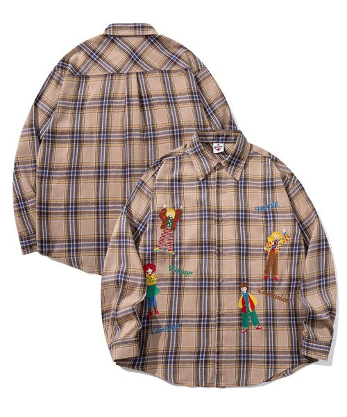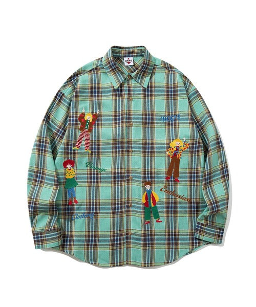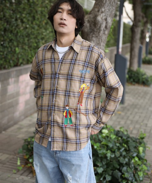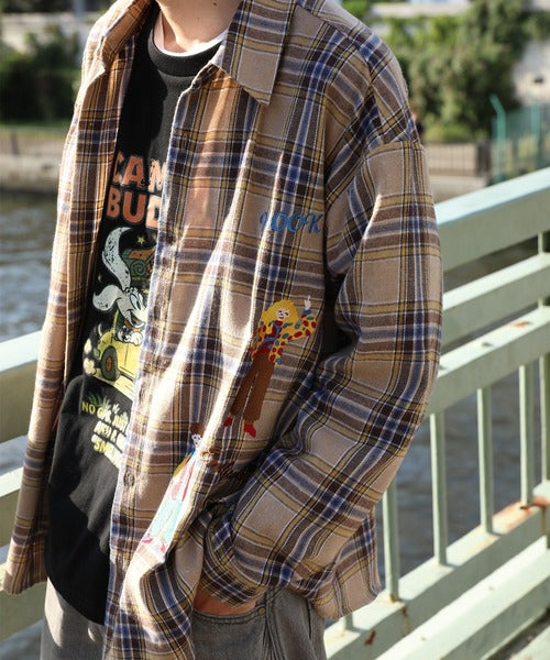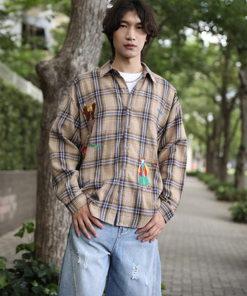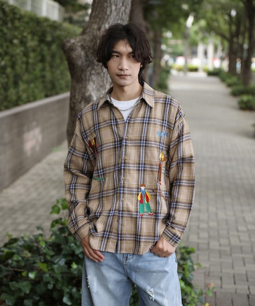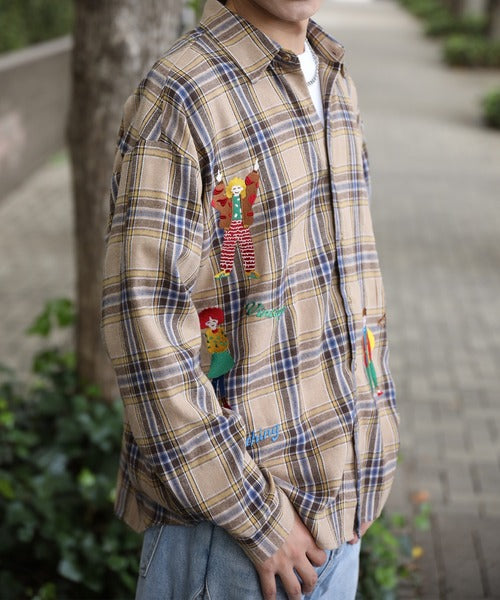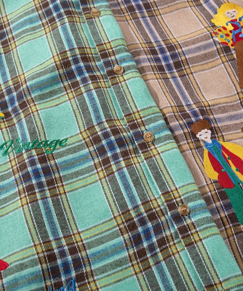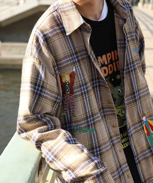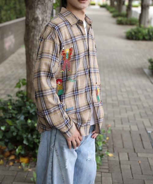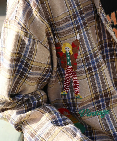 ヴィンテージ感漂うチェック柄に、ポップで遊び心のあるキャラクター刺繍をあしらったレトロ古着風シャツ。胸元や身頃に施された刺繍は、それぞれが個性的なスタイルを表現しており、古着屋で見つけたようなユニークな存在感を放ちます。
