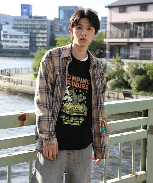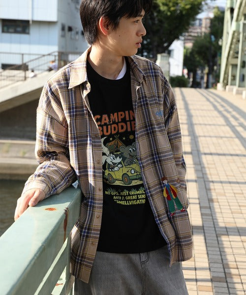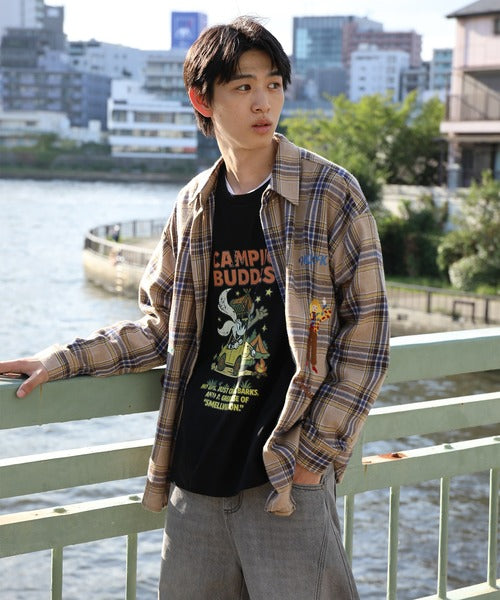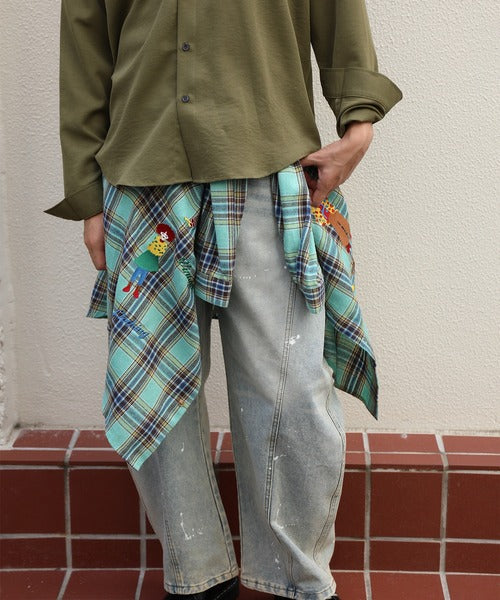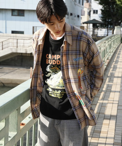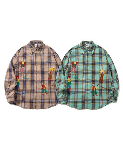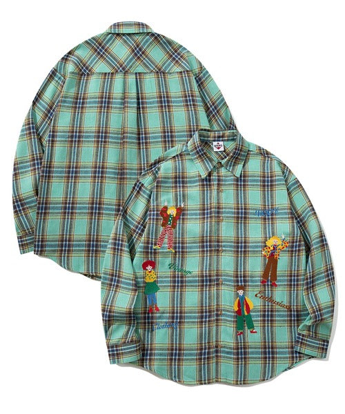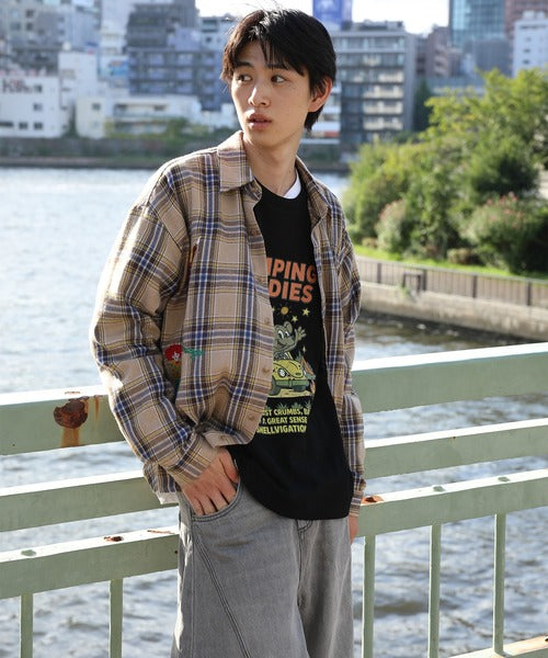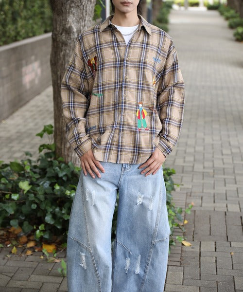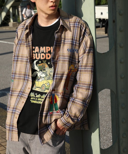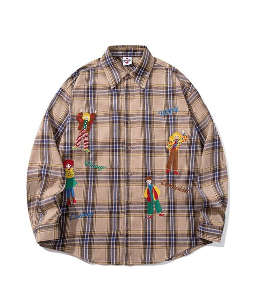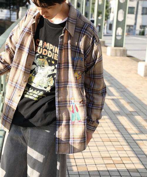 ヴィンテージ感漂うチェック柄に、ポップで遊び心のあるキャラクター刺繍をあしらったレトロ古着風シャツ。胸元や身頃に施された刺繍は、それぞれが個性的なスタイルを表現しており、古着屋で見つけたようなユニークな存在感を放ちます。