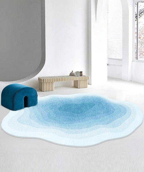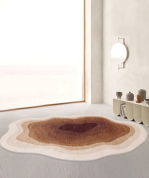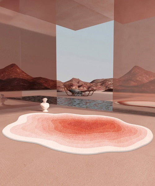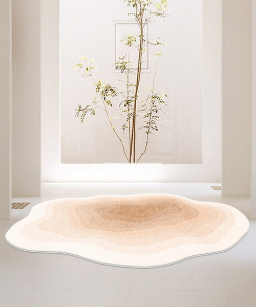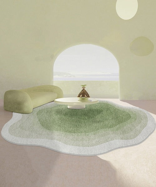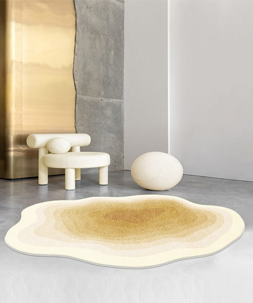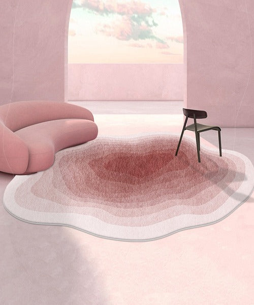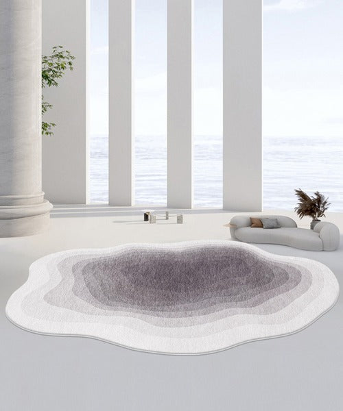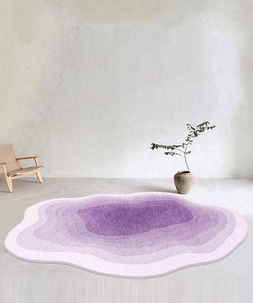 グラデーションカラーがランダムに配置されたデザインが特徴です。 色の変化が柔らかく、絶妙なグラデーションがお部屋に優しいアクセントを与えます。 独特な形状も特徴的であり、他のラグも一線を描く個性的なデザインです