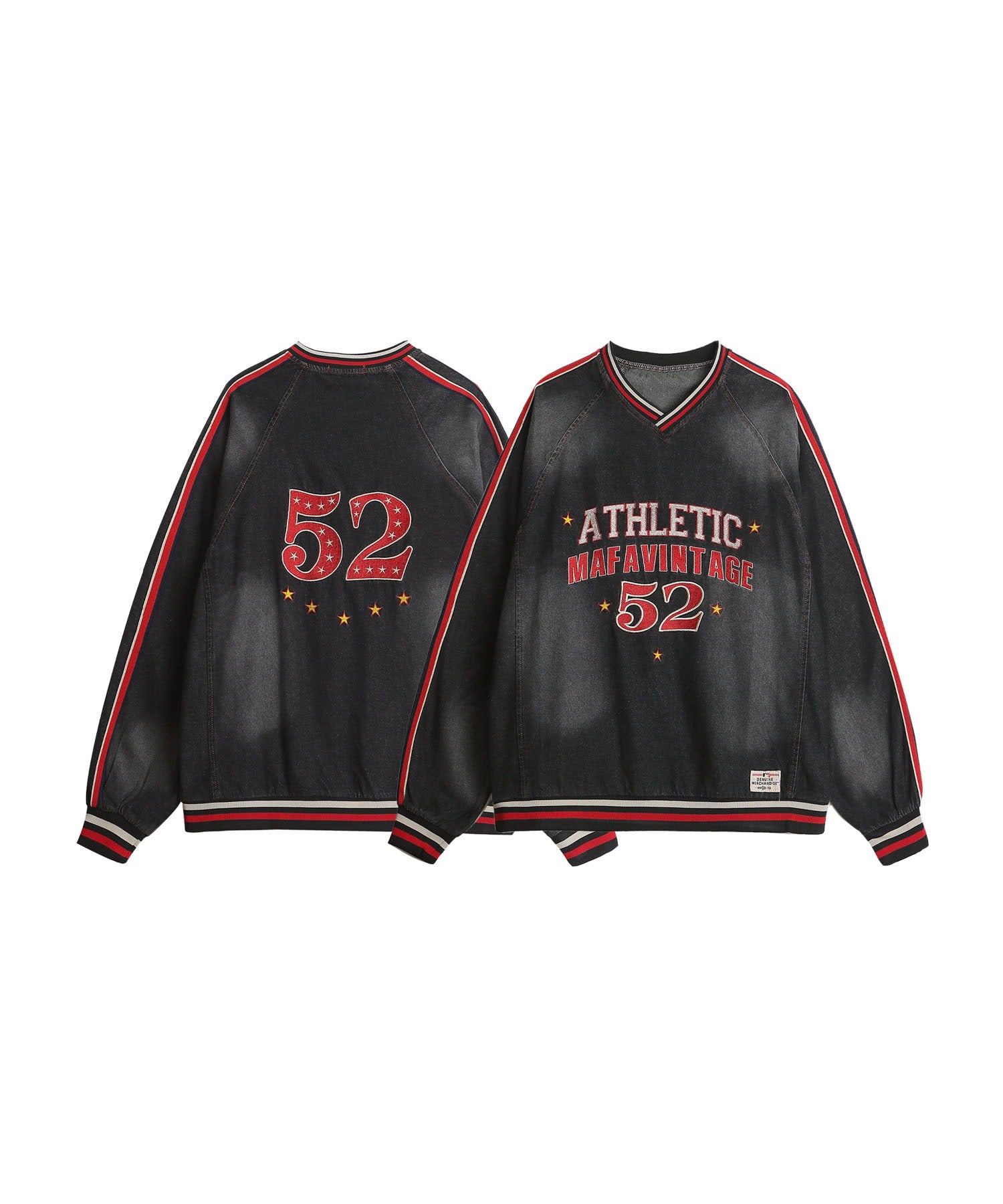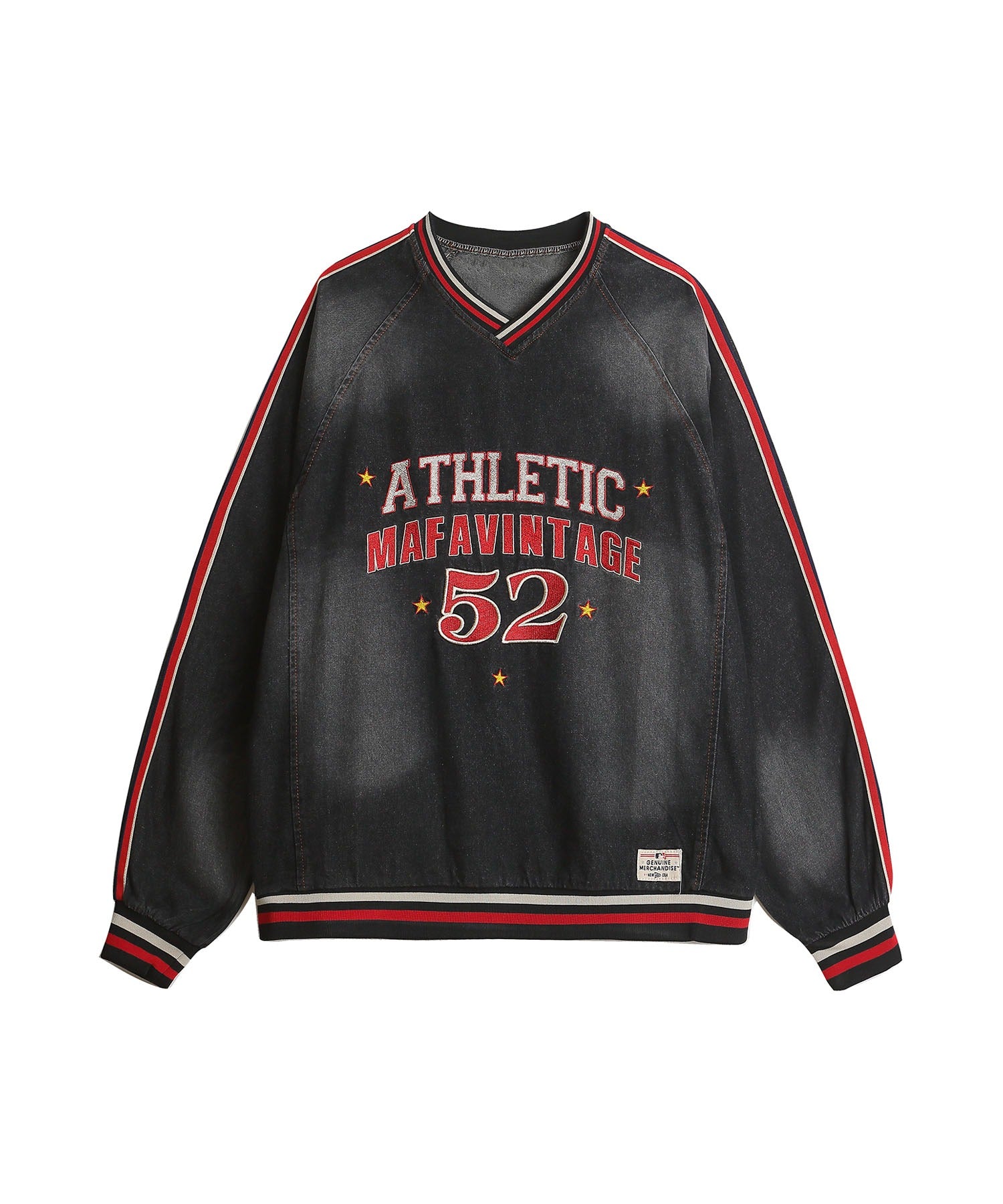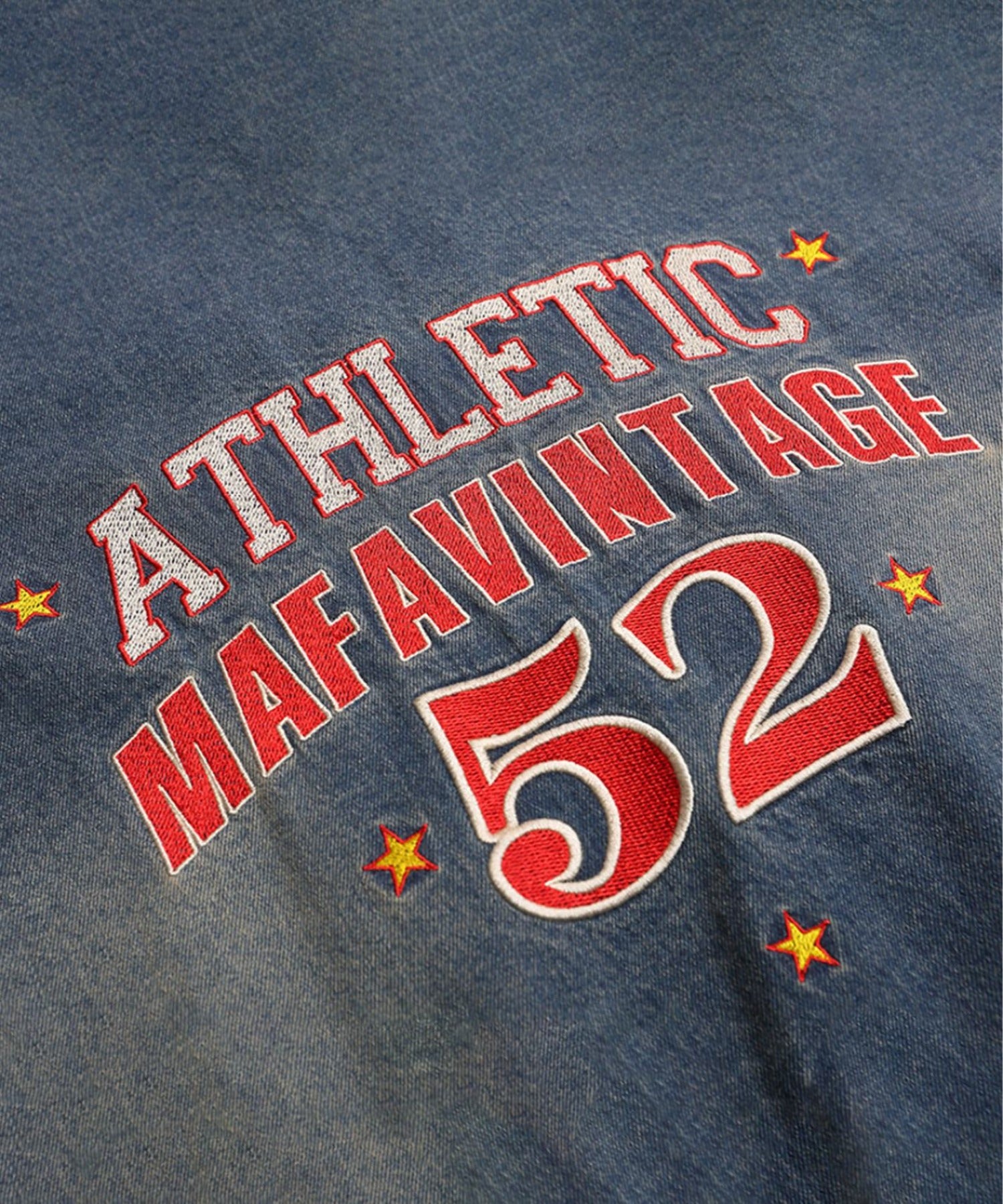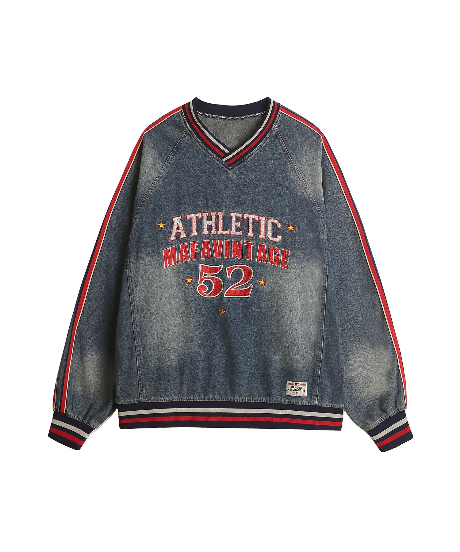 スポーティーなカレッジロゴを大胆にあしらった、レトロな古着風のデニムトレーナー。